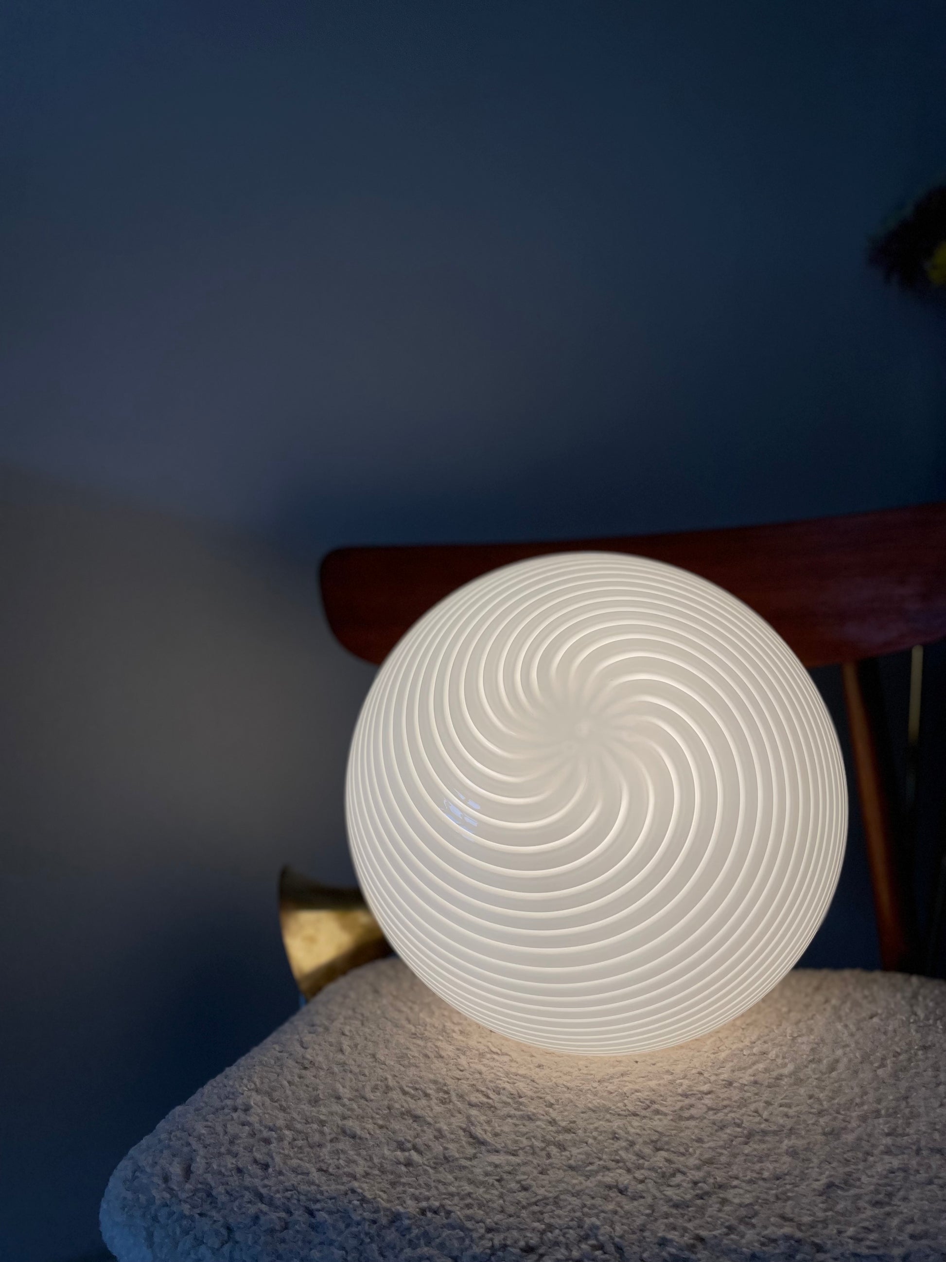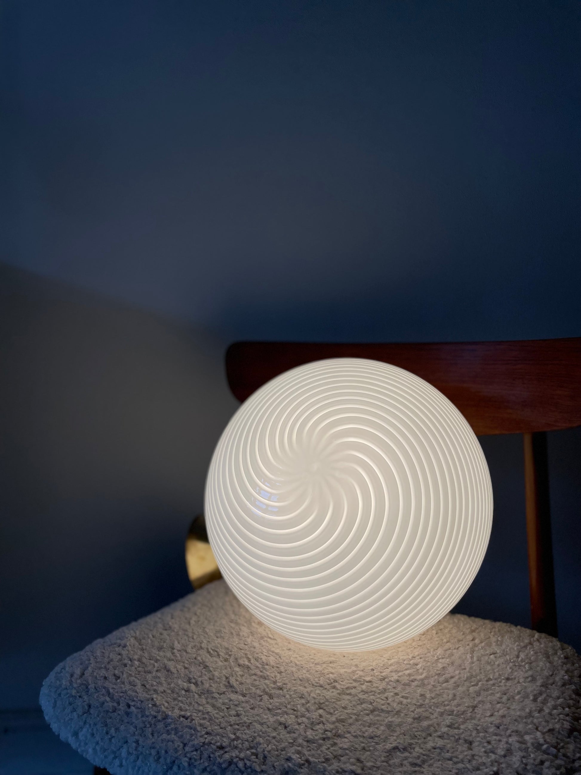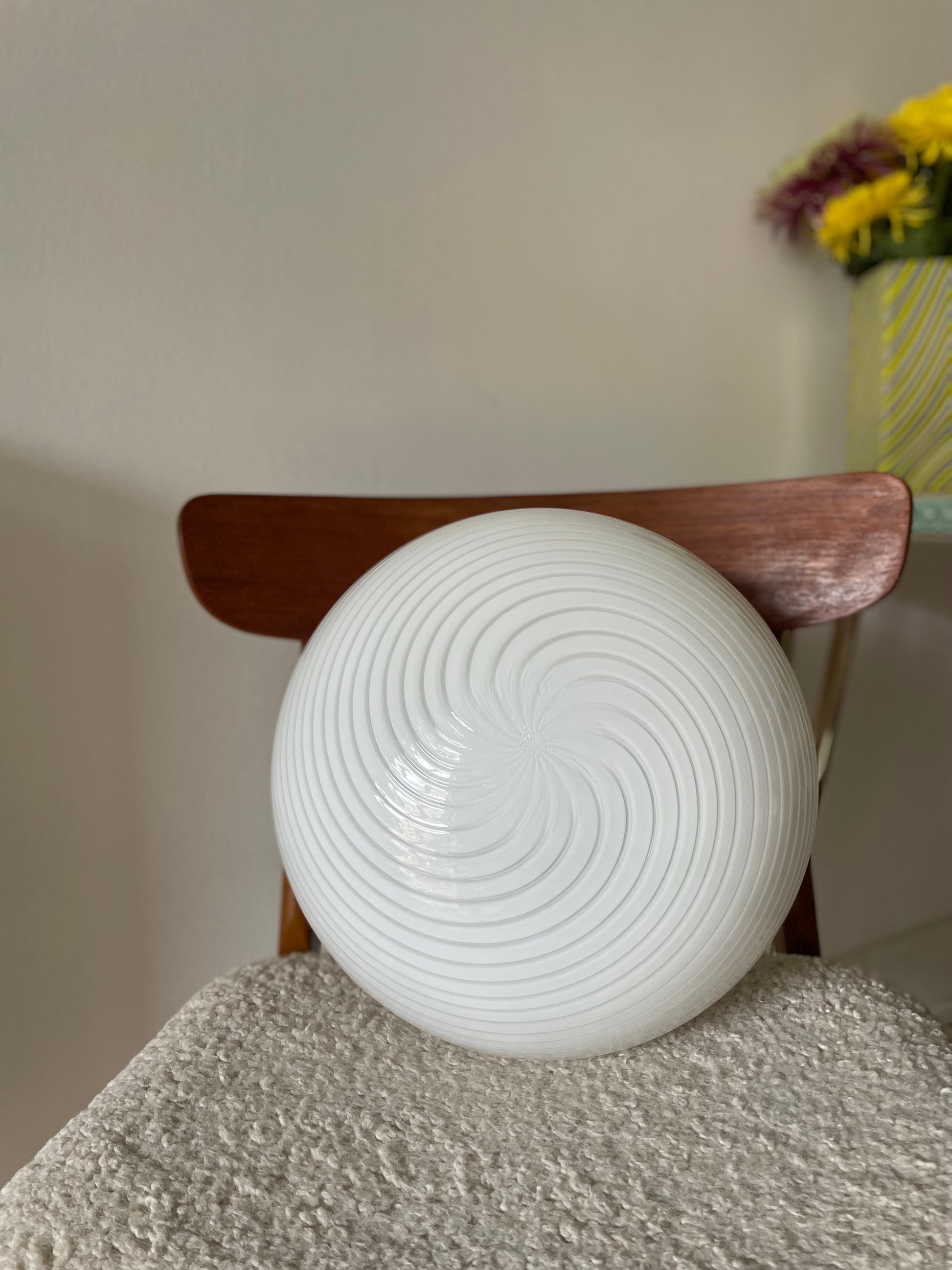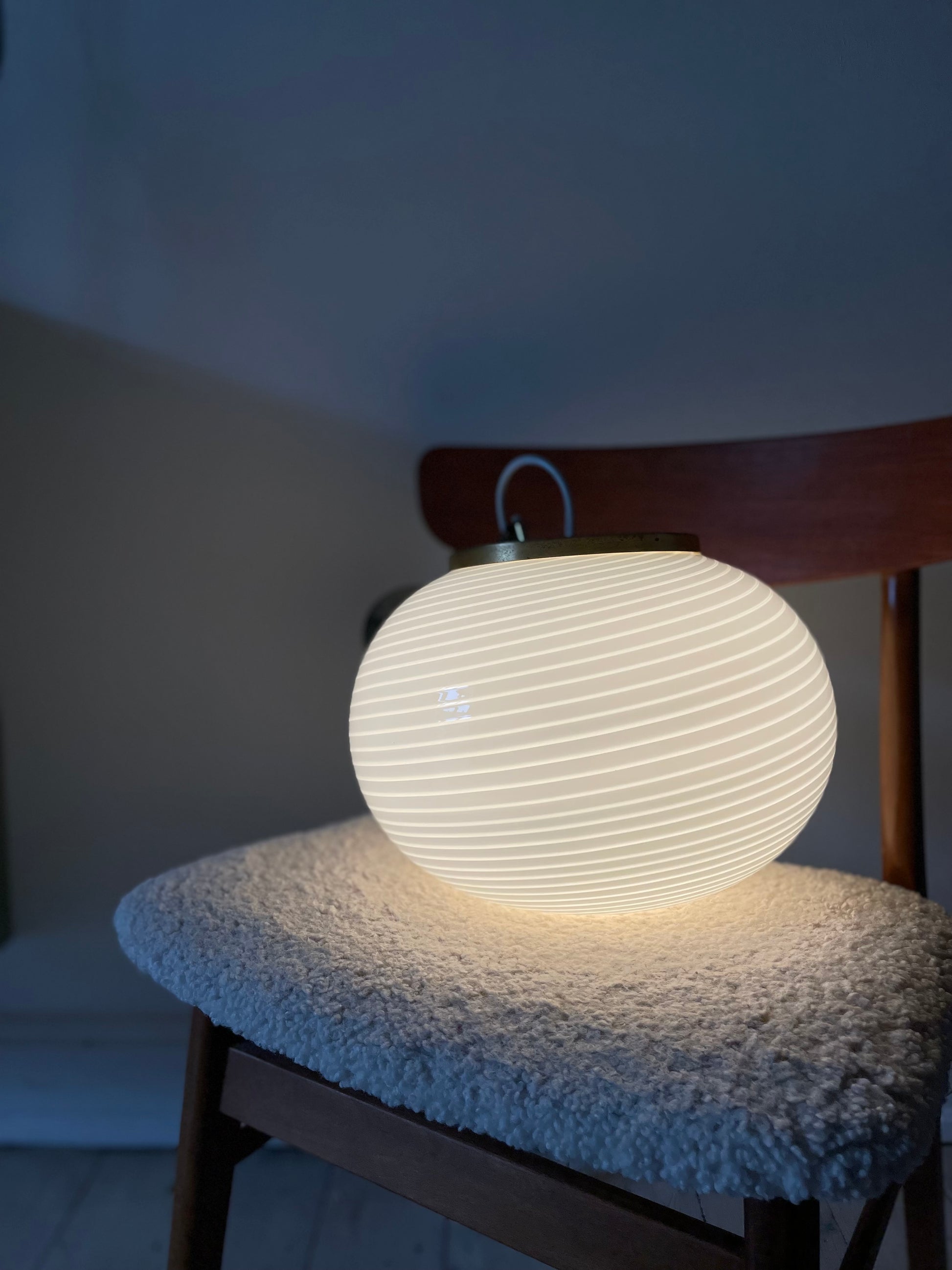 Den fineste lille pendel til børneværelset eller det lille hjørne. Lampen kommer i smukt udført hvidt glas med den fine swirl teknik. Den er oval og måler 35cm i bredden og 27cm i højden. Den kommer desuden med messing ophæng.