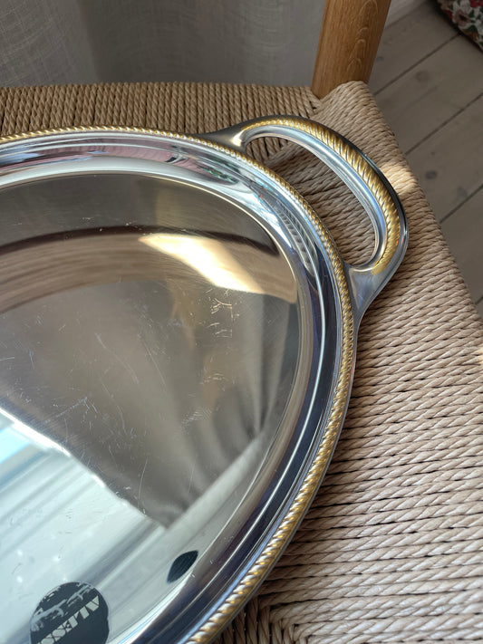 Large steel dish with gold handles and engraved details
