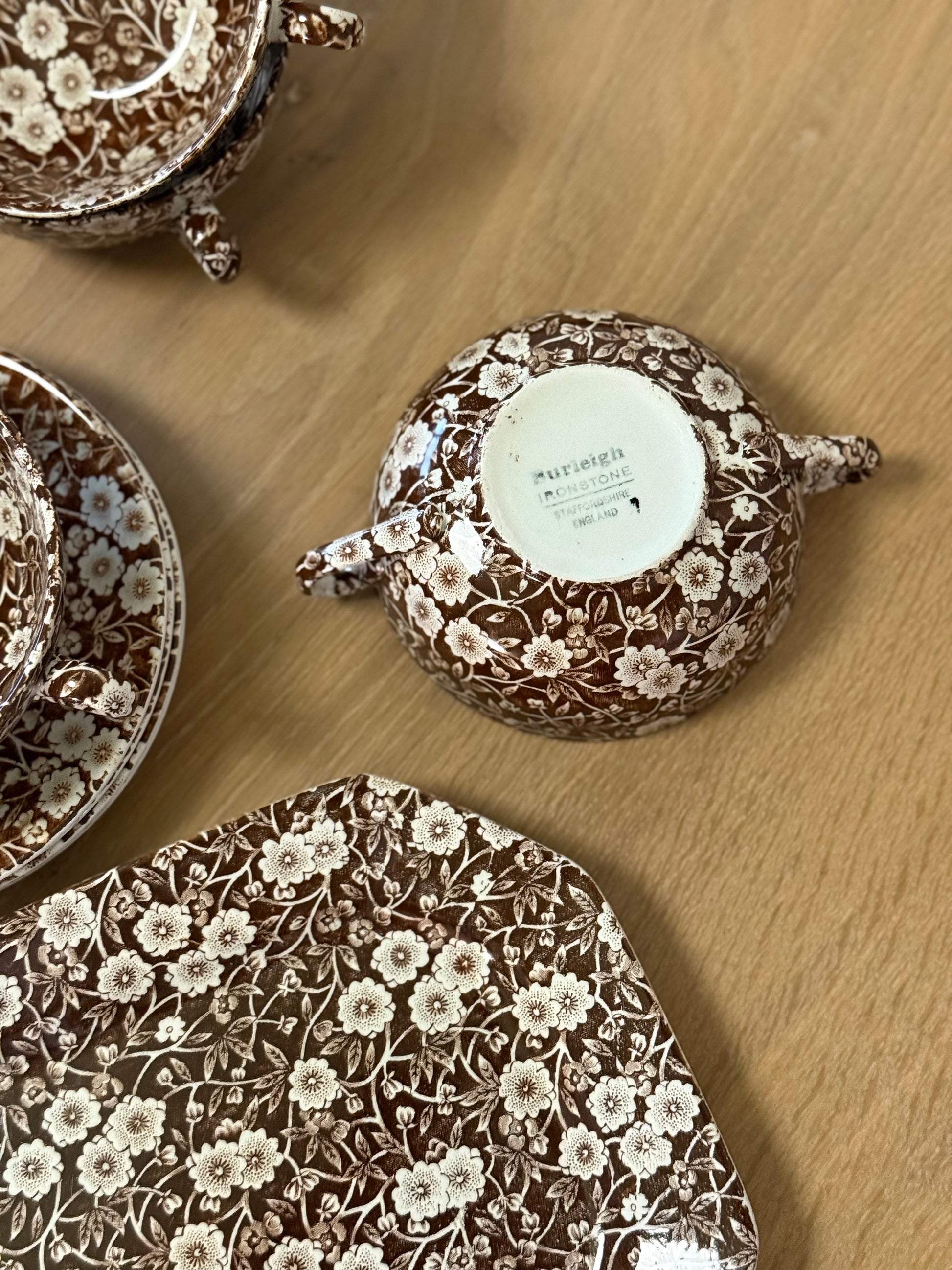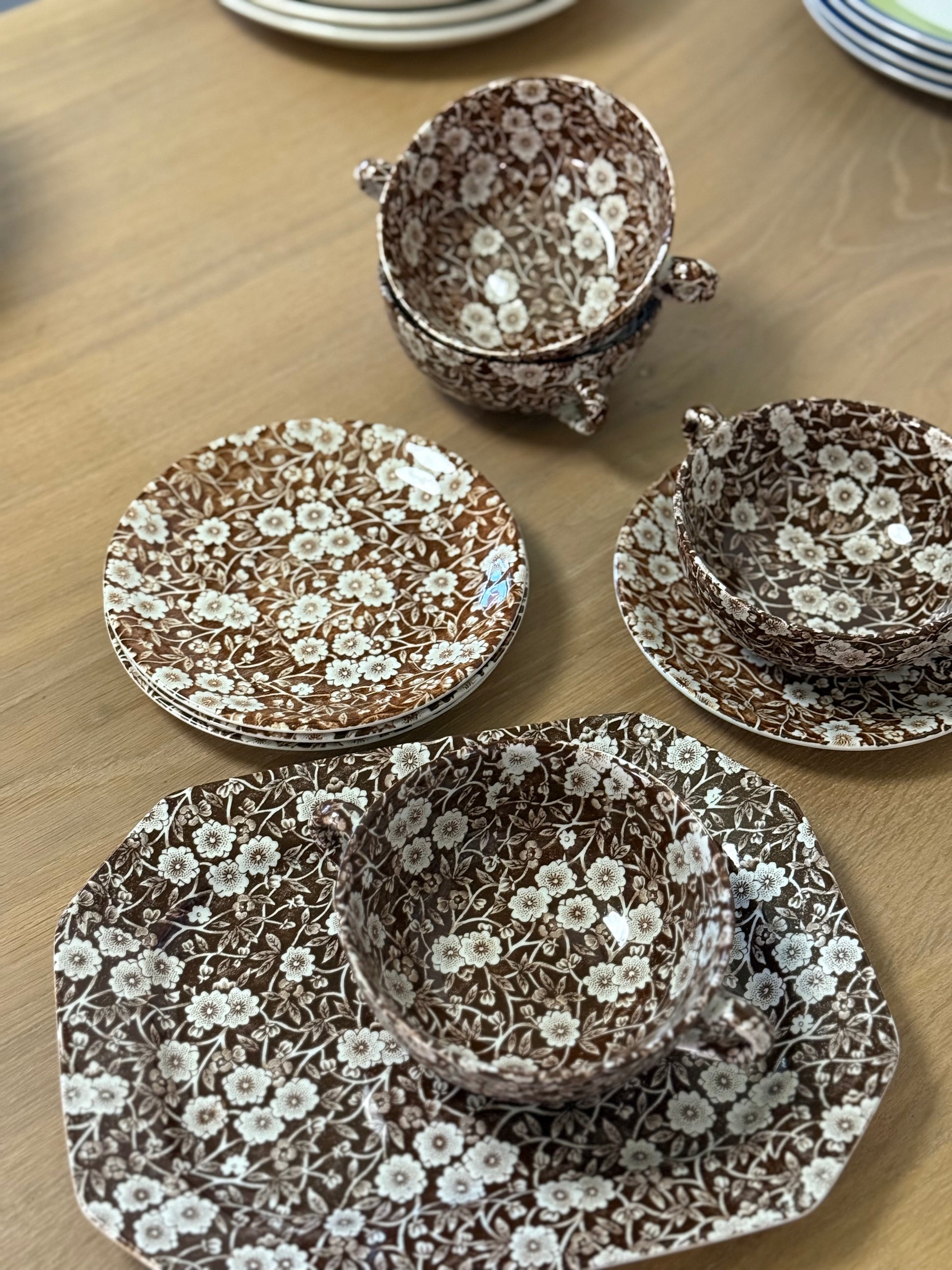 Virkelig cute sæt af engelsk porcelæn med 4 kopper og underkopper samt et fad. Kopperne kan både bruges til en god café latte eller til en varm skål suppe. På fadet kan du servere en kage eller brød til suppen. Super pæn vintage stand. Fadet måler 25,5*19,5cm. Hver kop indeholder lige under 4dl.