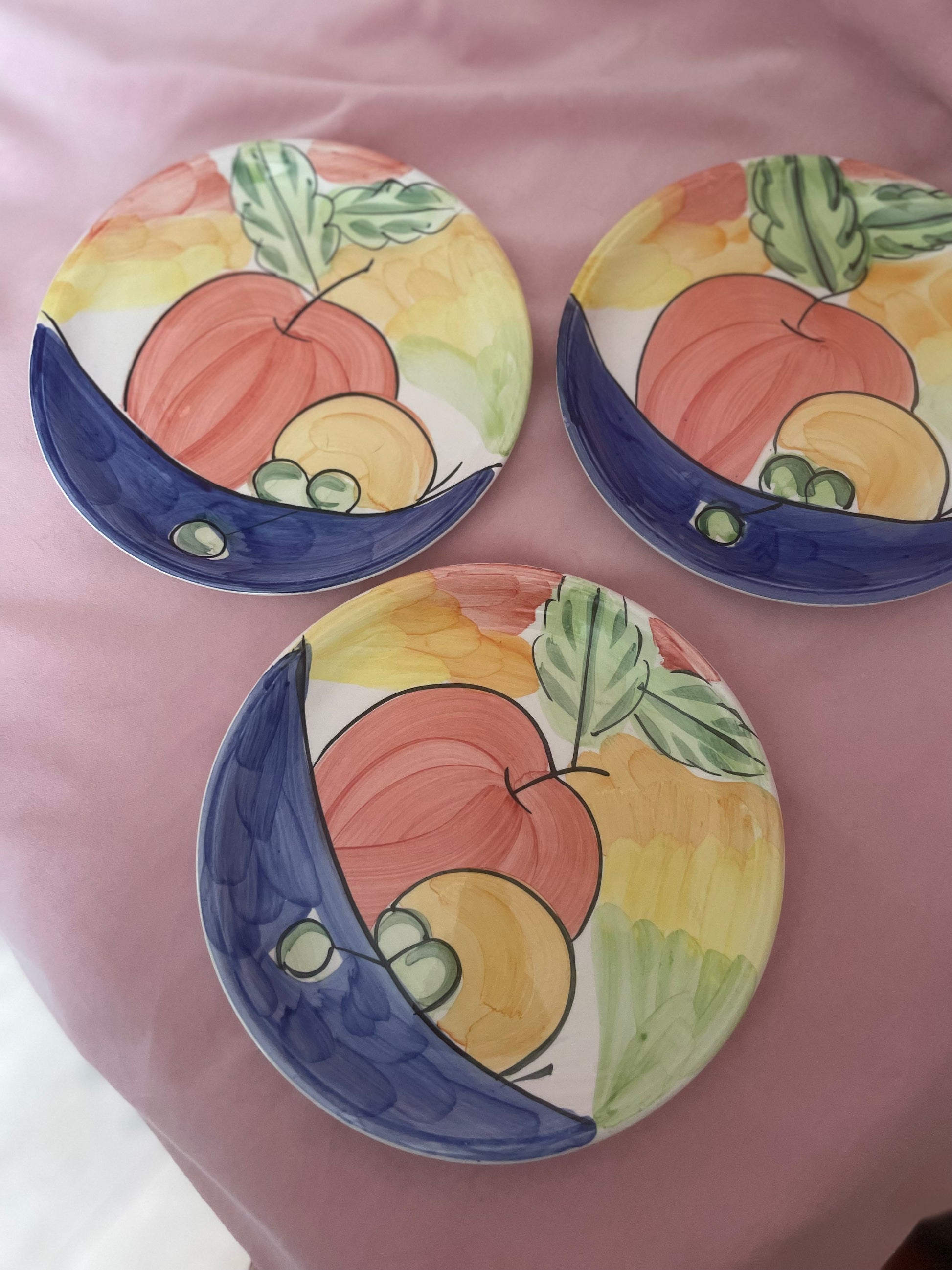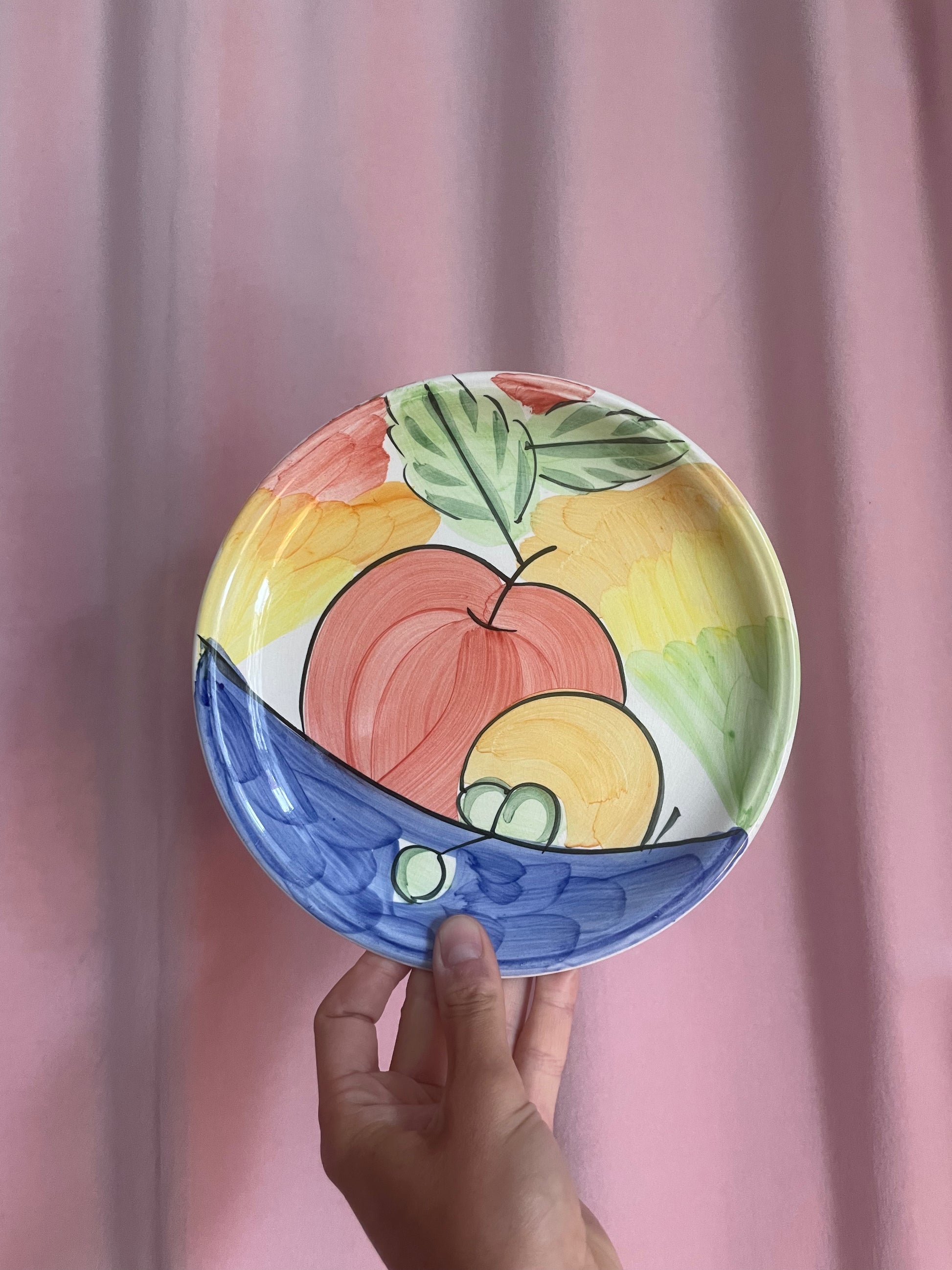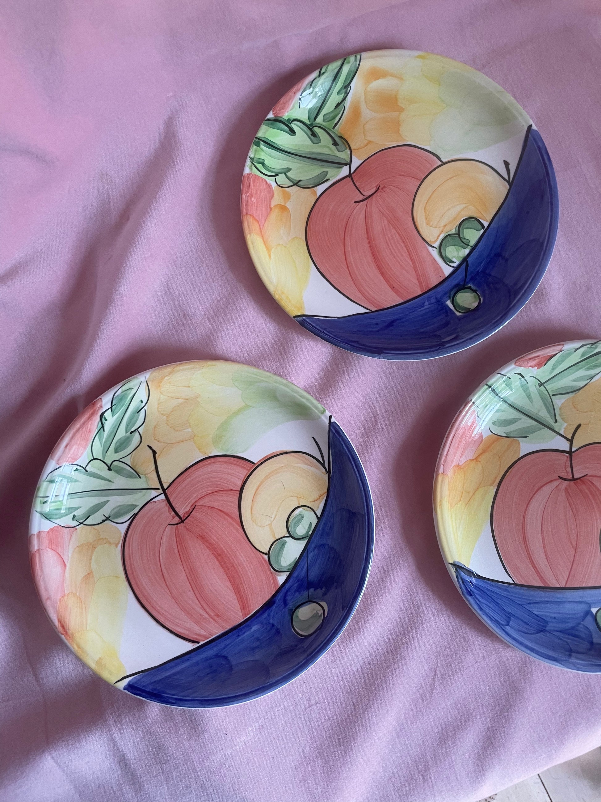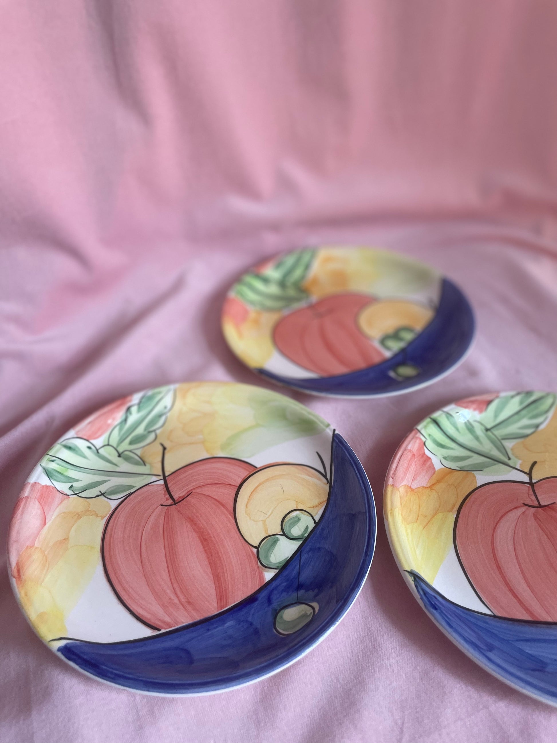 Beautiful hand painted fruit plates found in Italy. Each plate is slightly different in color as they are hand painted. All in good condition with minimal signs of use. 19cm in diameter and sold individually.