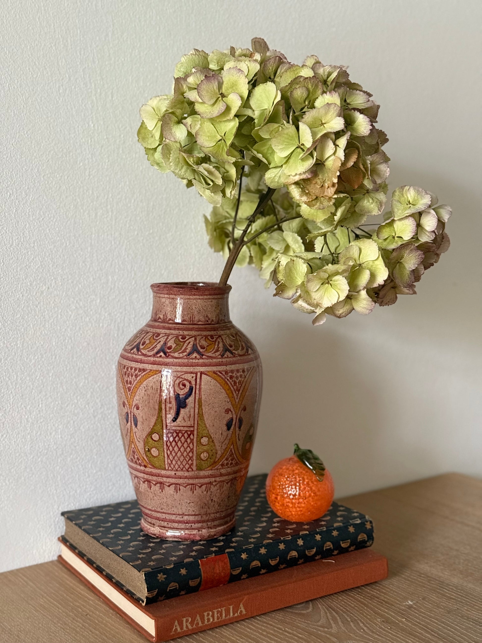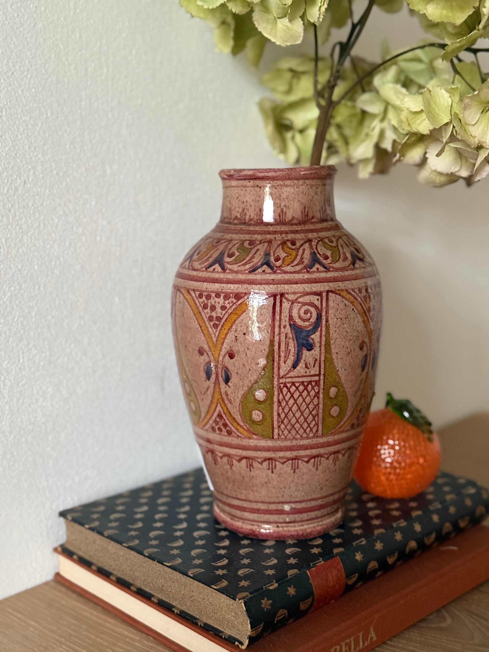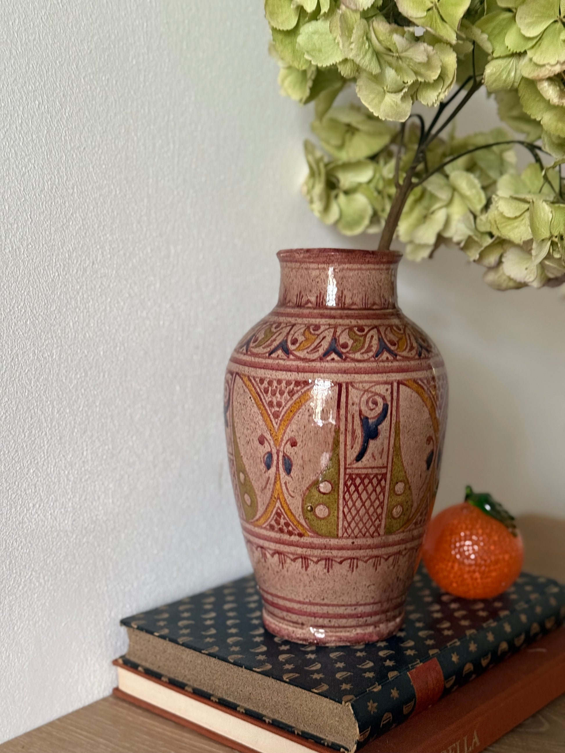 Abnormt smuk og kraftig lertøjsvase på 23cm. Vasen kommer i rosa nistret glasur med diverse aftegninger. Vasen er i smuk stand og en rigtig god størrelse til den gængse buket.