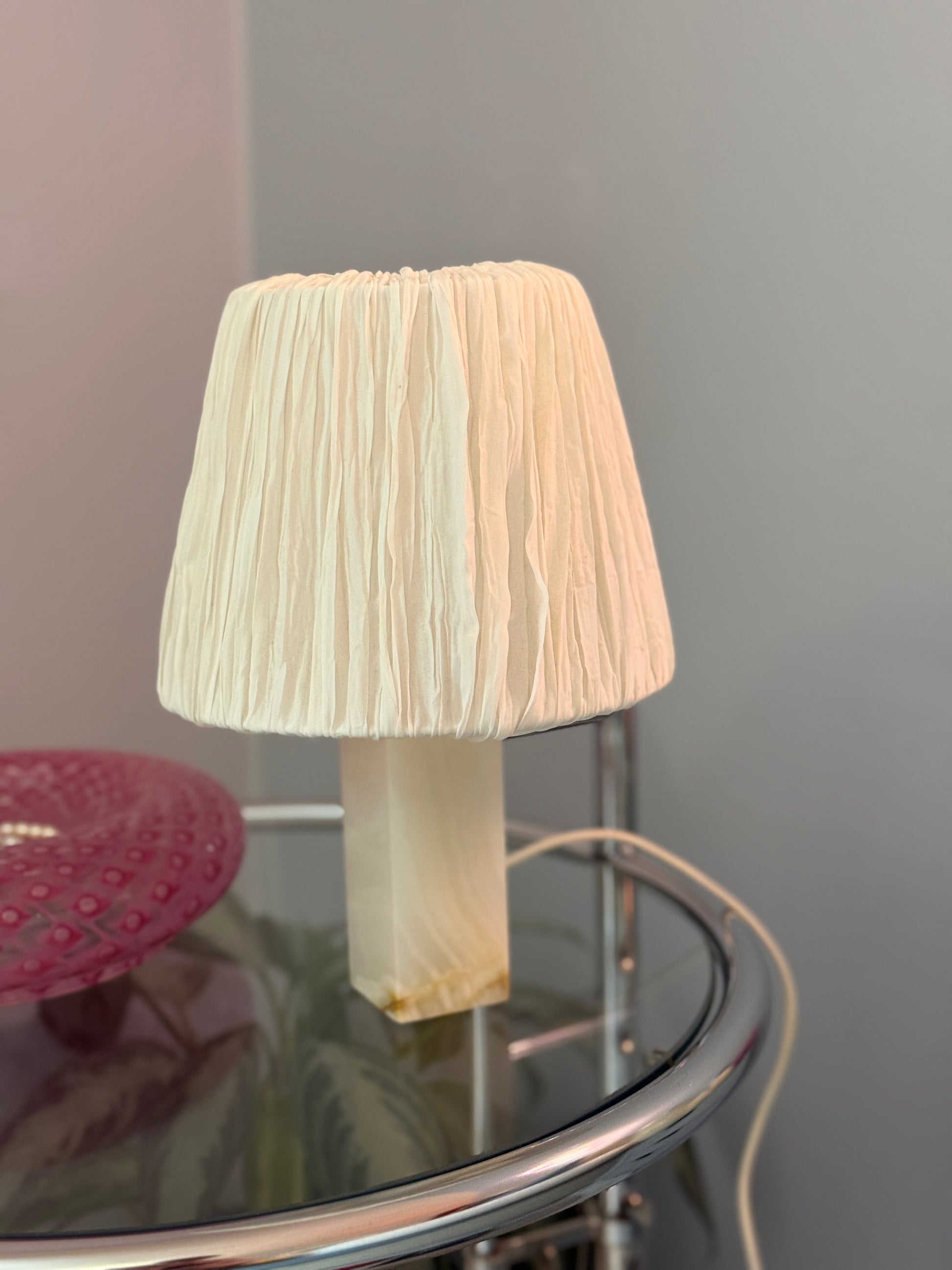 Smuk massiv lampe fod med hvid fatning i lys marmor. Bordlampen kommer med en hvid plisseret lampeskærm. Lampen måler 18,5cm i højden inklusiv fatning og 29cm i højden inklusiv skærm. Super fin stand!