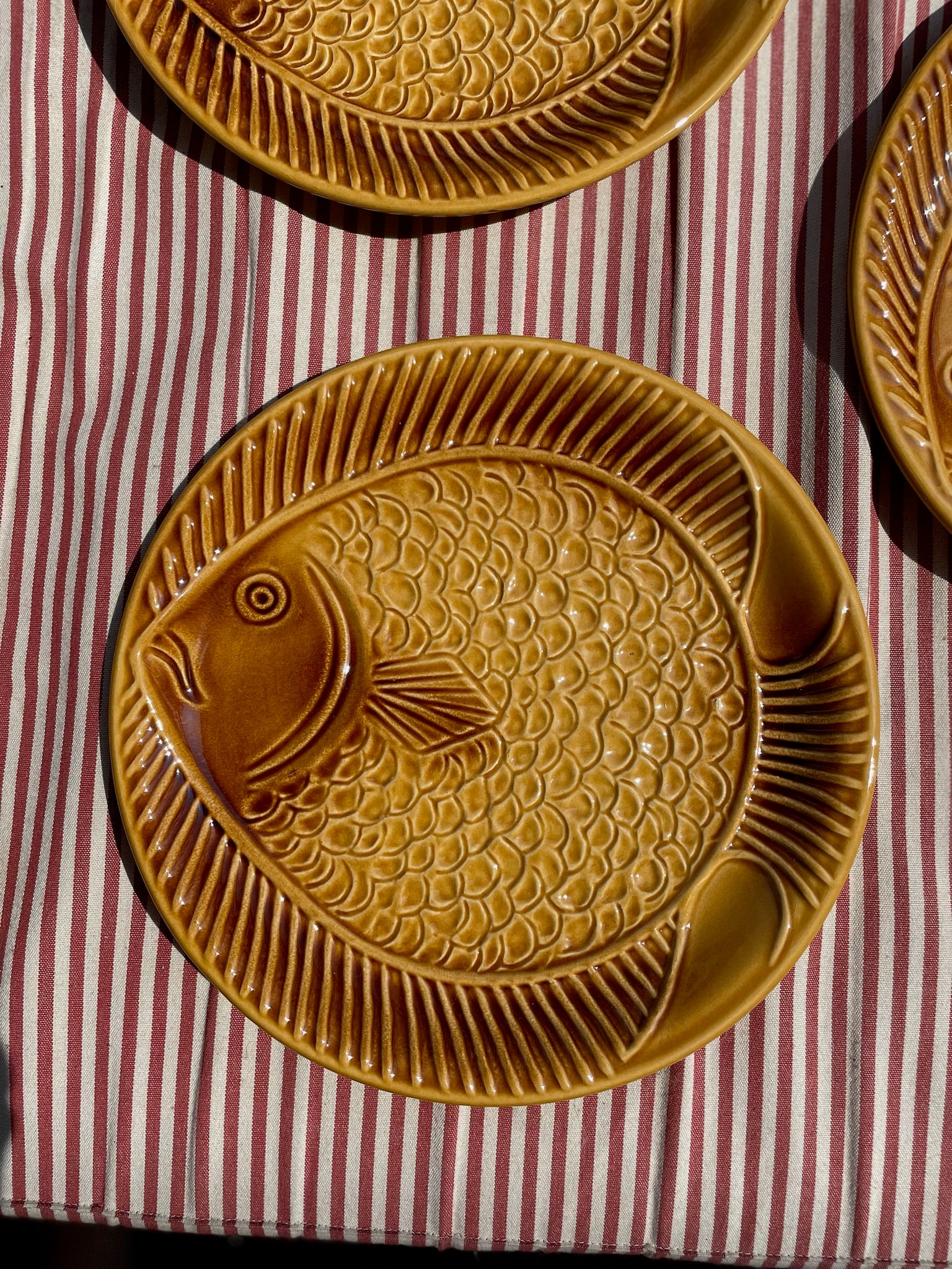 Dinner plates with a fish motif in warm brown! Unique, beautiful and in very good condition. Just brought home from a recent trip to Italy. They have a diameter of 24cm.