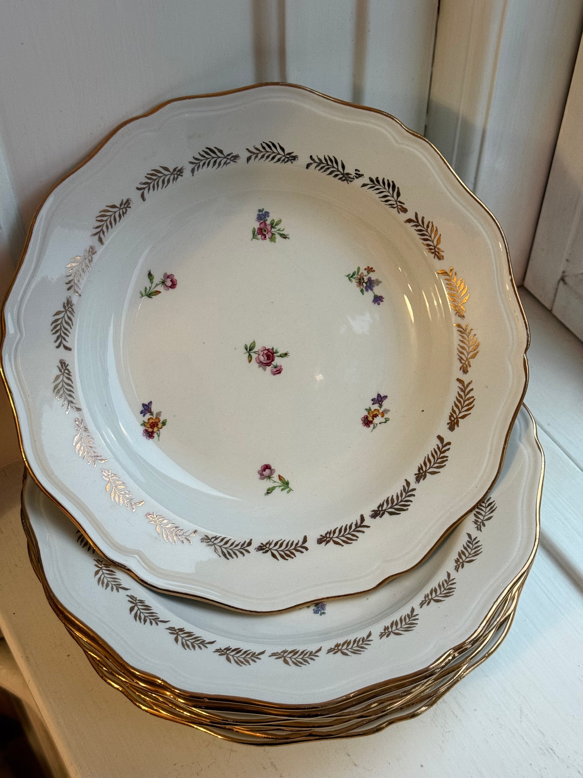 Sæt af 7 (8) dybe tallerkener med guldkant og blomster