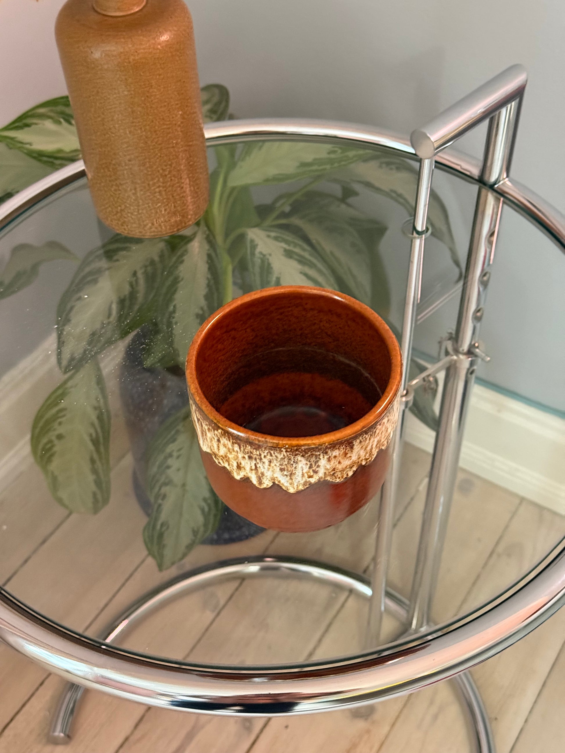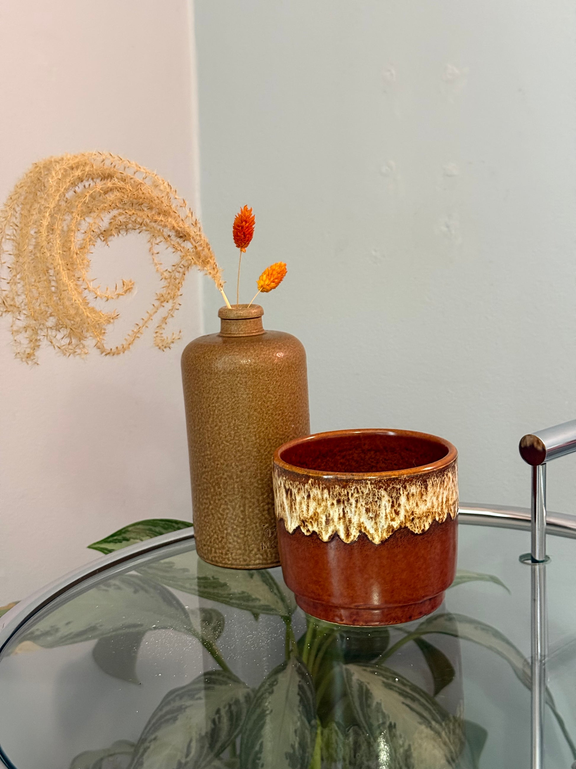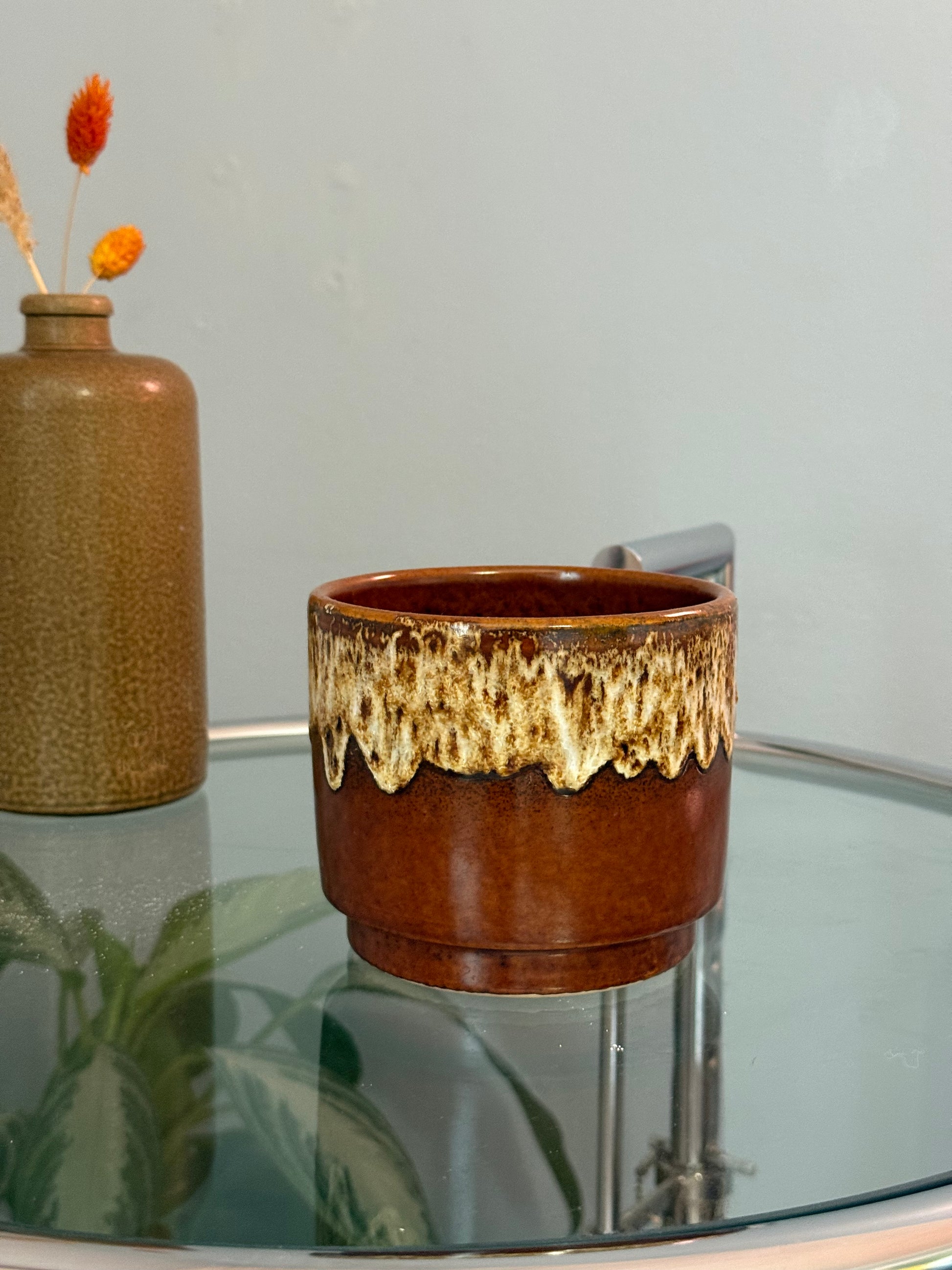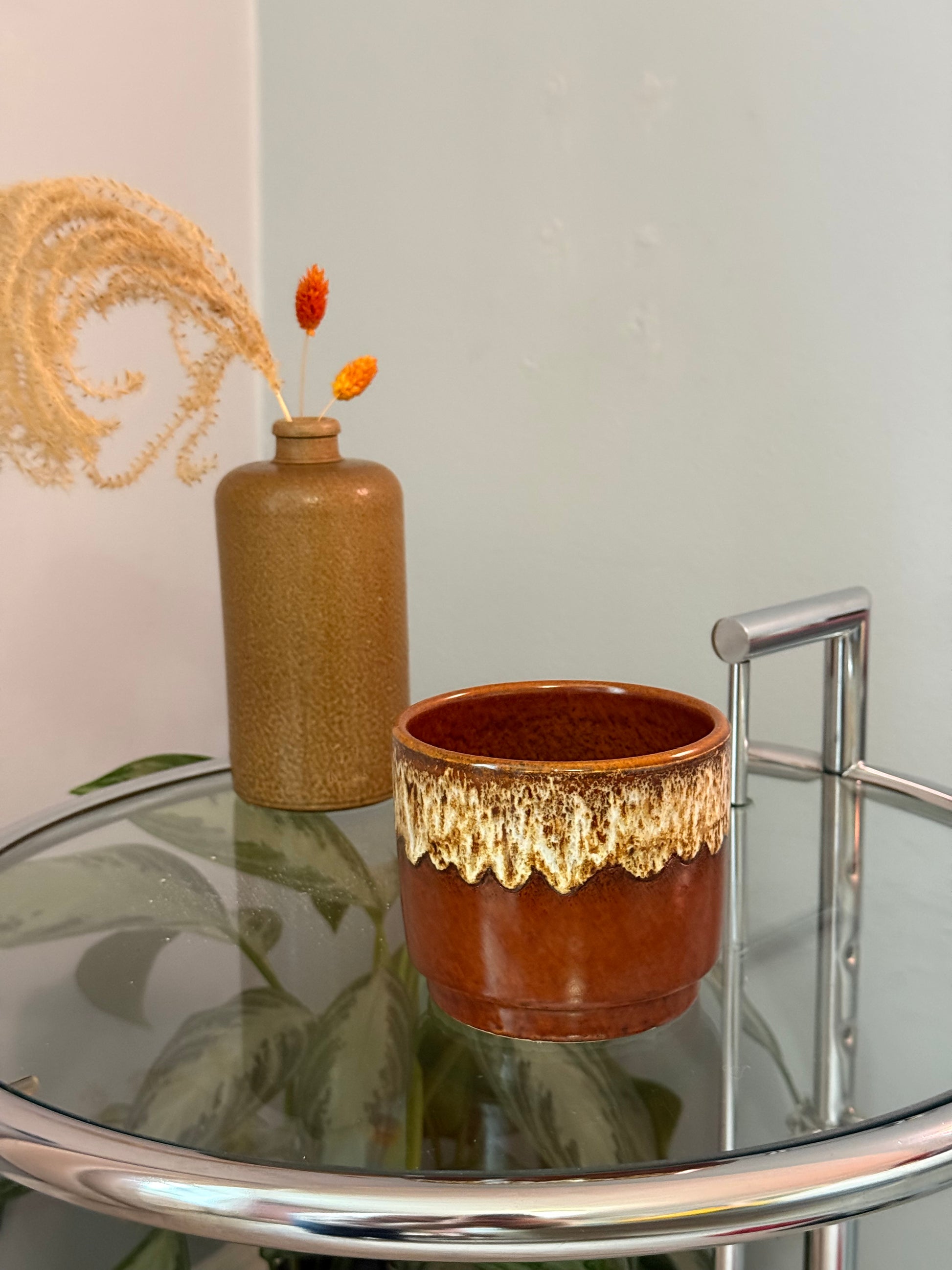 Gammel urtepotteskjuler med brun løbeglasur. Super smuk til krydderurter eller en plante. Måler 10cm i højden og 11,5cm i bredden. Super pæn stand!