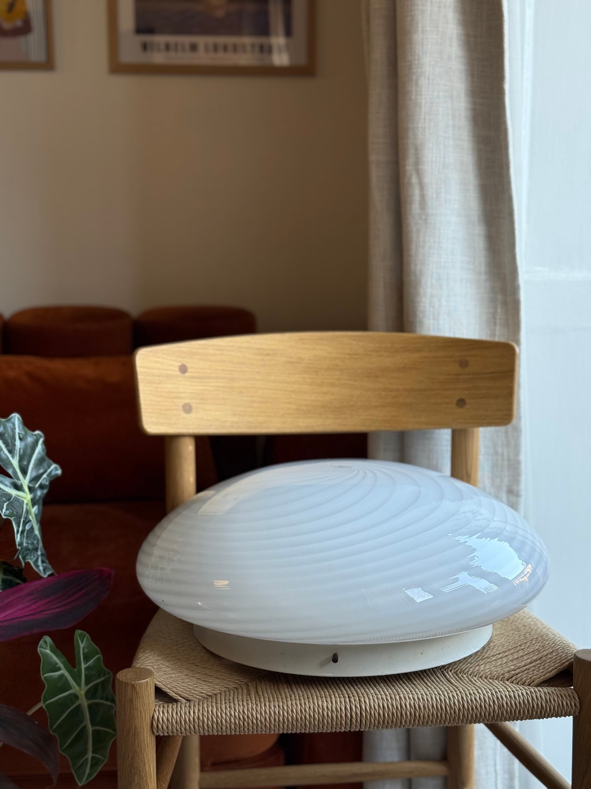 Stor, elegant plafond til ophæng som væglampe eller loftlampe alt efter dit behov. Lampen måler 46cm i bredden. Den kommer med 2 e27 fatning, men en ekstra kan snildt tilføjes. Basen er hvid og lampen er i fornem stand.