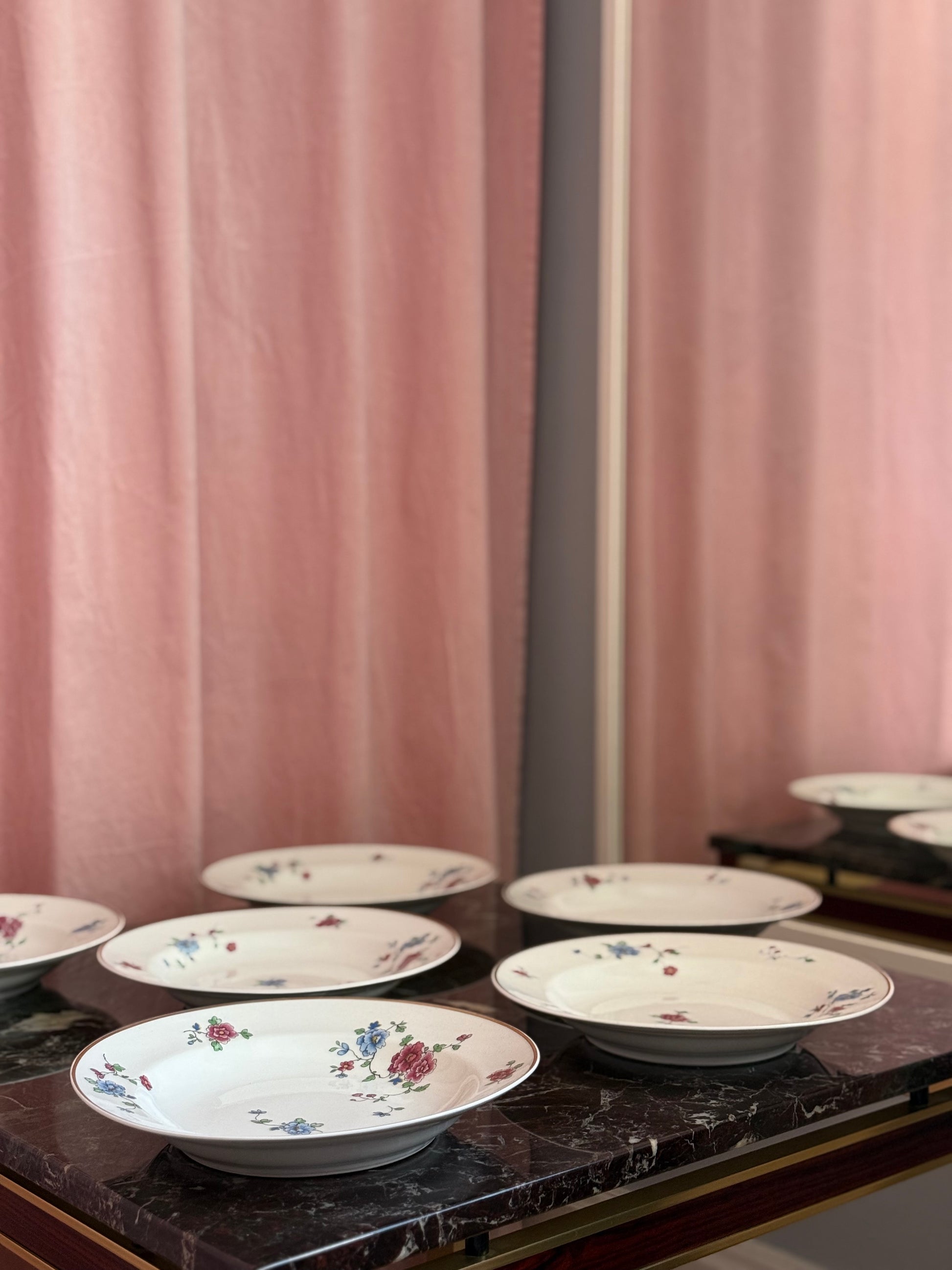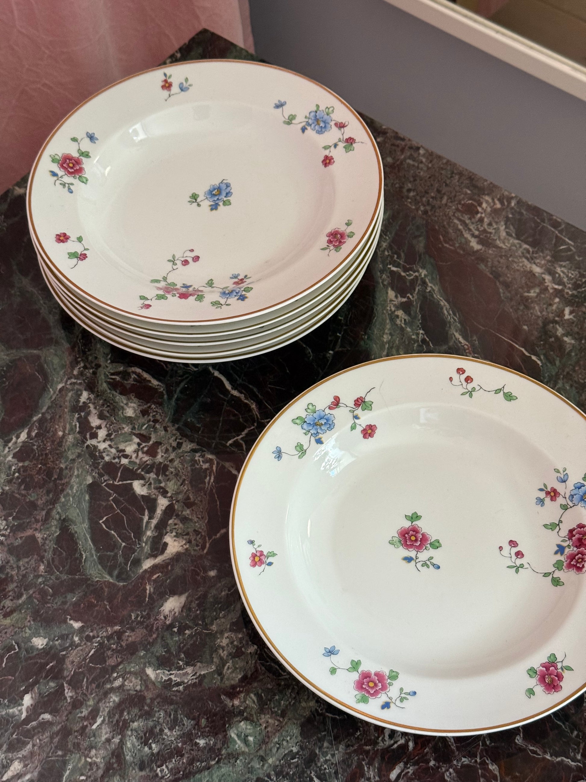 Absurd smukke og eventyrlige dybe tallerkener med pink og blå blomster. Tallerkener måler 24,5cm i bredden og 3,5cm i højden. Standen er pæn med let slid på guldkanten. Sælges stykvis.