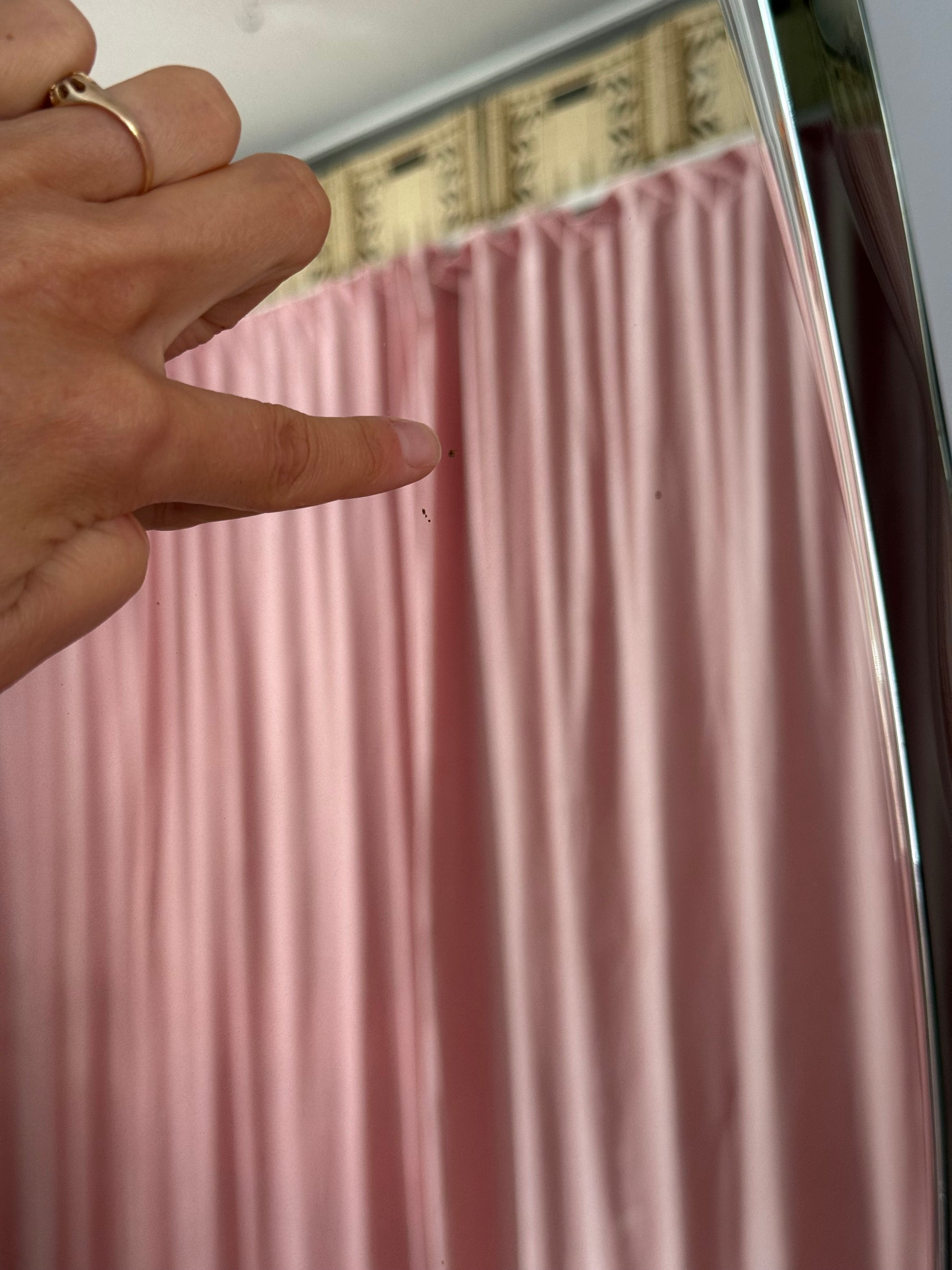 Spejlet kommer med aldersrelaterede brugsspor, som heldigvis ikke skæmmer helhedsindtrykket, men blot føjer til charmen. Se billeder. Måler 80 i højden og 59,5cm i bredden.