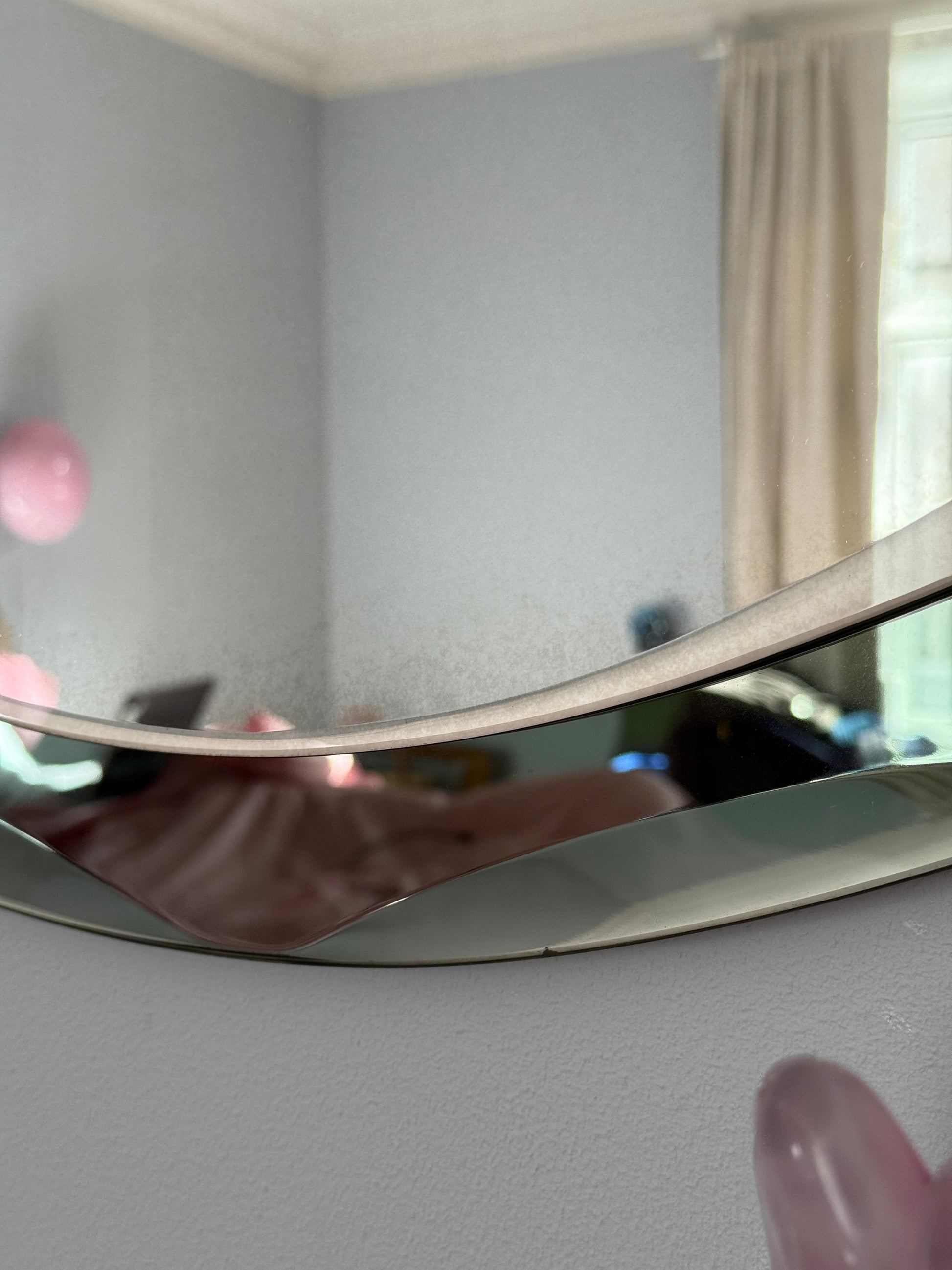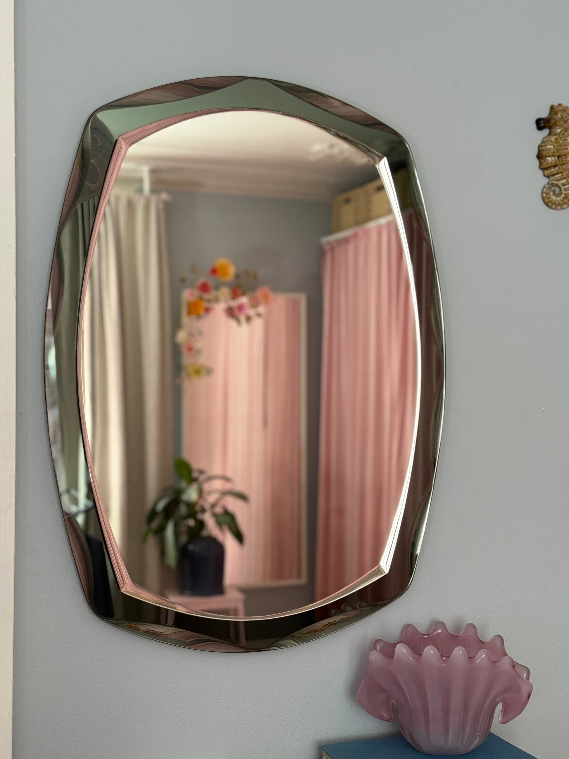 Fantastisk smukt gammelt spejl lavet i Italien. Spejlet består af to lag glas, hvoraf det yderste er grågrønt metallic med facetslebne kanter.