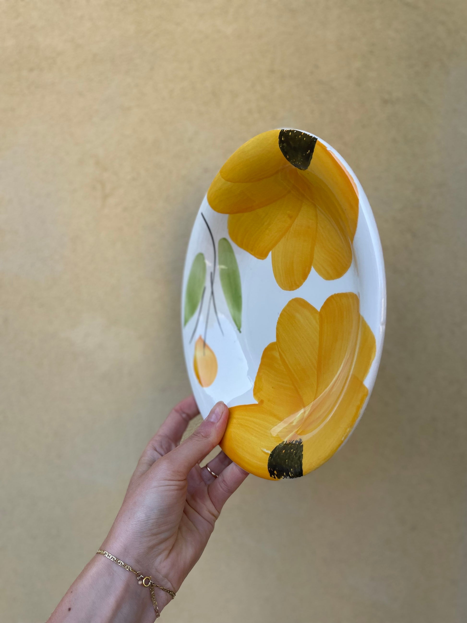Lækre italienske dybe tallerkener med kraftige gule blomster. Tallerkenerne sælges stykvis, måler 22cm i bredden, 4cm i højden og kommer med lette skrab eller små skår på kant.