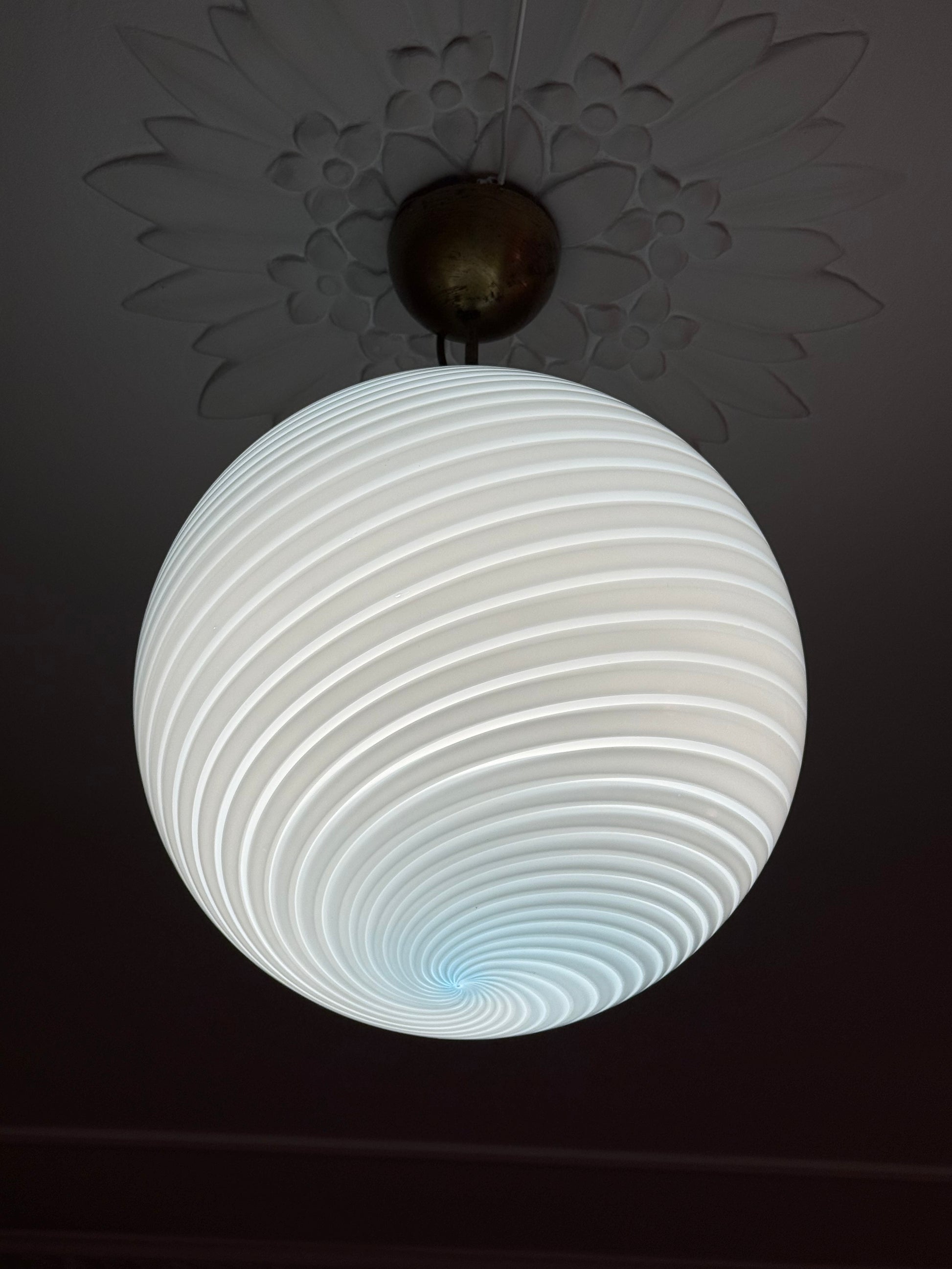 Lyseblå vintage Murano loftlampe med messing greb. Lampen måler 40cm i diameter. Når lampen tændes gives den et flot klart og køligt lys.