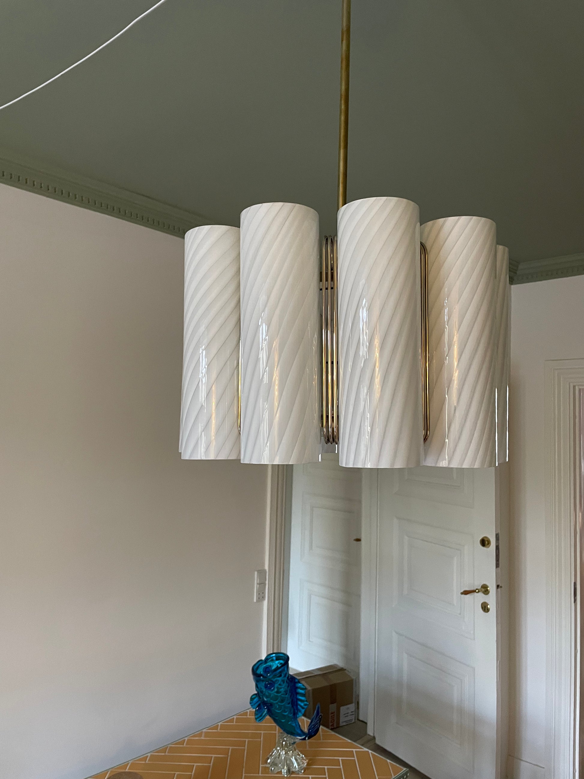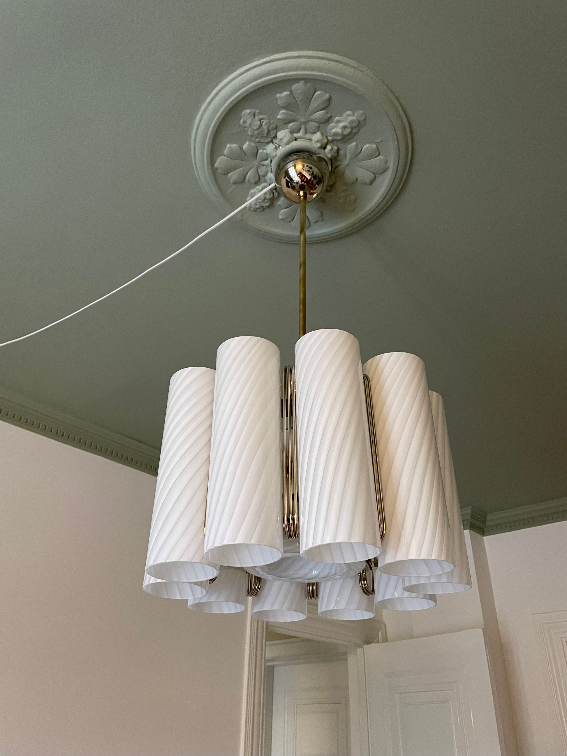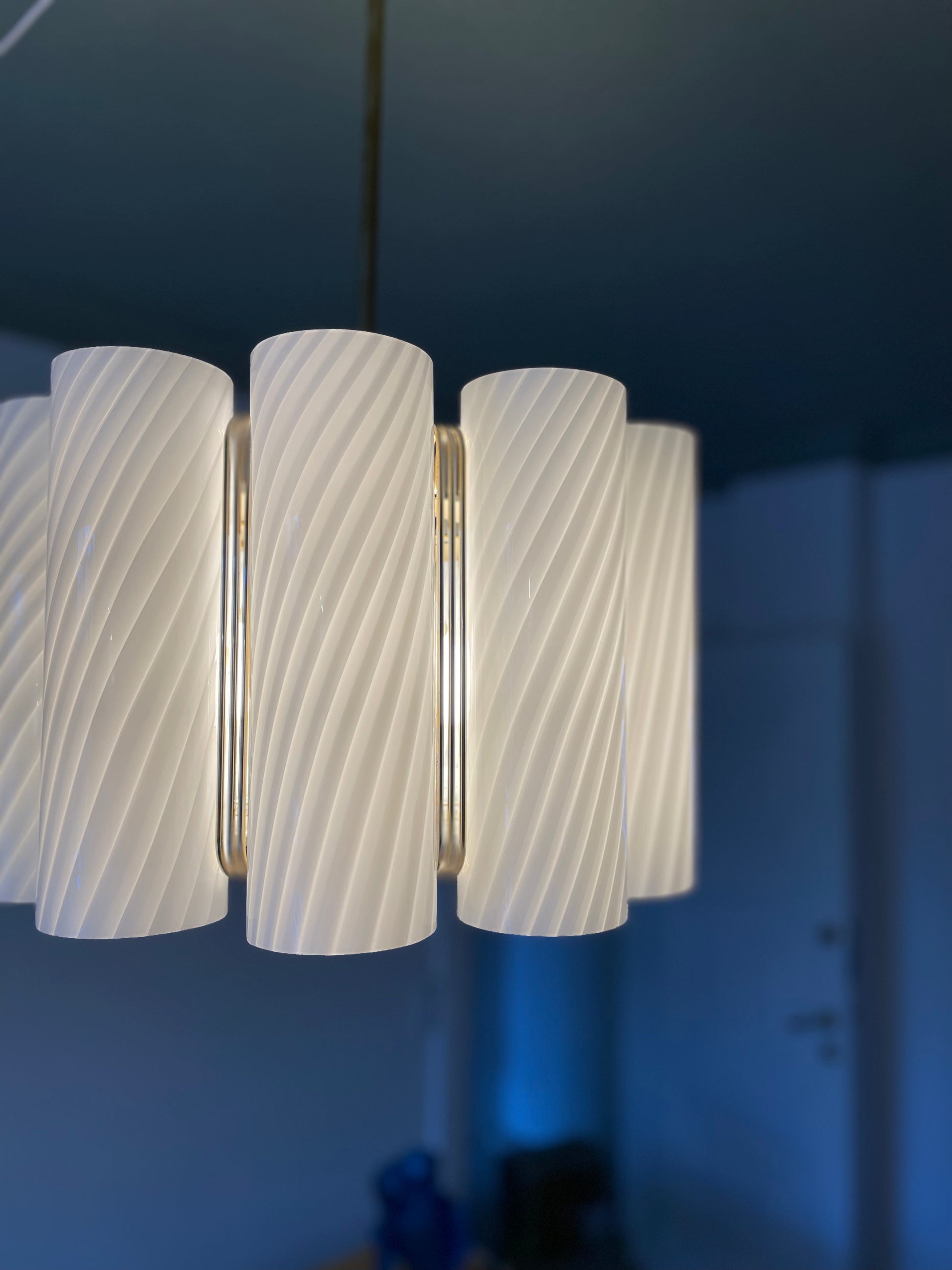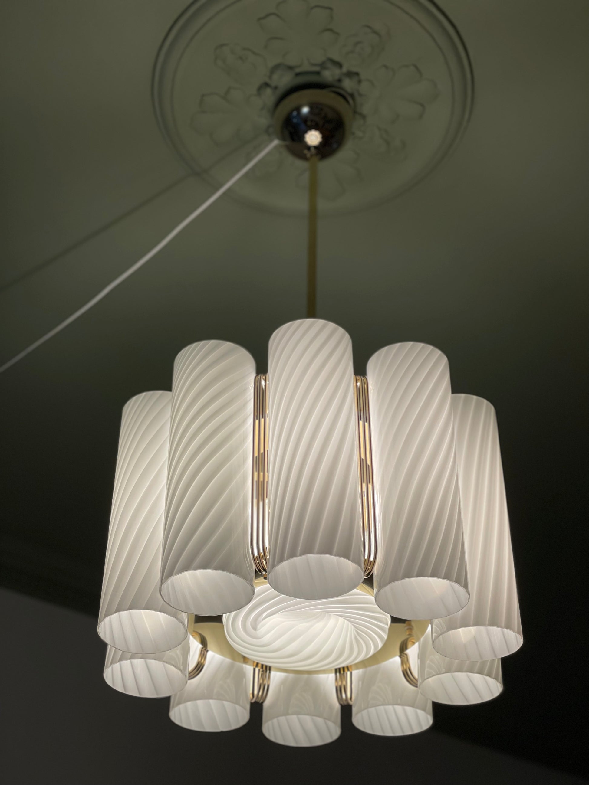Der er vidst ikke noget at sige til at vi tabte kæben, da vi fik denne helt særegne vintage lysekrone op at hænge. Lysekronen består af 10 cylindere i hvidt vintage Murano glas med swirl. Disse er monteret på en messing base. Lampen måler 85cm i højden, men kan forkortes med en wire, såfremt det kniber i højden, at bruge stangen. Sig da bare til. Vi monterer 😊 Hver cylinder måler 28cm i højden, så lampen kan hænge betydeligt tættere på loftet end de 85cm.