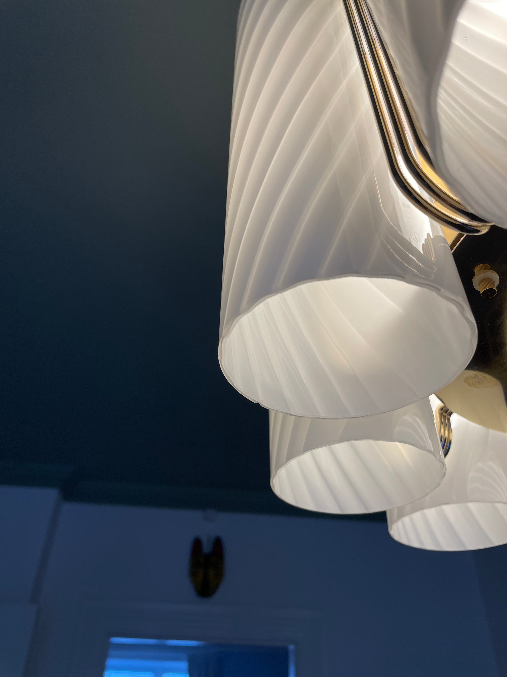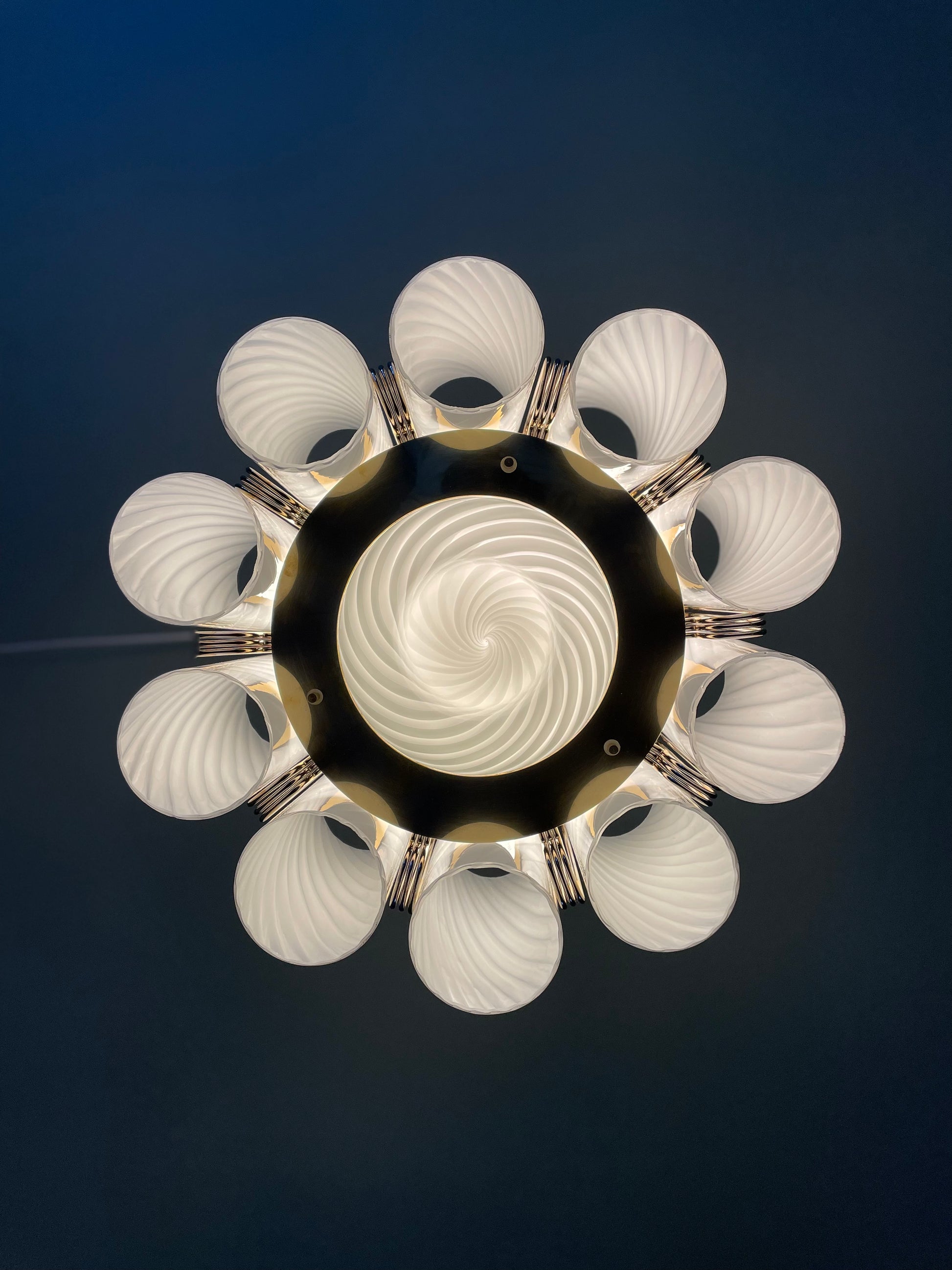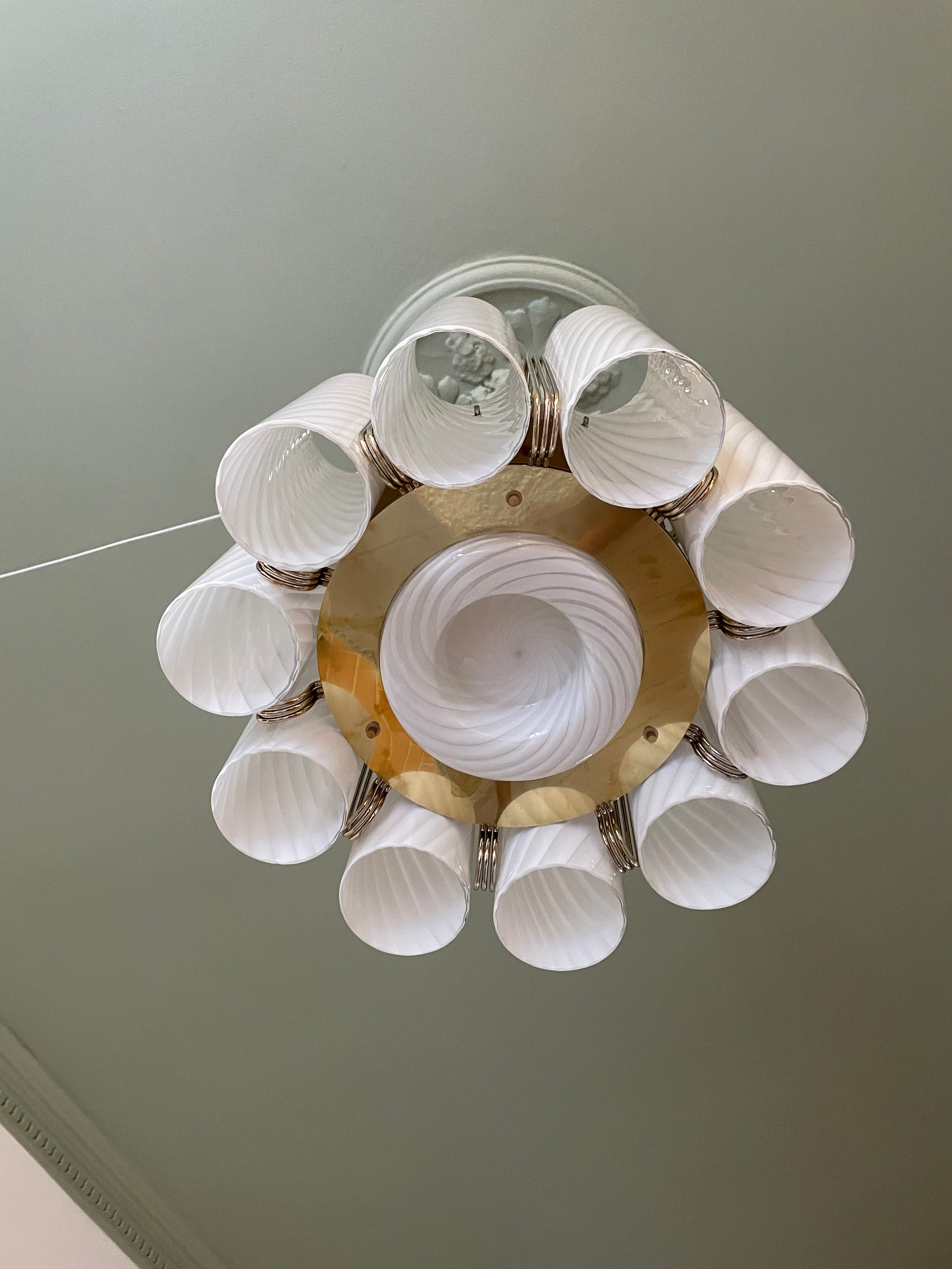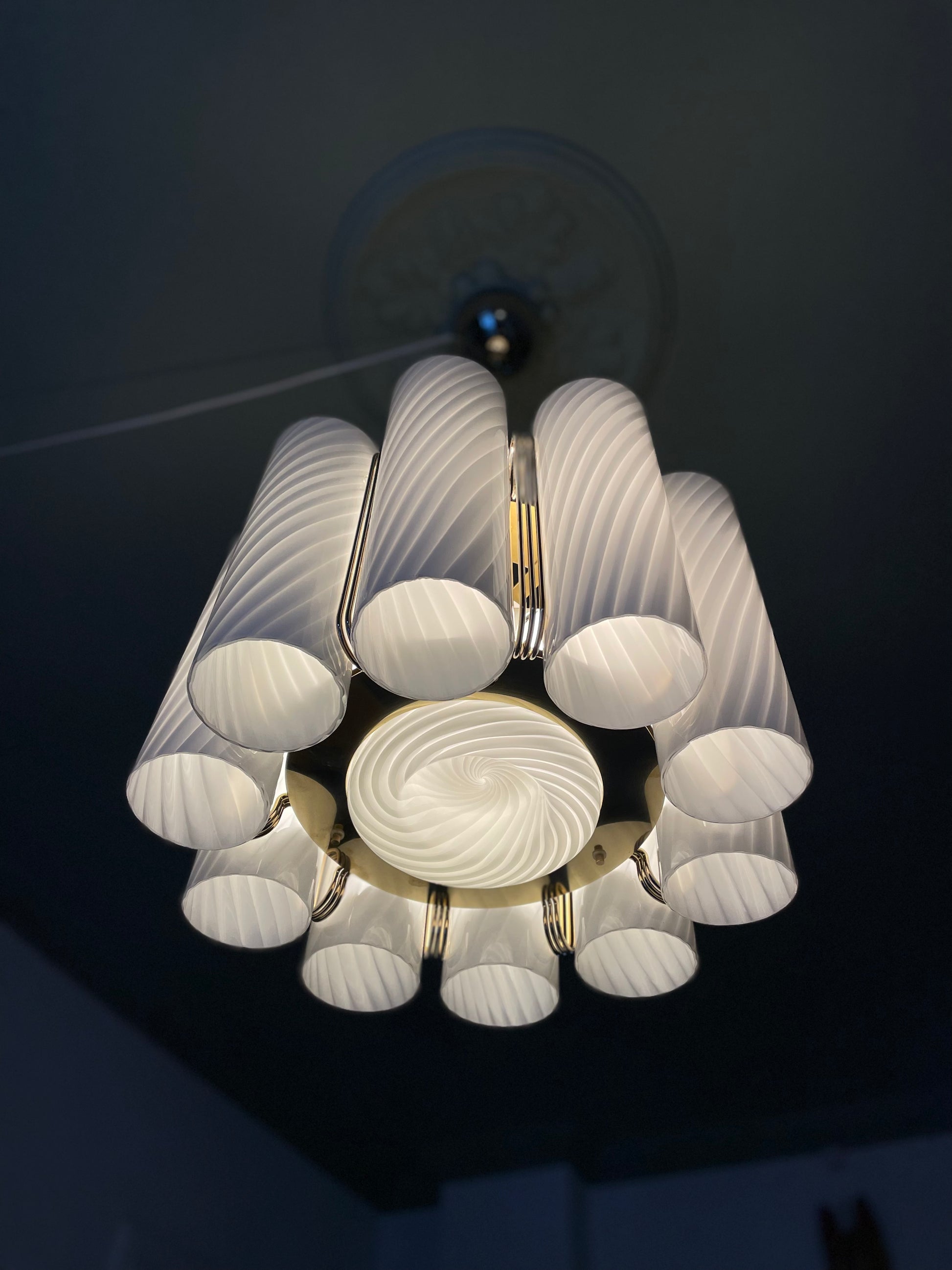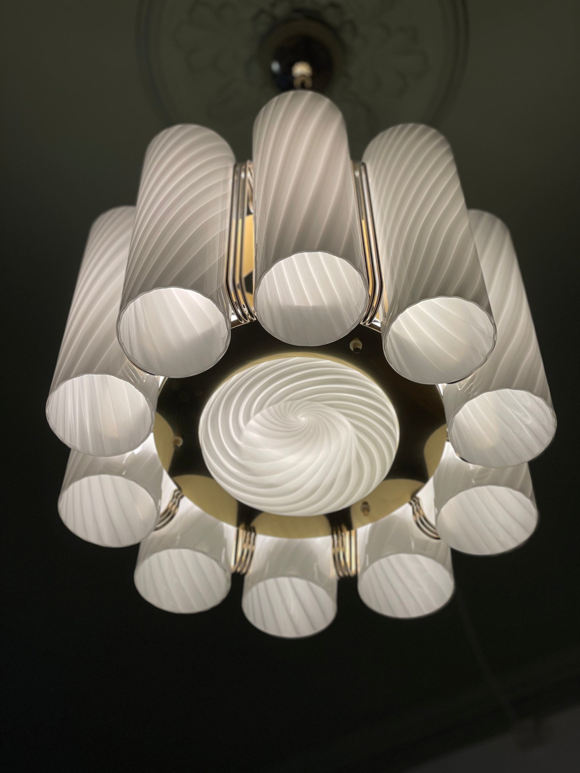 Der er vidst ikke noget at sige til at vi tabte kæben, da vi fik denne helt særegne vintage lysekrone op at hænge. Lysekronen består af 10 cylindere i hvidt vintage Murano glas med swirl. Disse er monteret på en messing base. Lampen måler 85cm i højden, men kan forkortes med en wire, såfremt det kniber i højden, at bruge stangen. Sig da bare til. Vi monterer 😊 Hver cylinder måler 28cm i højden, så lampen kan hænge betydeligt tættere på loftet end de 85cm.