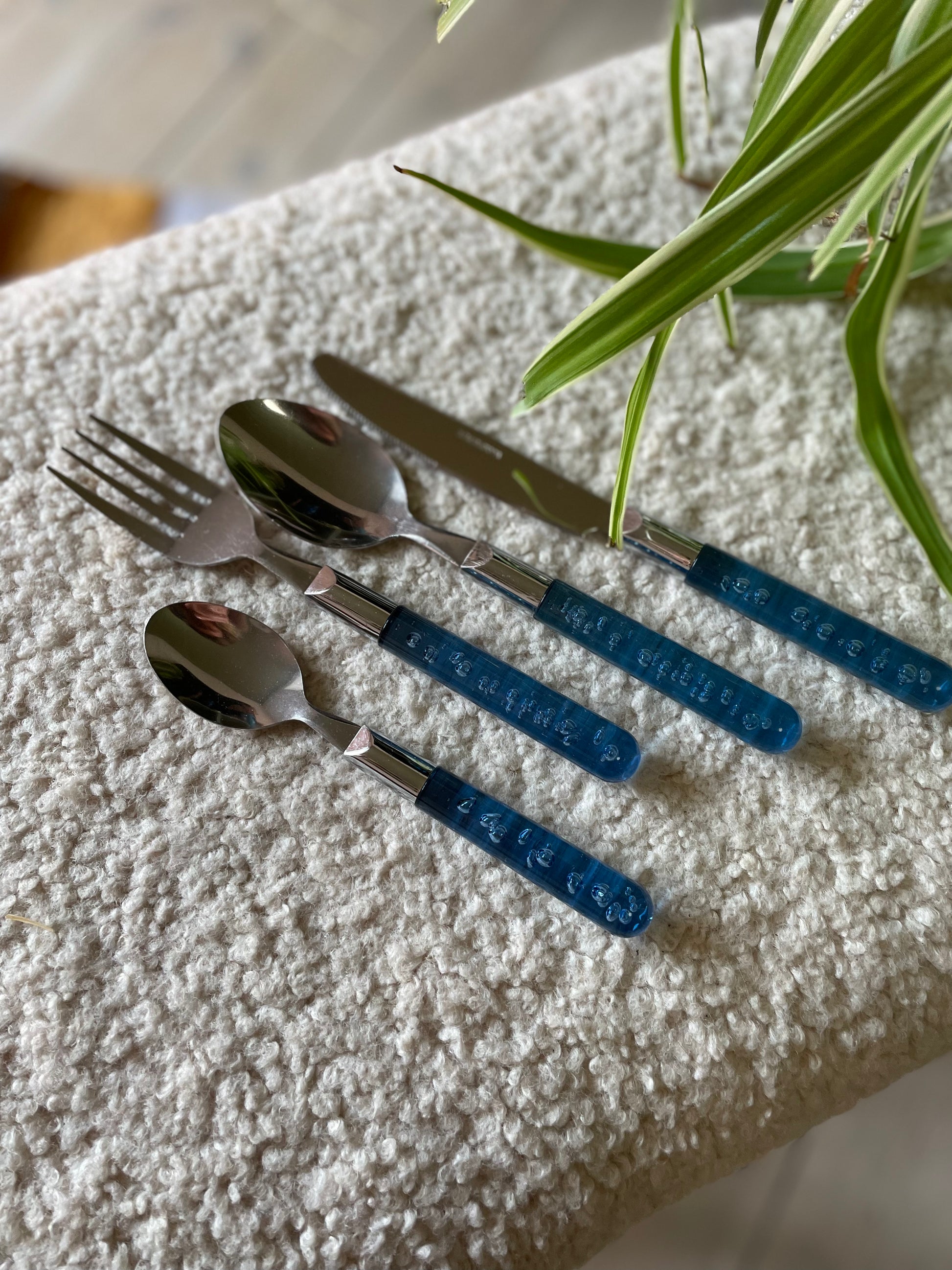 Et sæt består af 6x4 dele - kniv, gaffel, spiseske og theske.