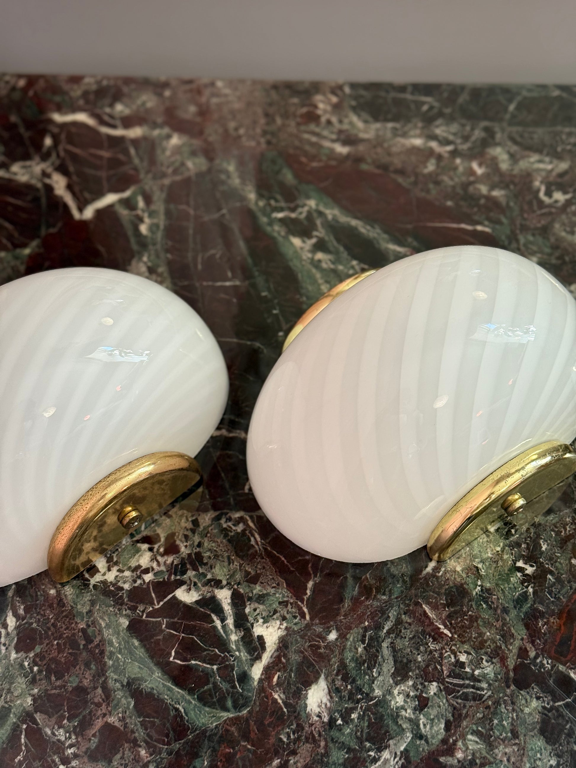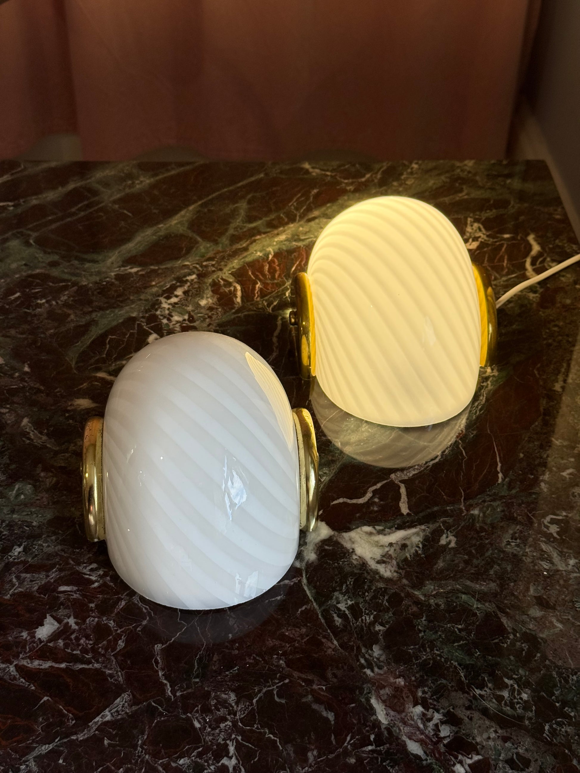 Smukke vintage entrelamper i hvidt Murano glas med swirl. Lamperne kommer med patinerede messinggreb og måler 22cm i bredden og 15cm i højden.