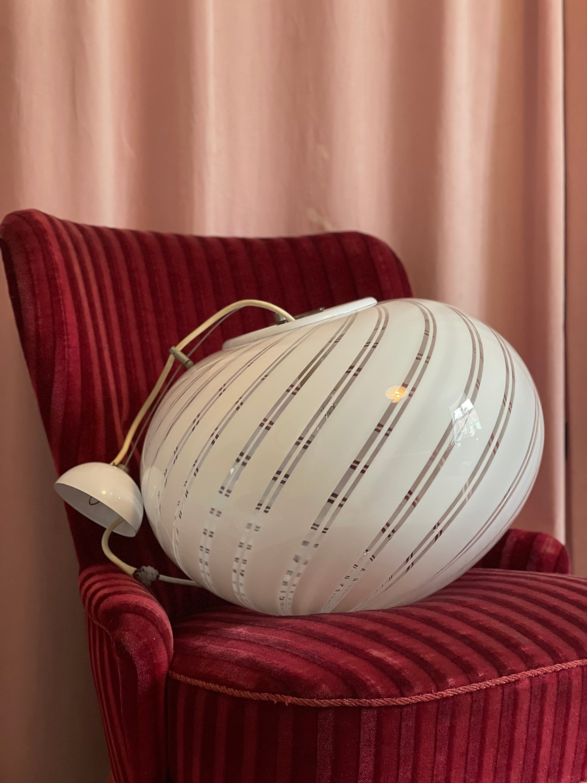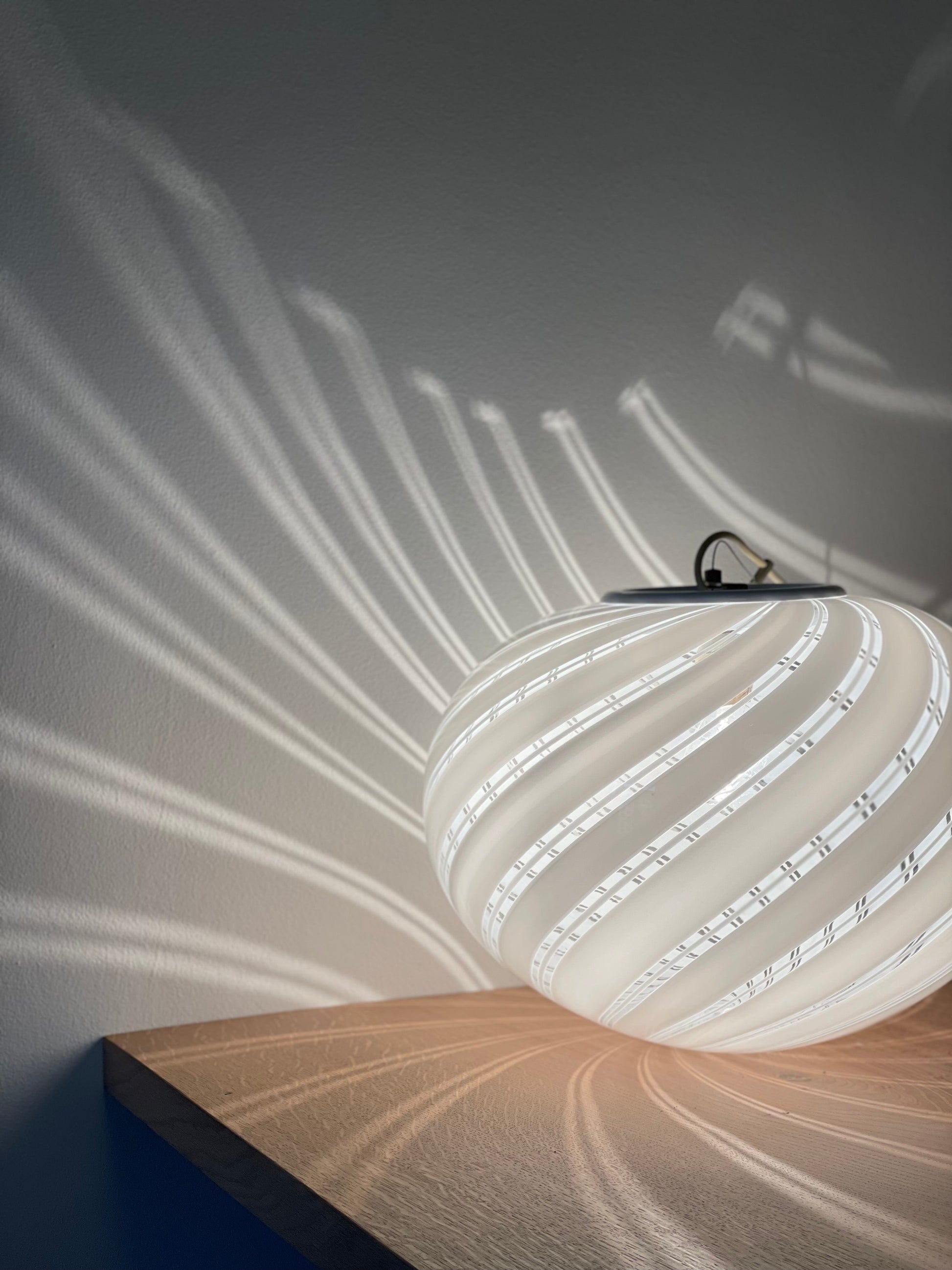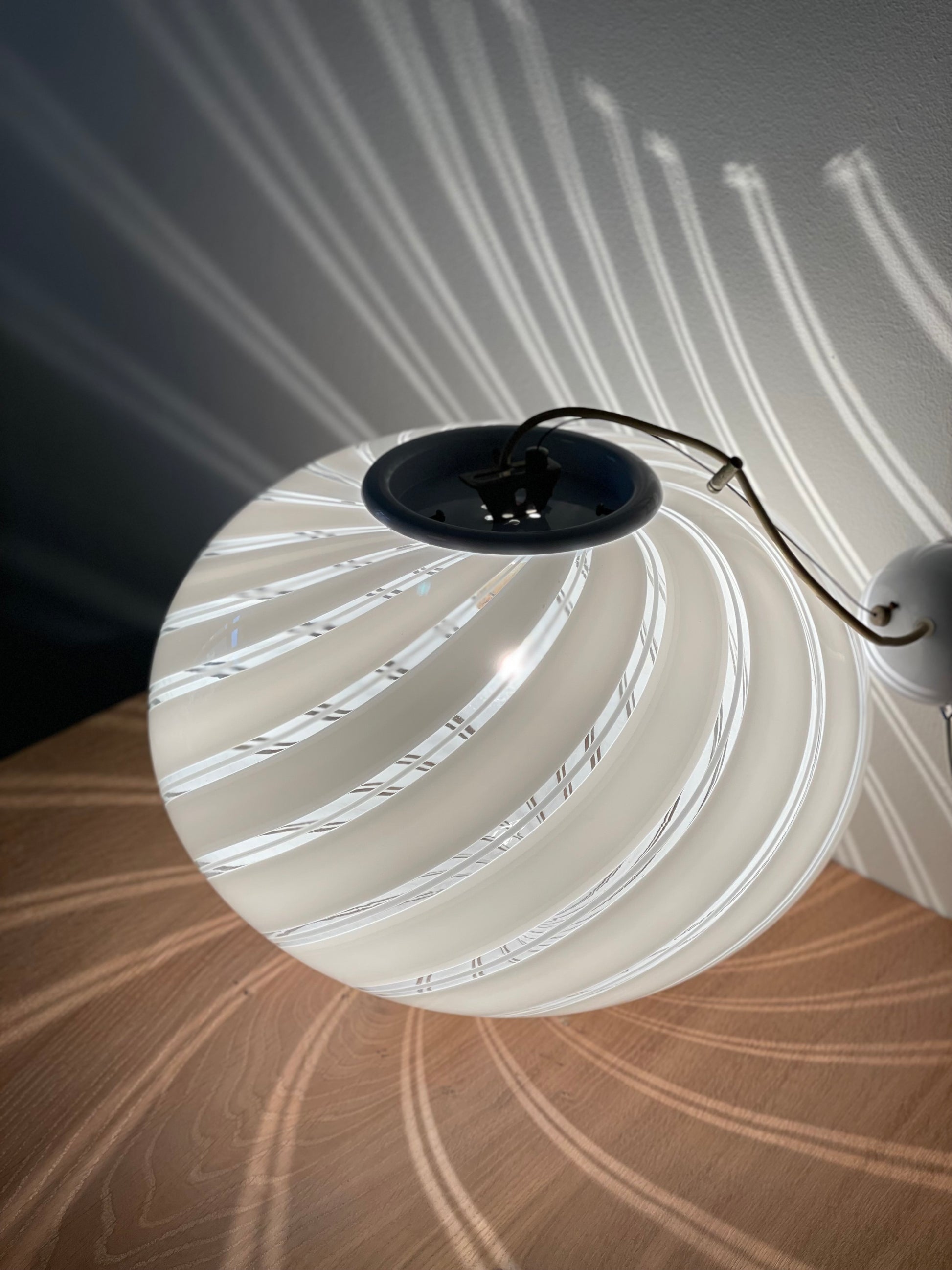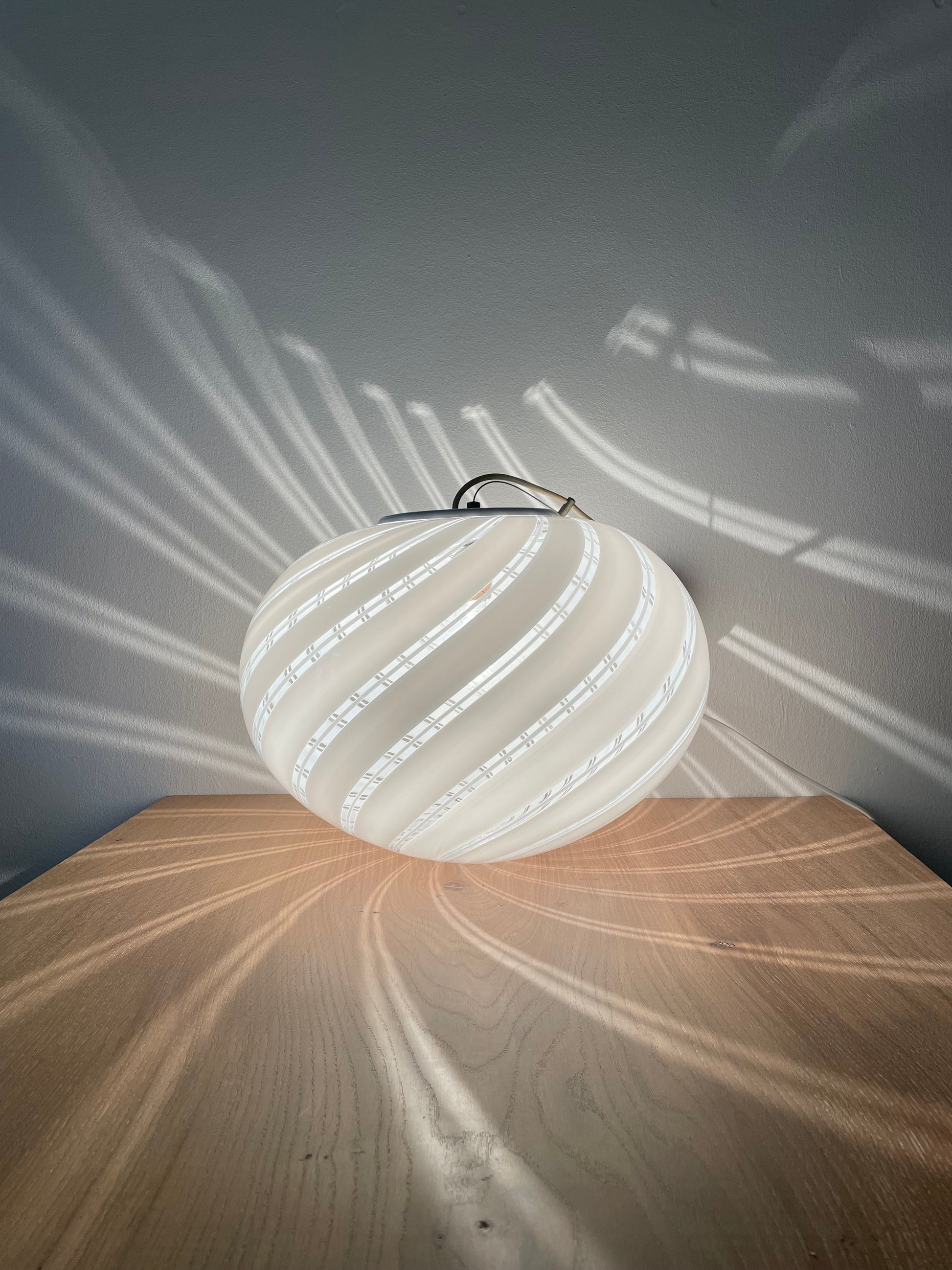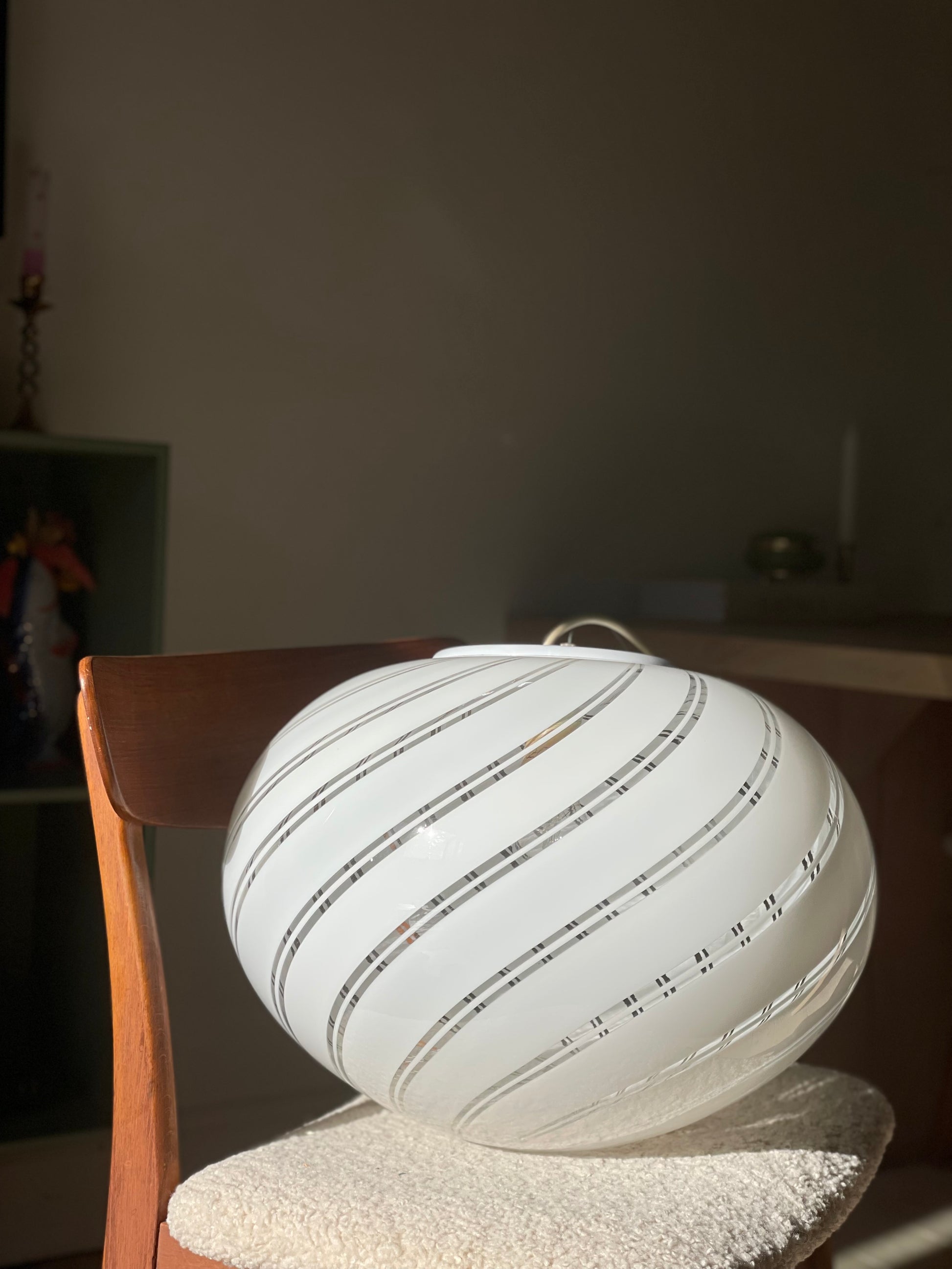 Lampen er lavet i et smukt mix af hvidt og klart vintage Murano glas og kommer med hvidt greb. Den bruger desuden 1 e27 pære og kommer med originalt klistermærke.