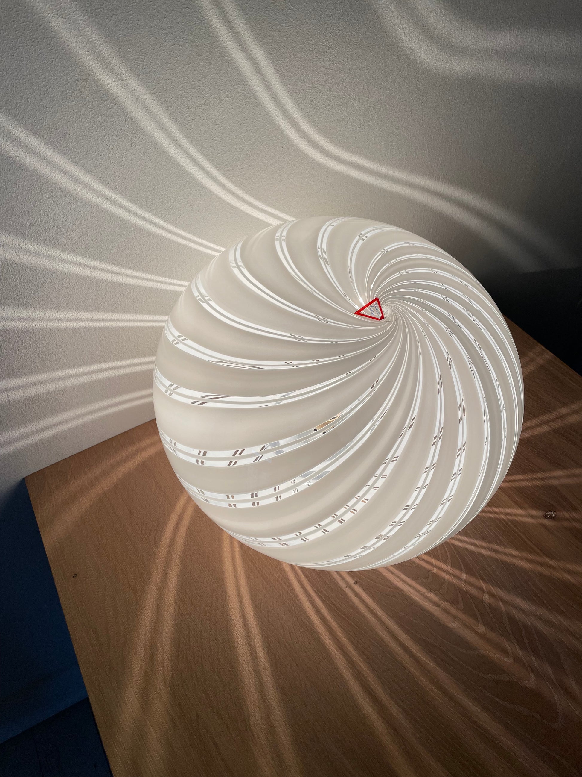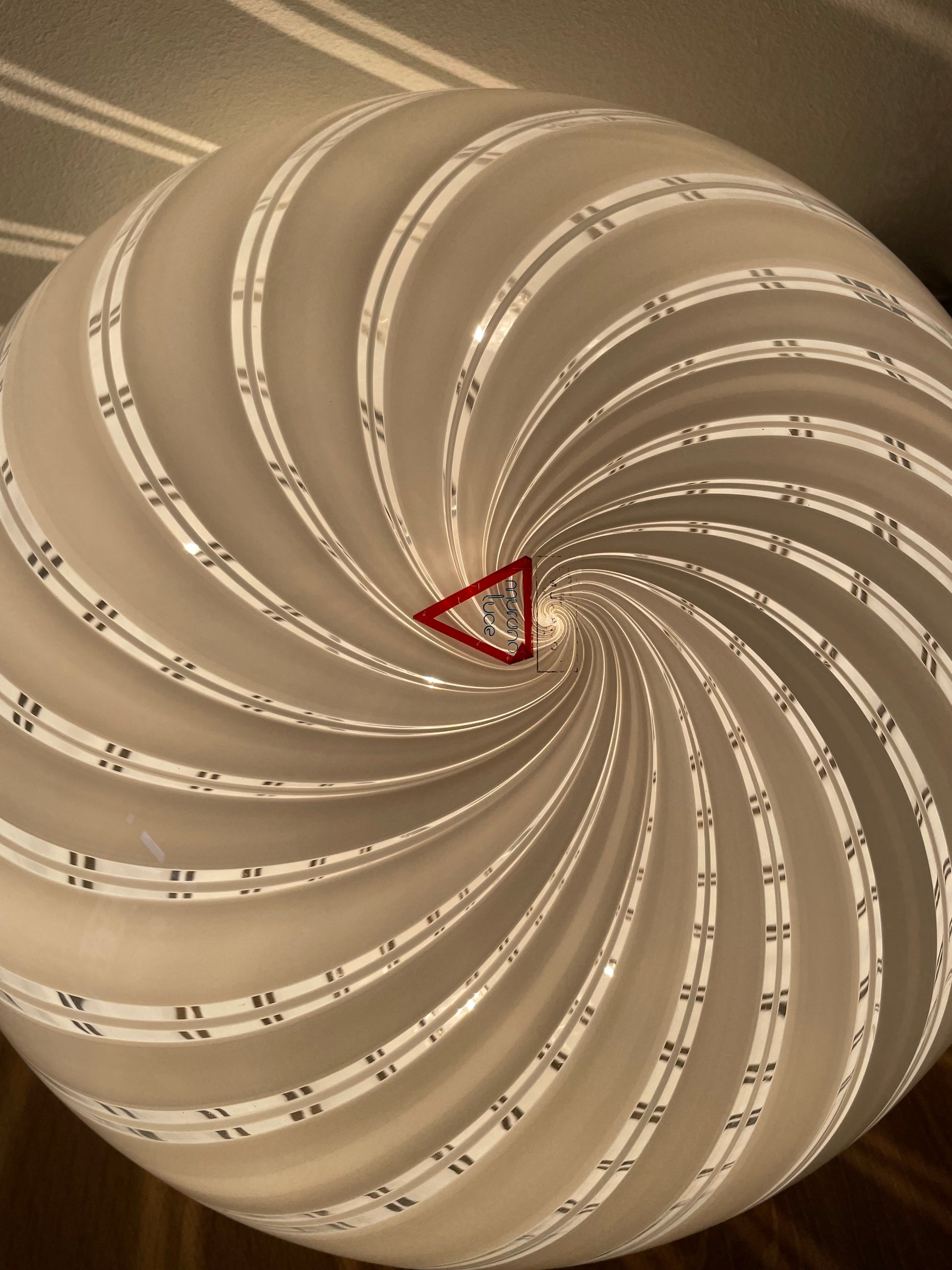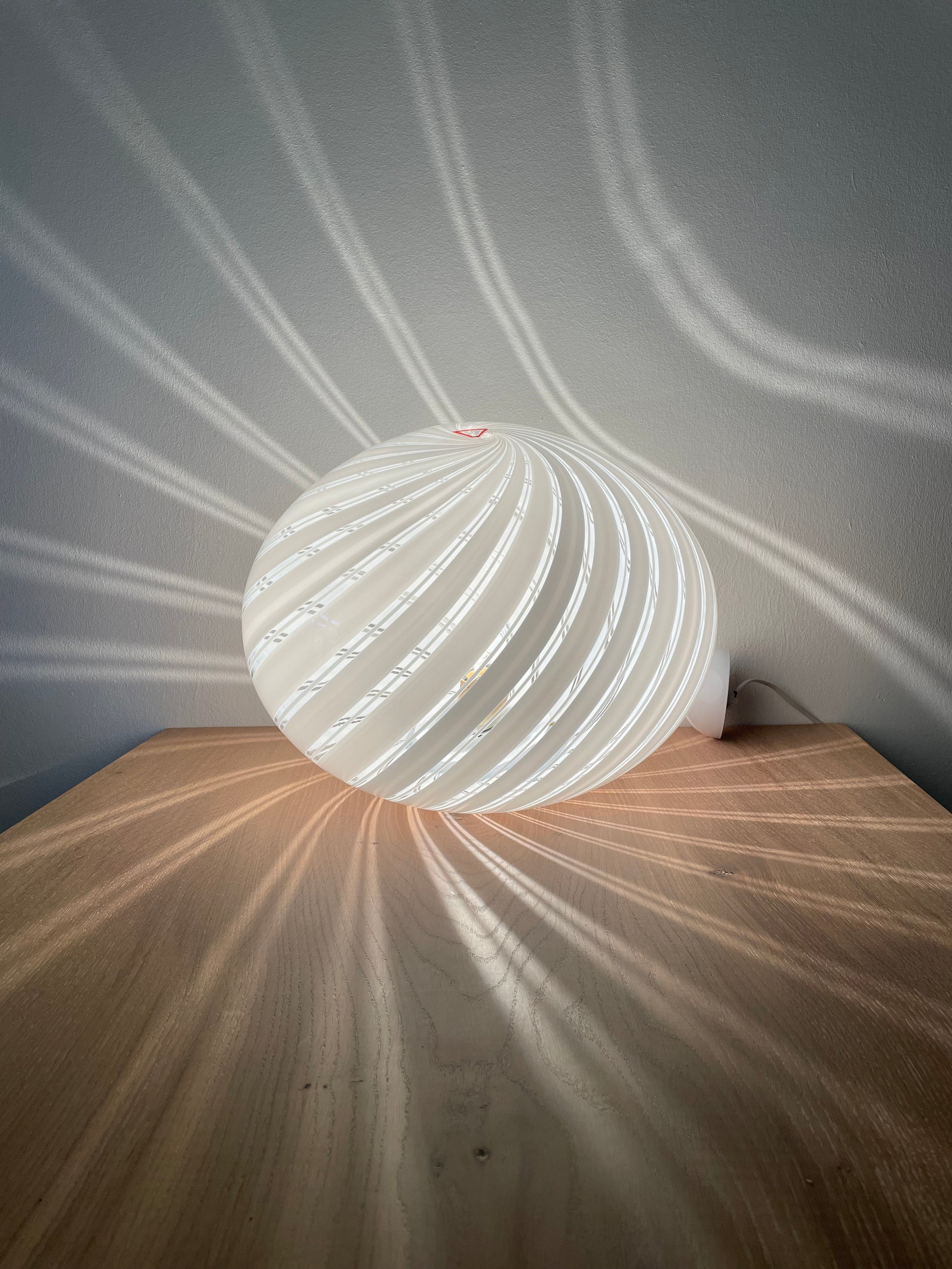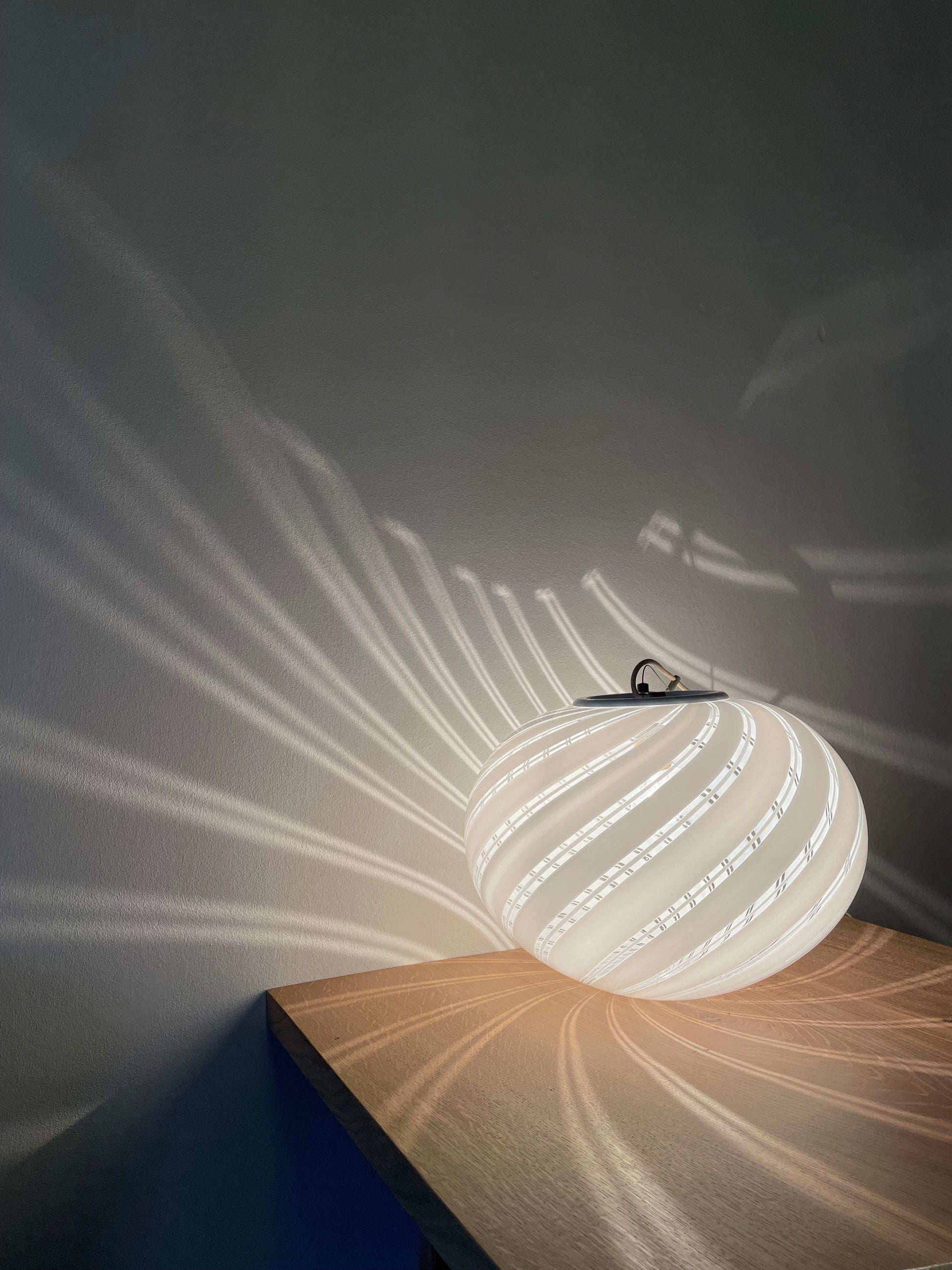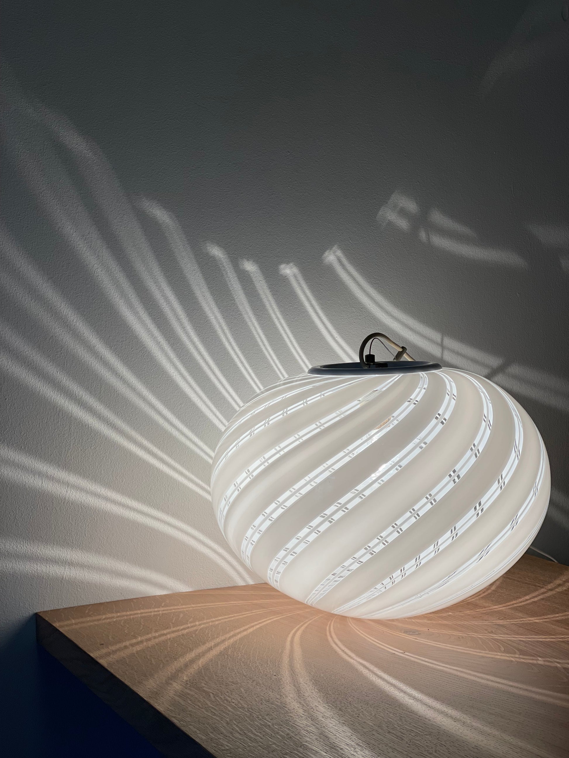 Lampen er lavet i et smukt mix af hvidt og klart vintage Murano glas og kommer med hvidt greb. Den bruger desuden 1 e27 pære og kommer med originalt klistermærke.