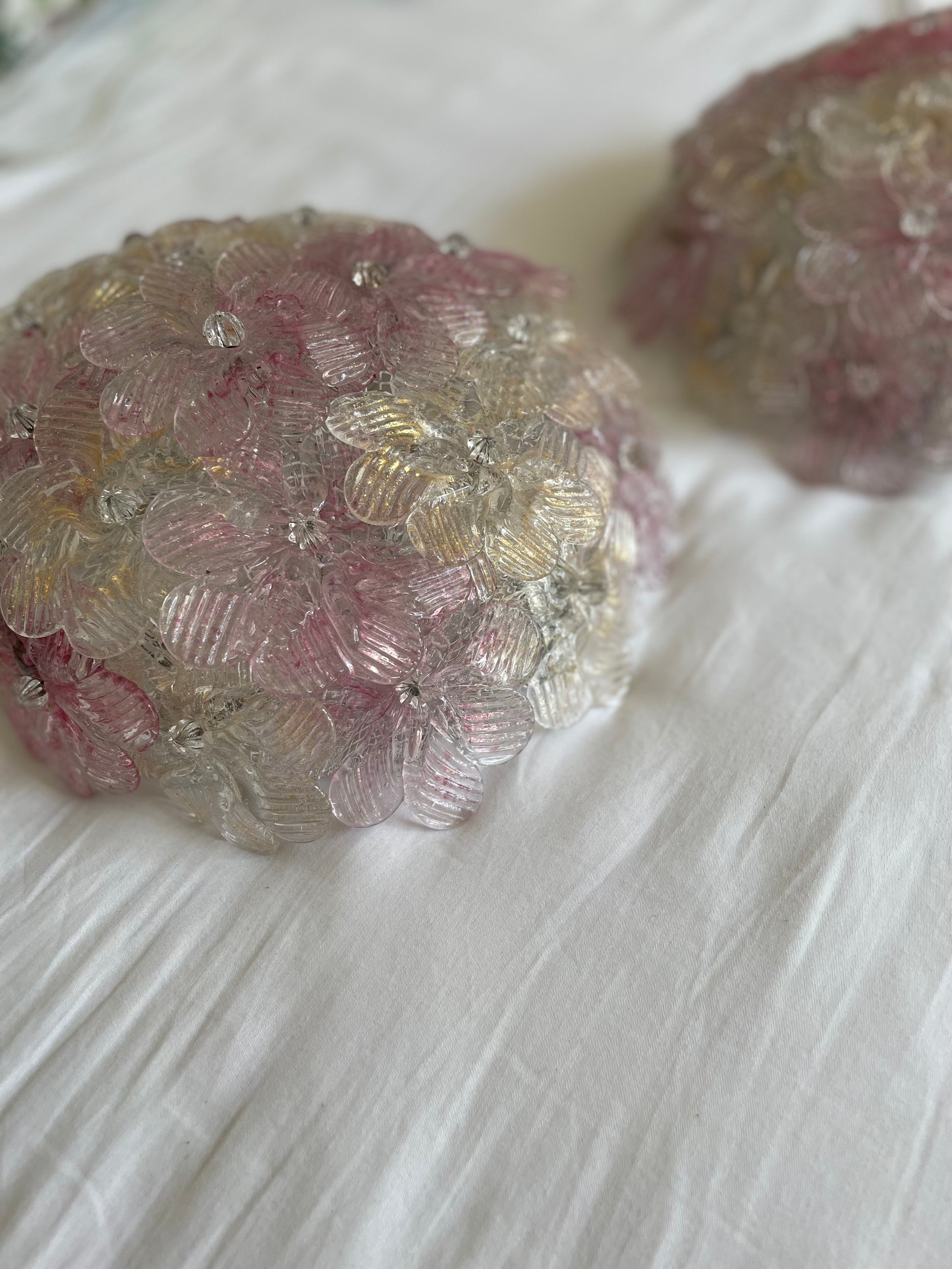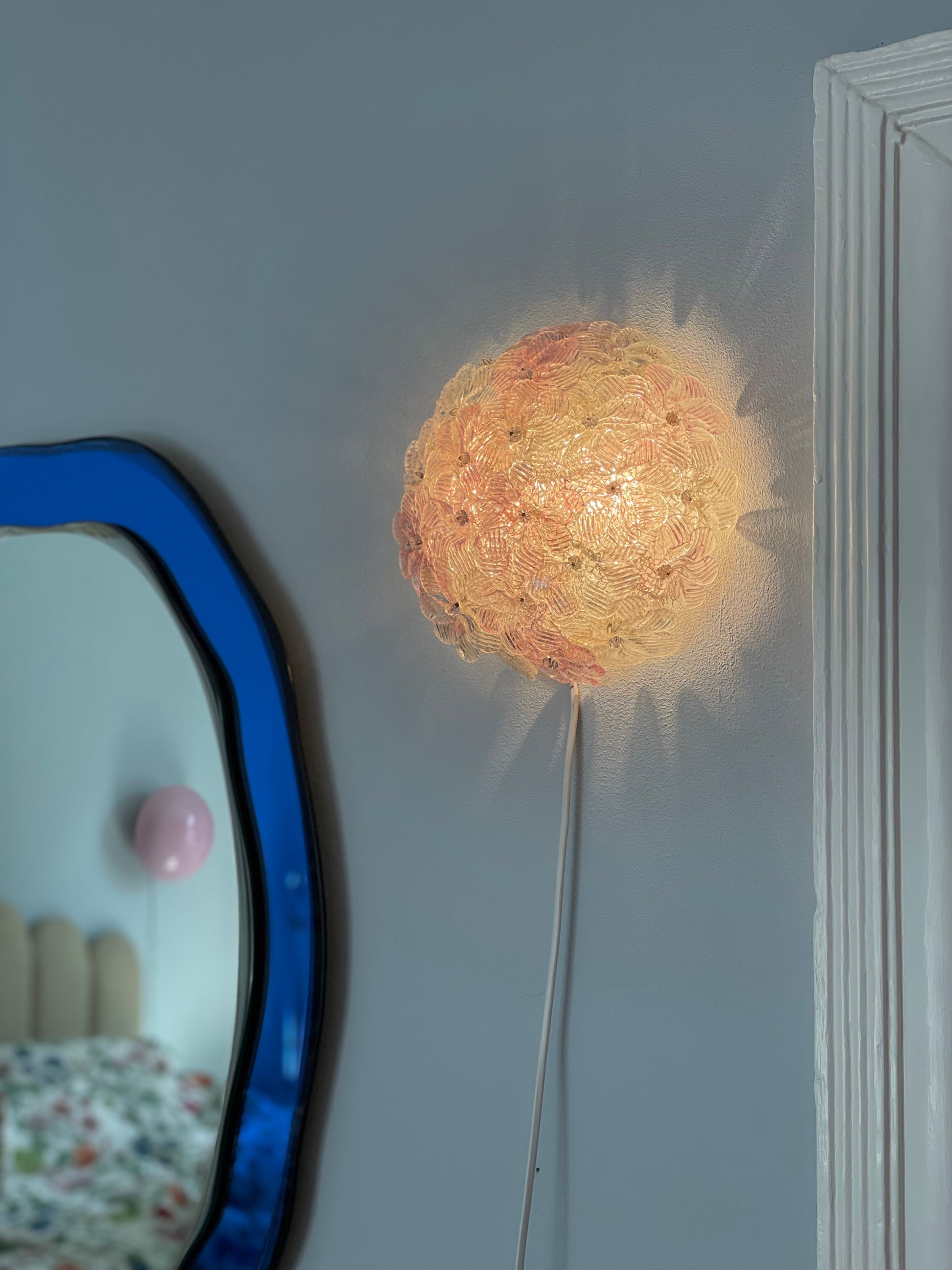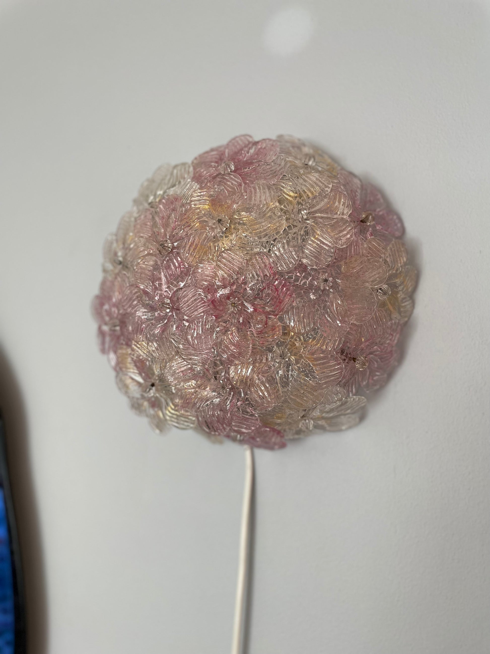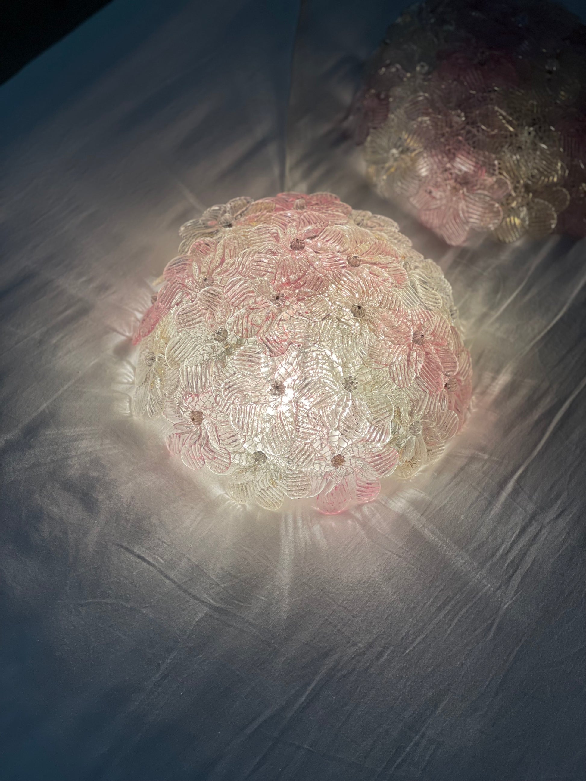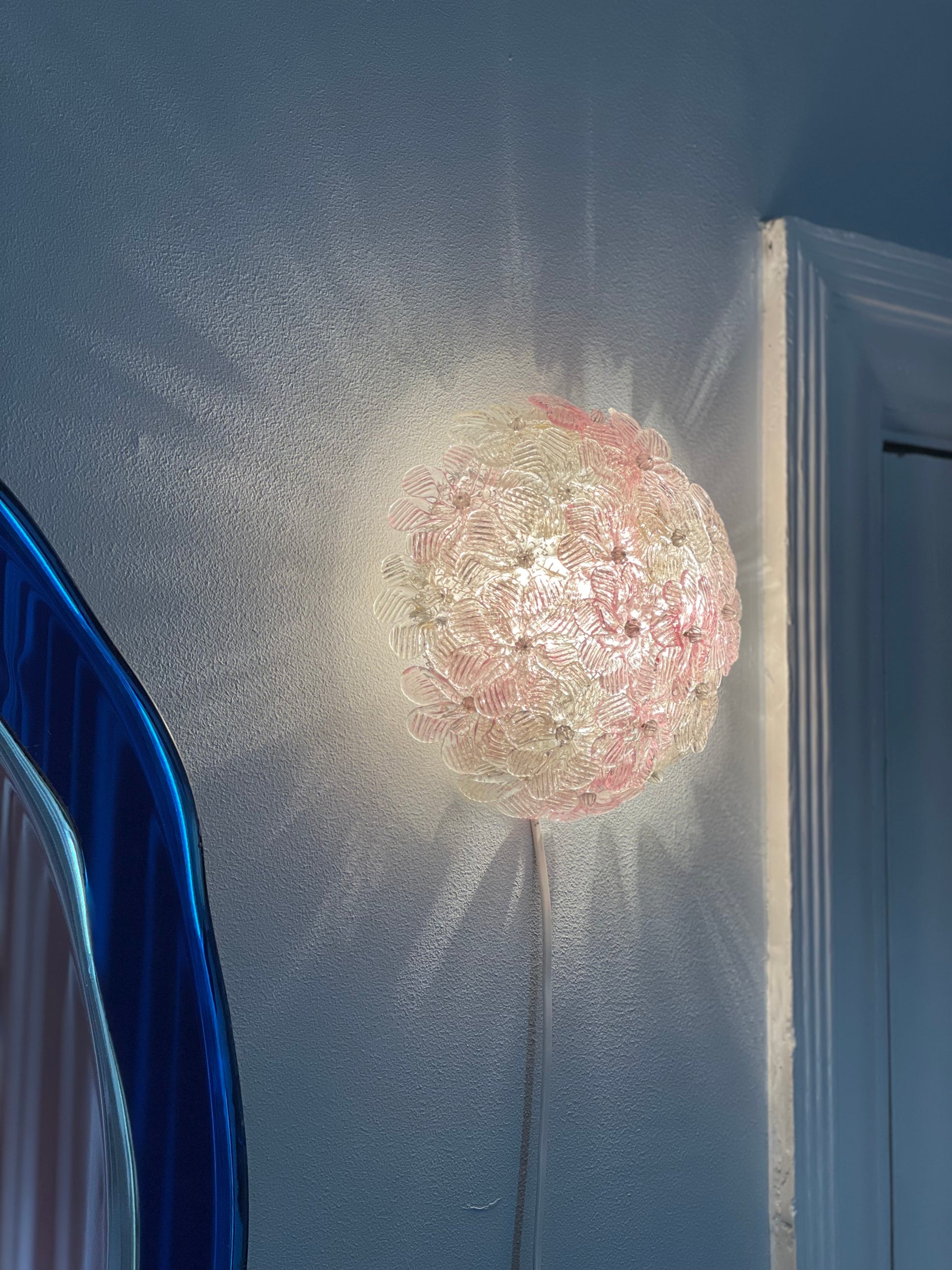 Fantastisk smuk plafond til ophæng i for eller på væg. På væg hænges den på en skrue og i loft hænges den på en krog. Lampen består af hvide og lyserøde glasblomster med guldstænk. Den har 2 e14 fatninger og er i flot stand.
