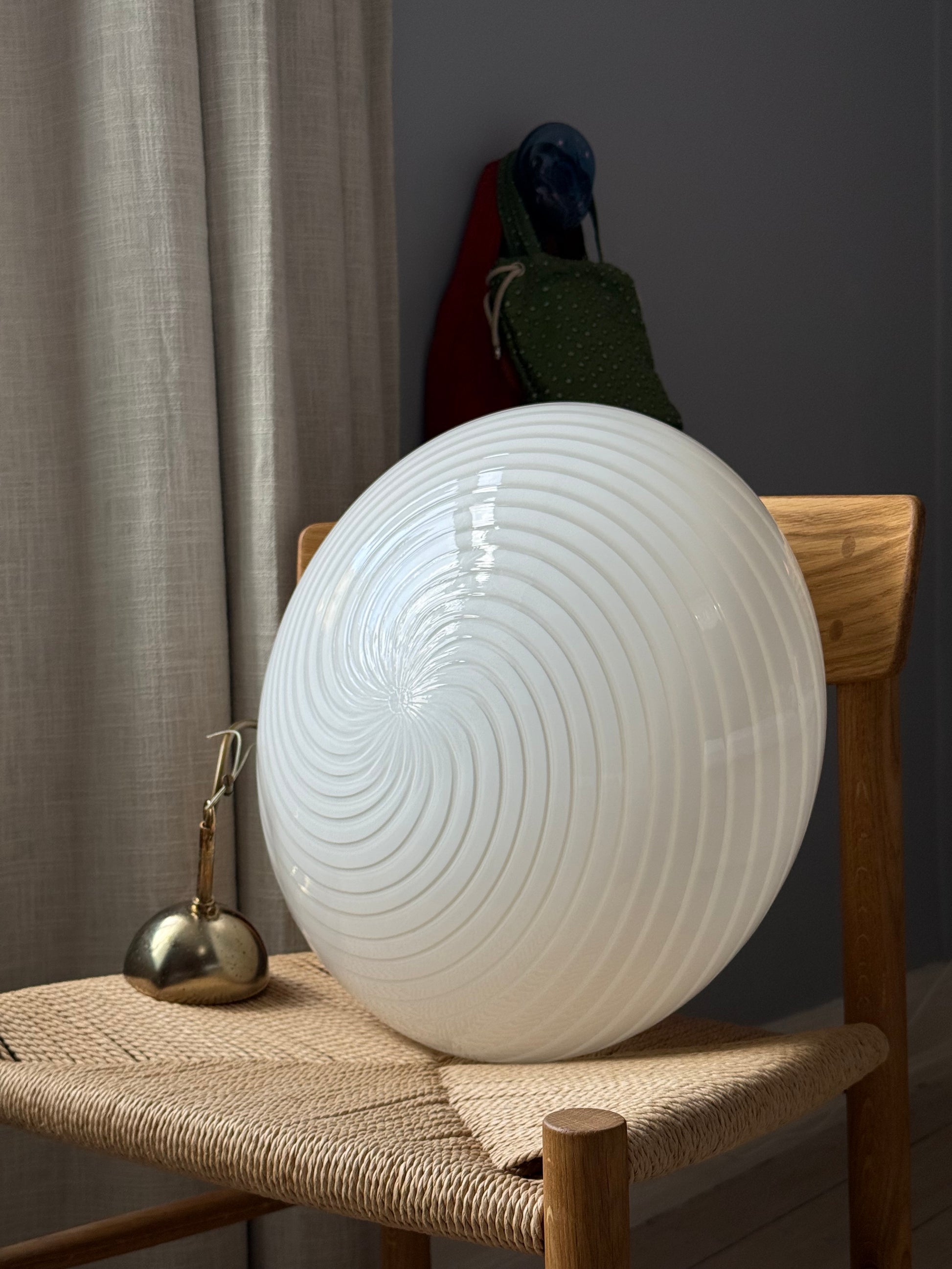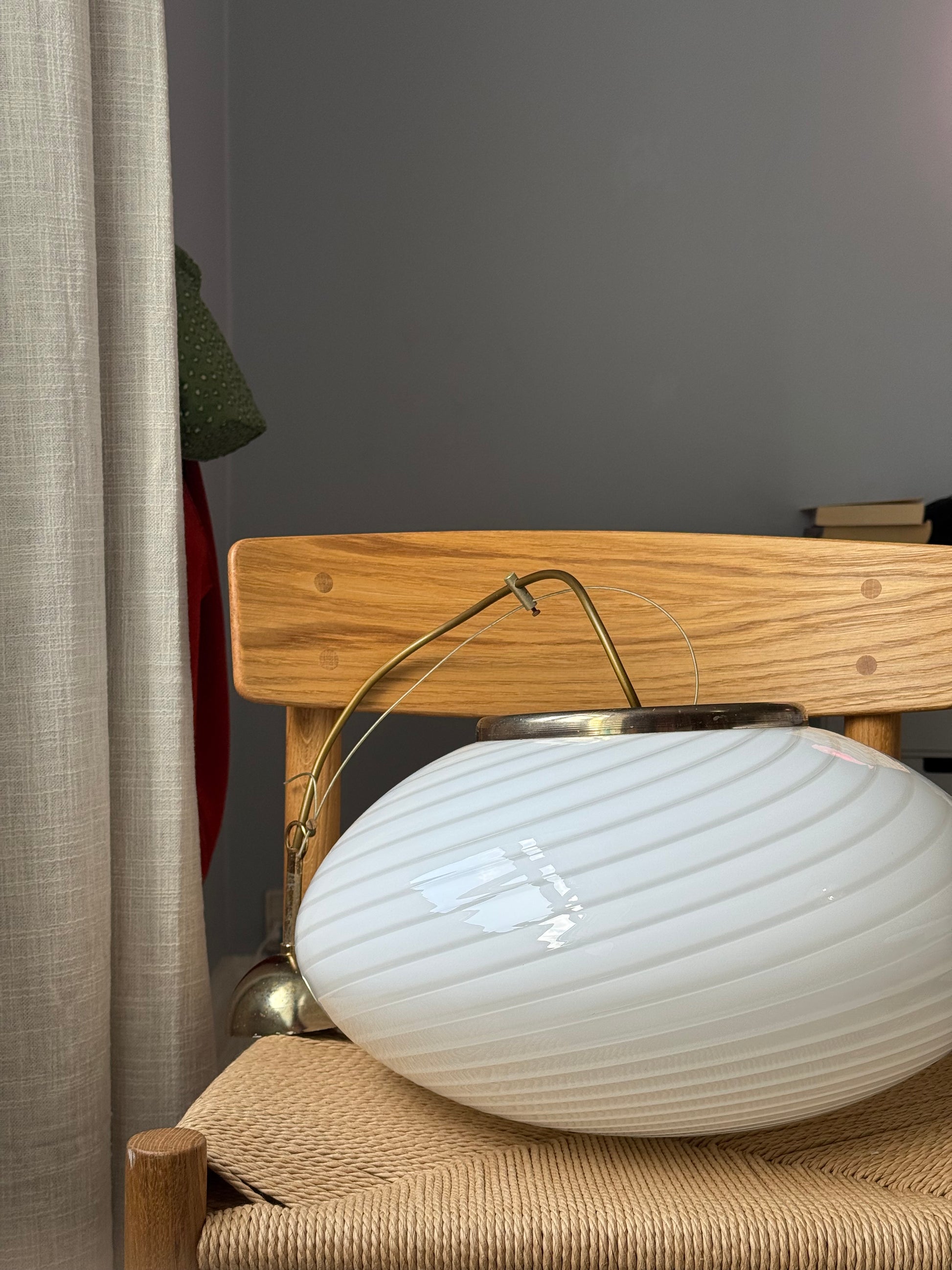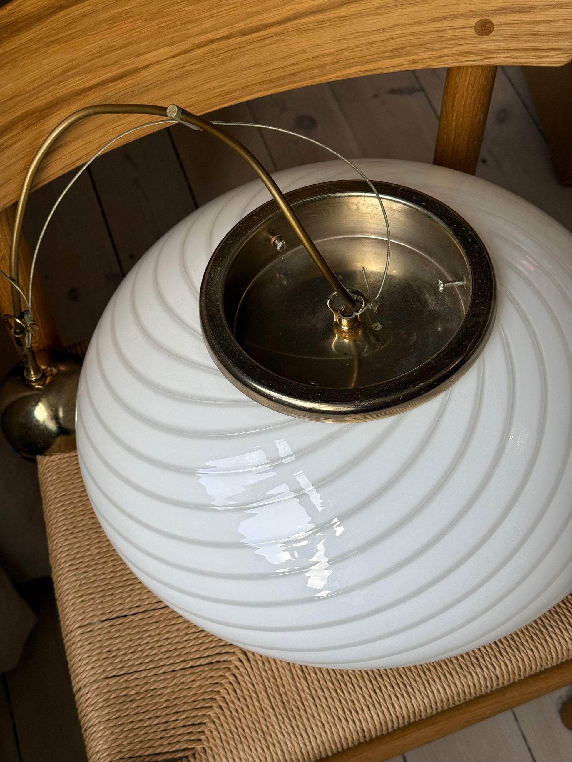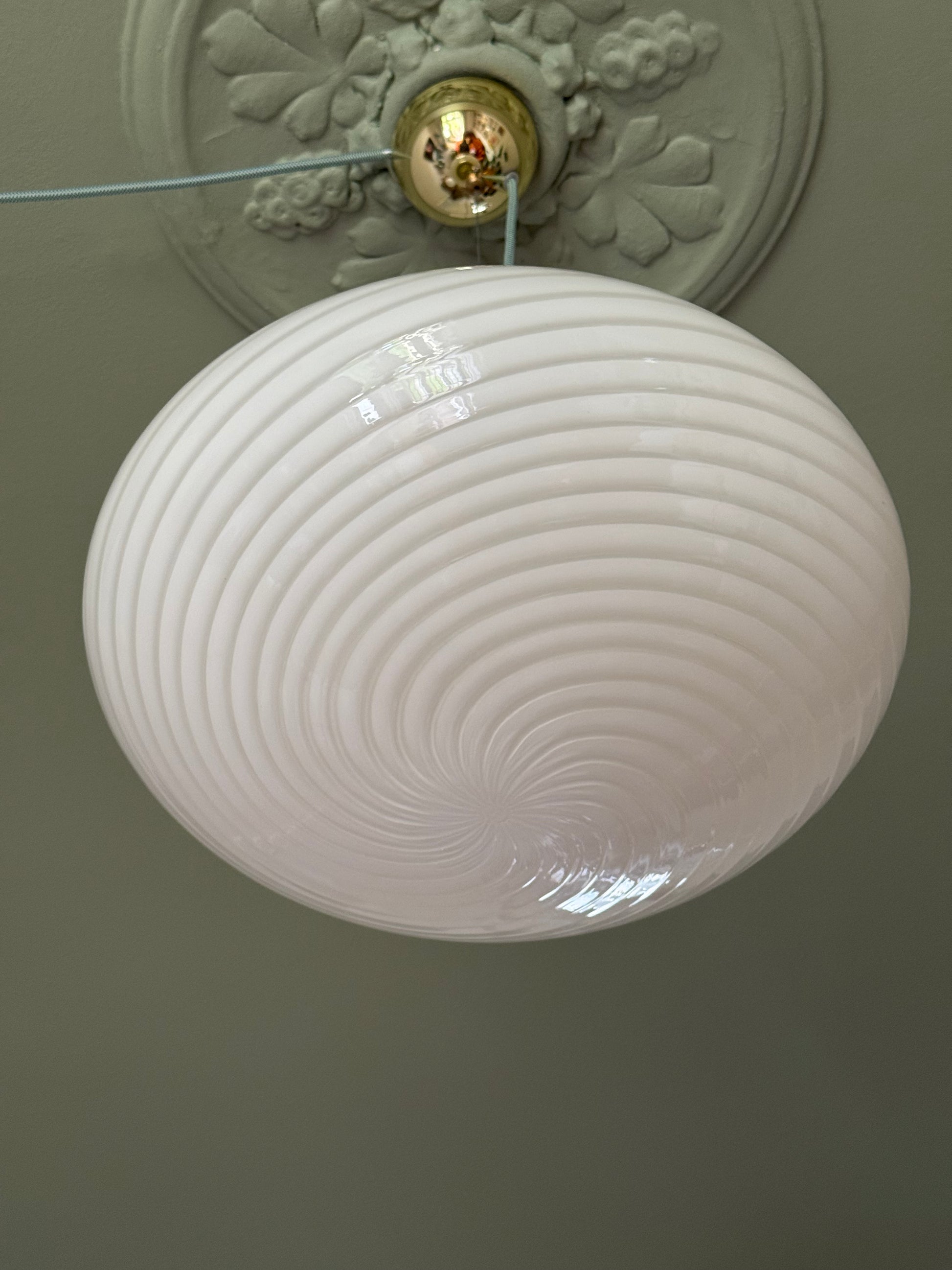 Den perfekte lampe til den lille stue eller over køkkenbordet. Lampen er en af typen Vetri de Murano, som kendetegnes på den meget tydelige og fine afslutning hvor glaspiben har siddet på. Lampen her kommer med afdæmpet og platineret messinggreb og måler 40cm i bredden og 22cm i højden.