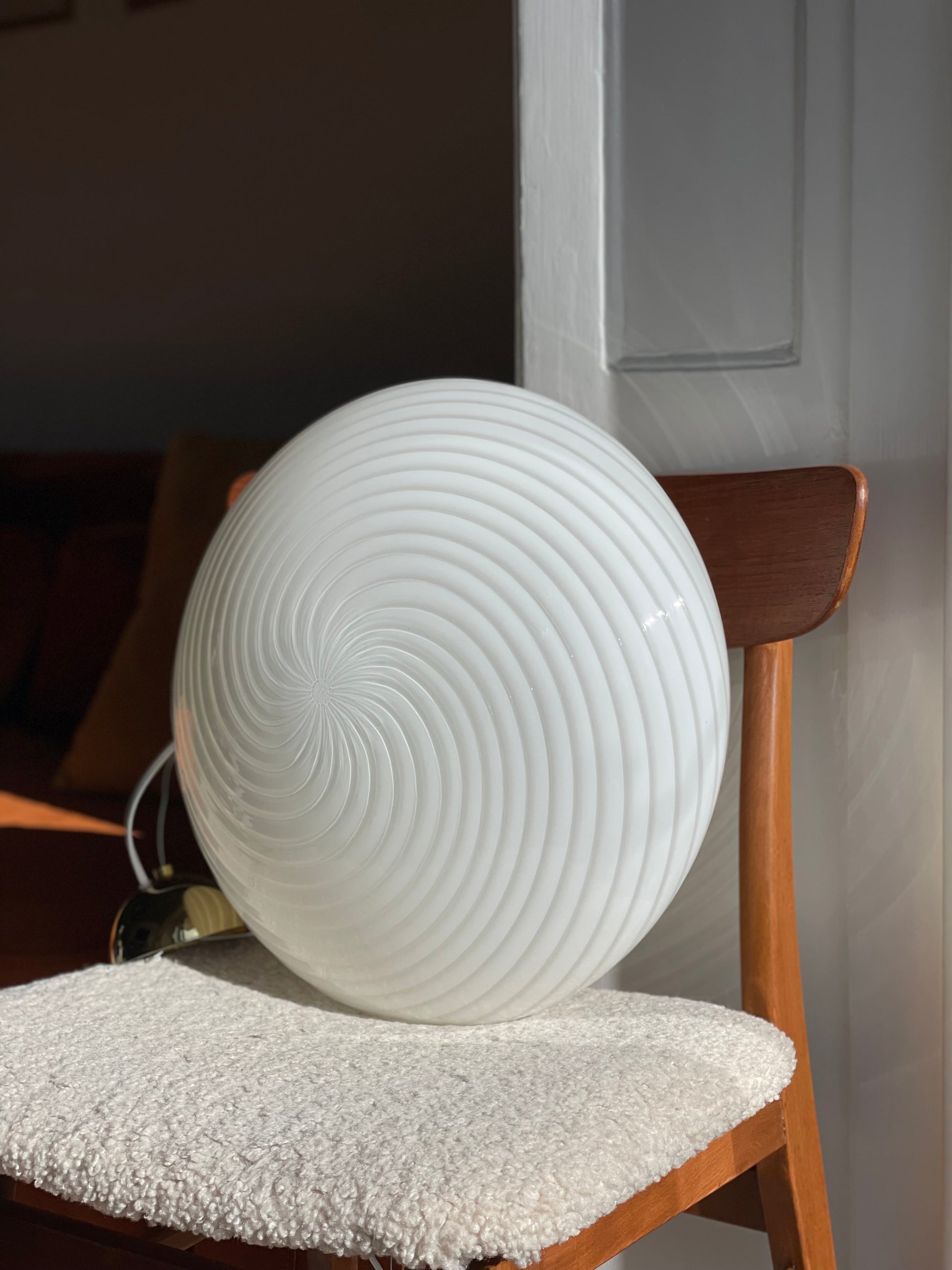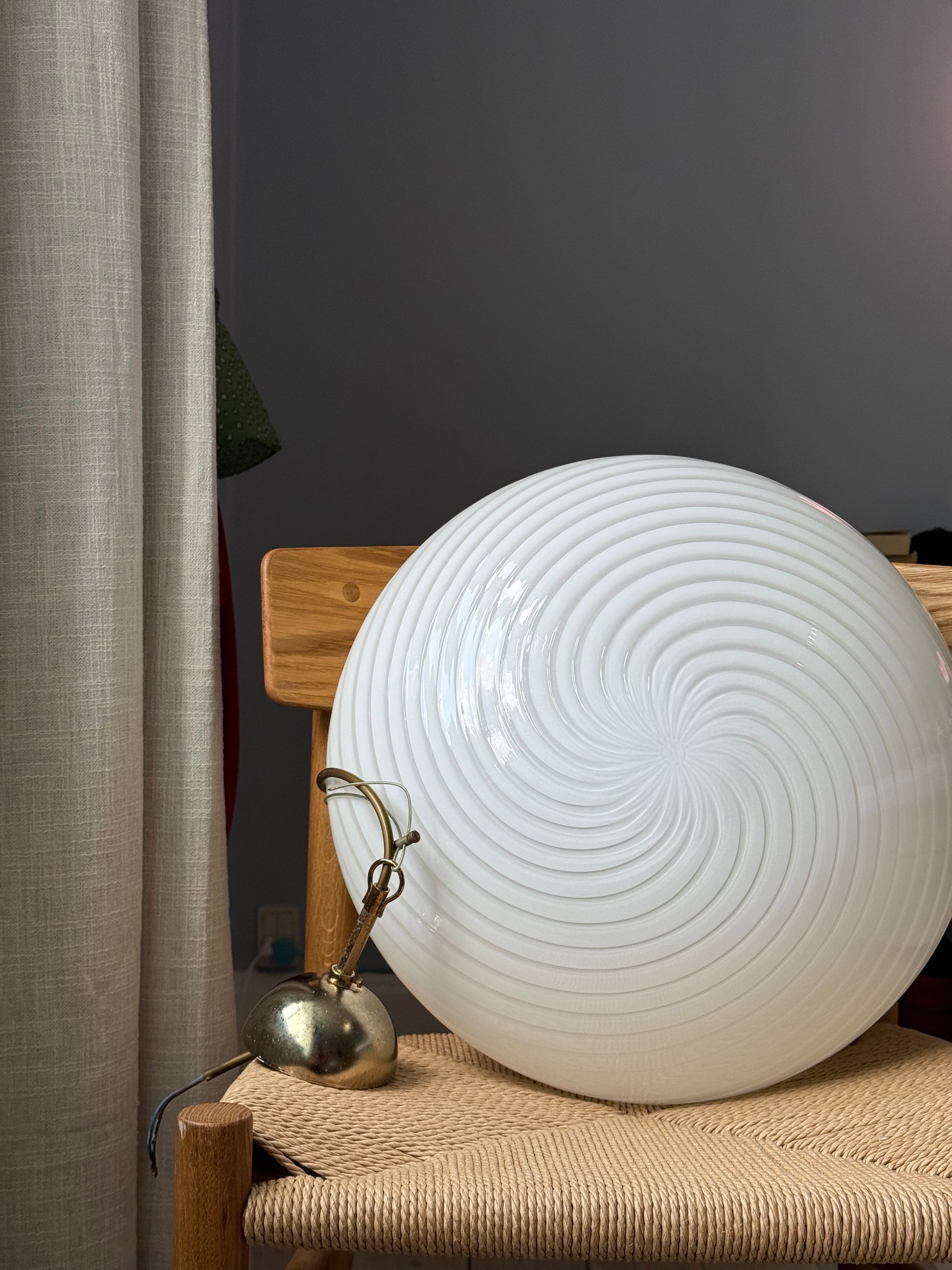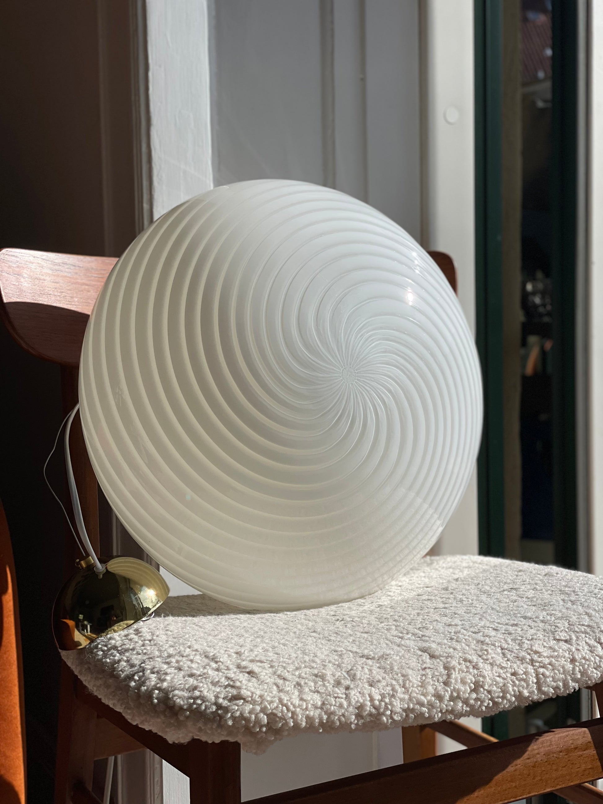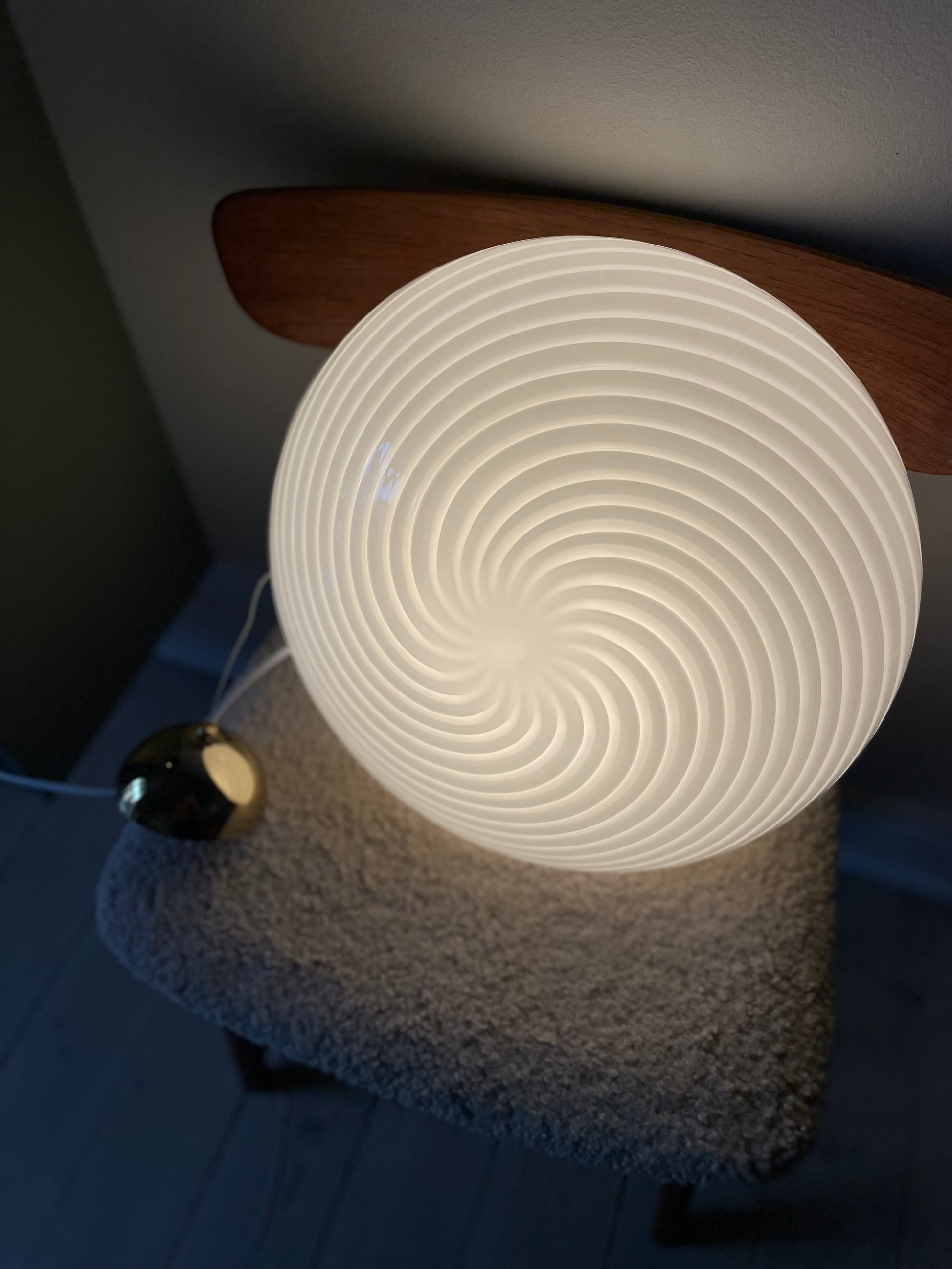 Den perfekte lampe til den lille stue eller over køkkenbordet. Lampen er en af typen Vetri de Murano, som kendetegnes på den meget tydelige og fine afslutning hvor glaspiben har siddet på. Lampen her kommer med afdæmpet og platineret messinggreb og måler 40cm i bredden og 22cm i højden.