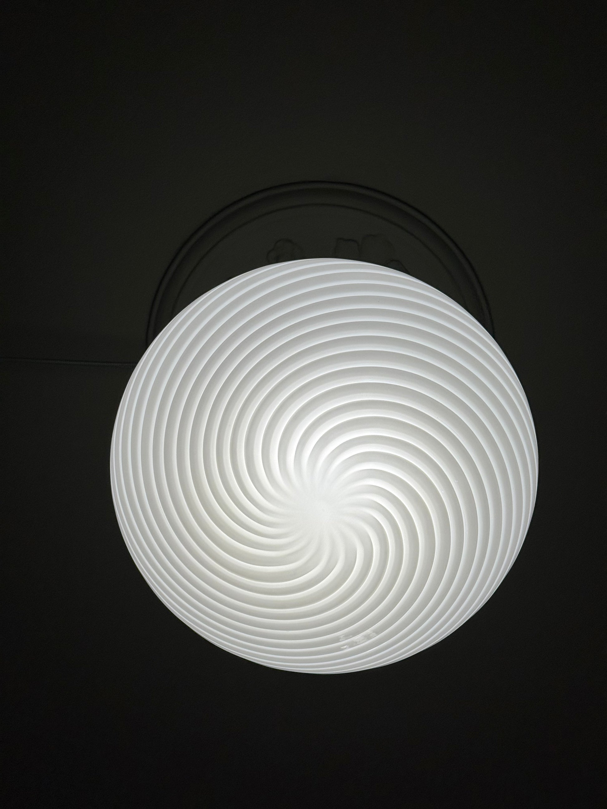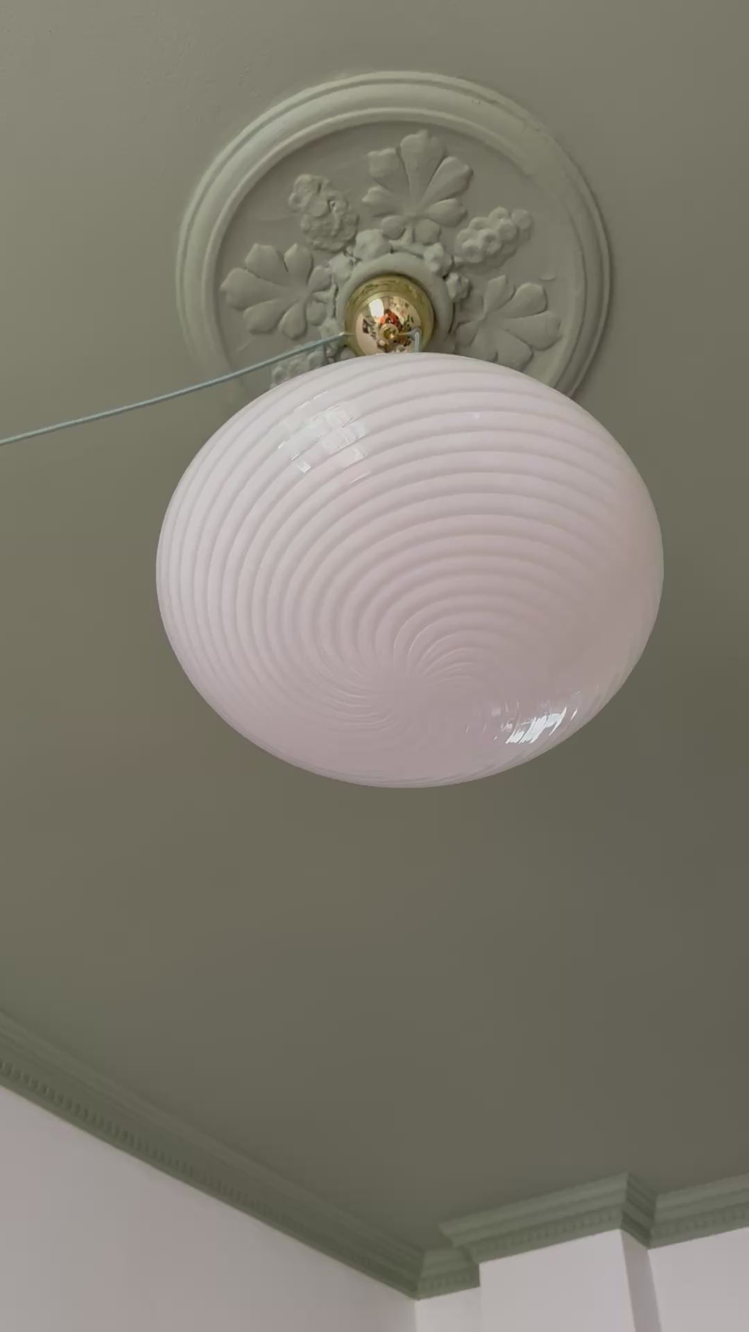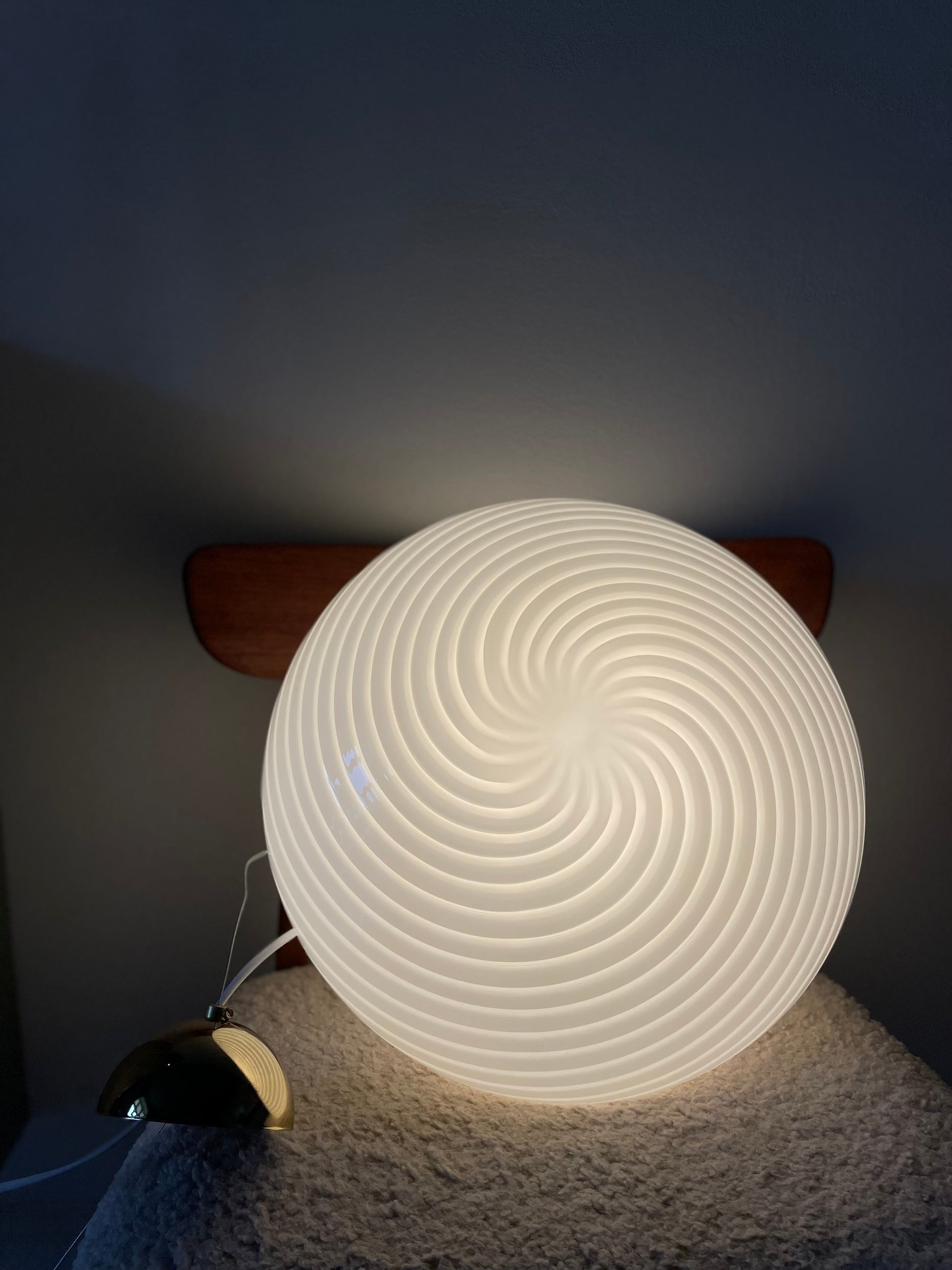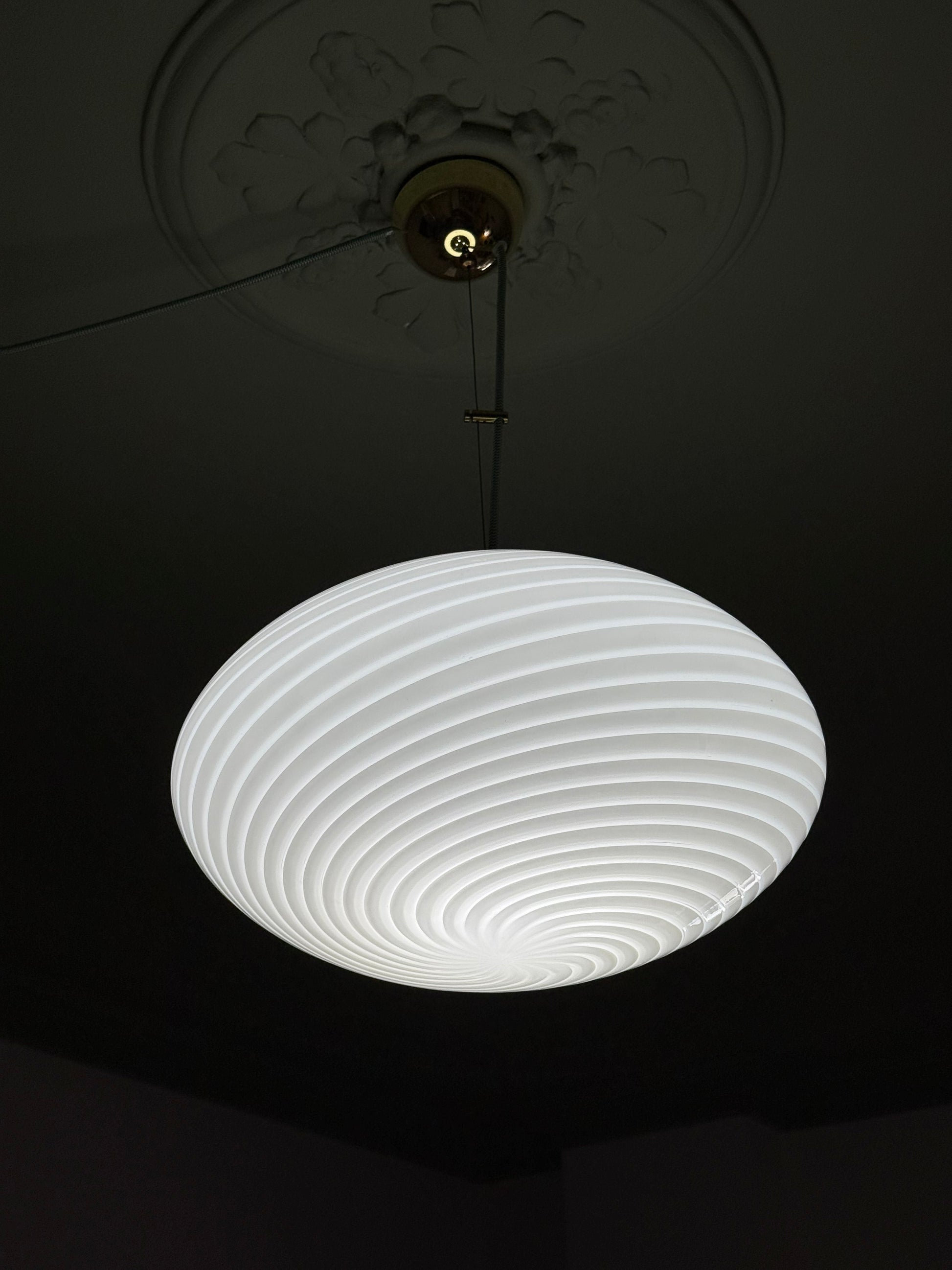 Den perfekte lampe til den lille stue eller over køkkenbordet. Lampen er en af typen Vetri de Murano, som kendetegnes på den meget tydelige og fine afslutning hvor glaspiben har siddet på. Lampen her kommer med afdæmpet og platineret messinggreb og måler 40cm i bredden og 22cm i højden.