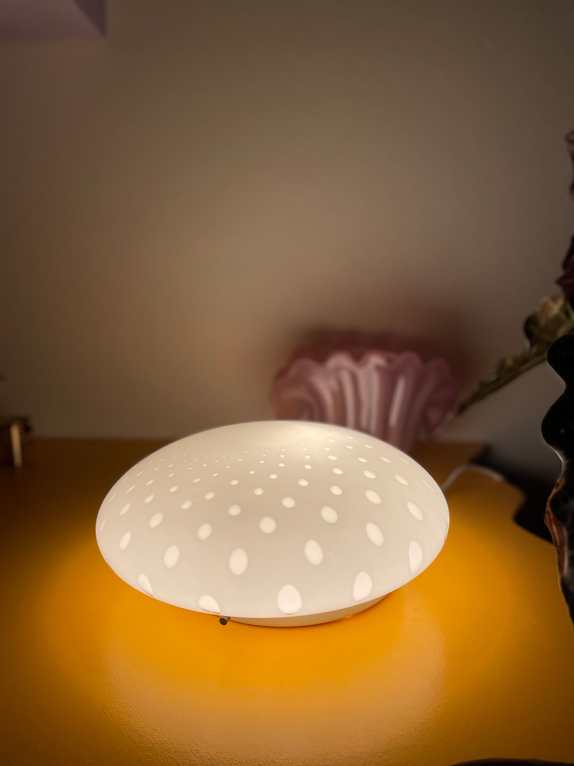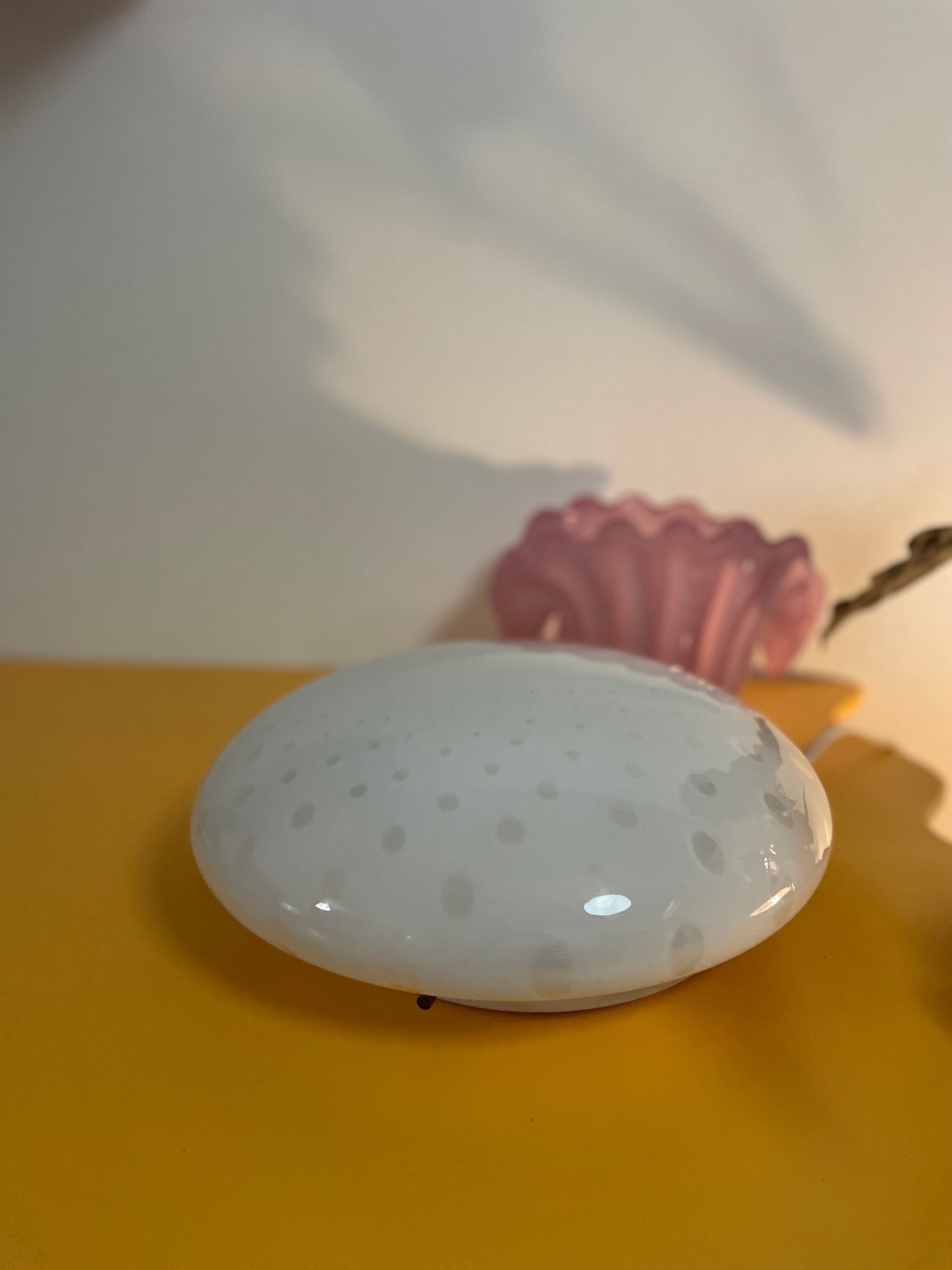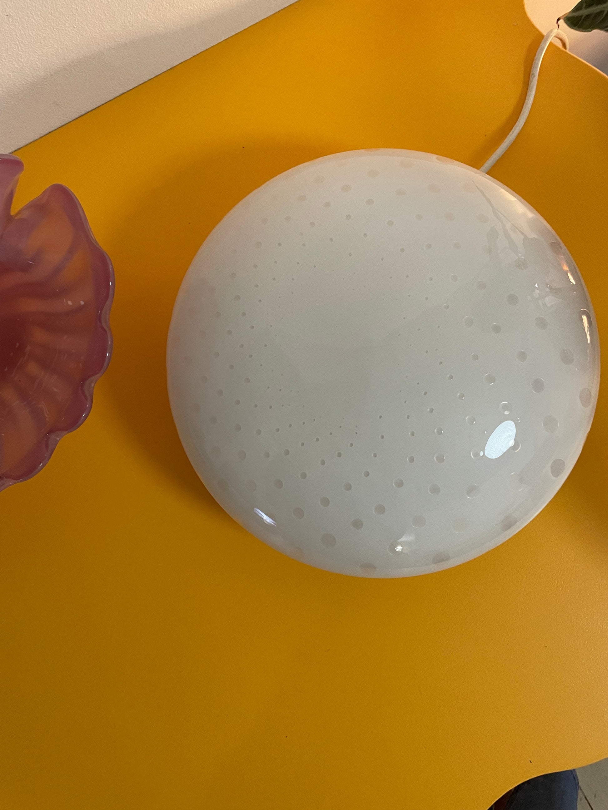 Smuk vintage Murano plafond til montering i loft eller på væg. Lampen kommer i hvidt glas og ligner næsten en måne når den tændes. Den bruger et styk e27 pære og kommer med hvid base. Den måler 29cm i bredden og 12cm i højden.