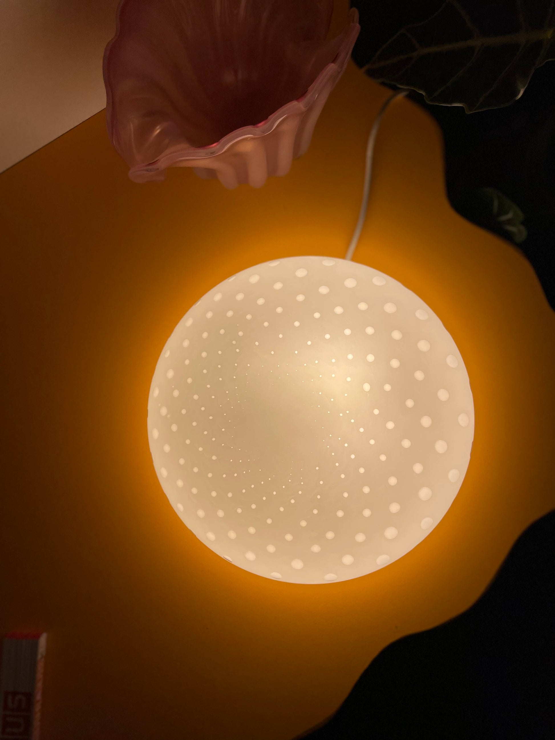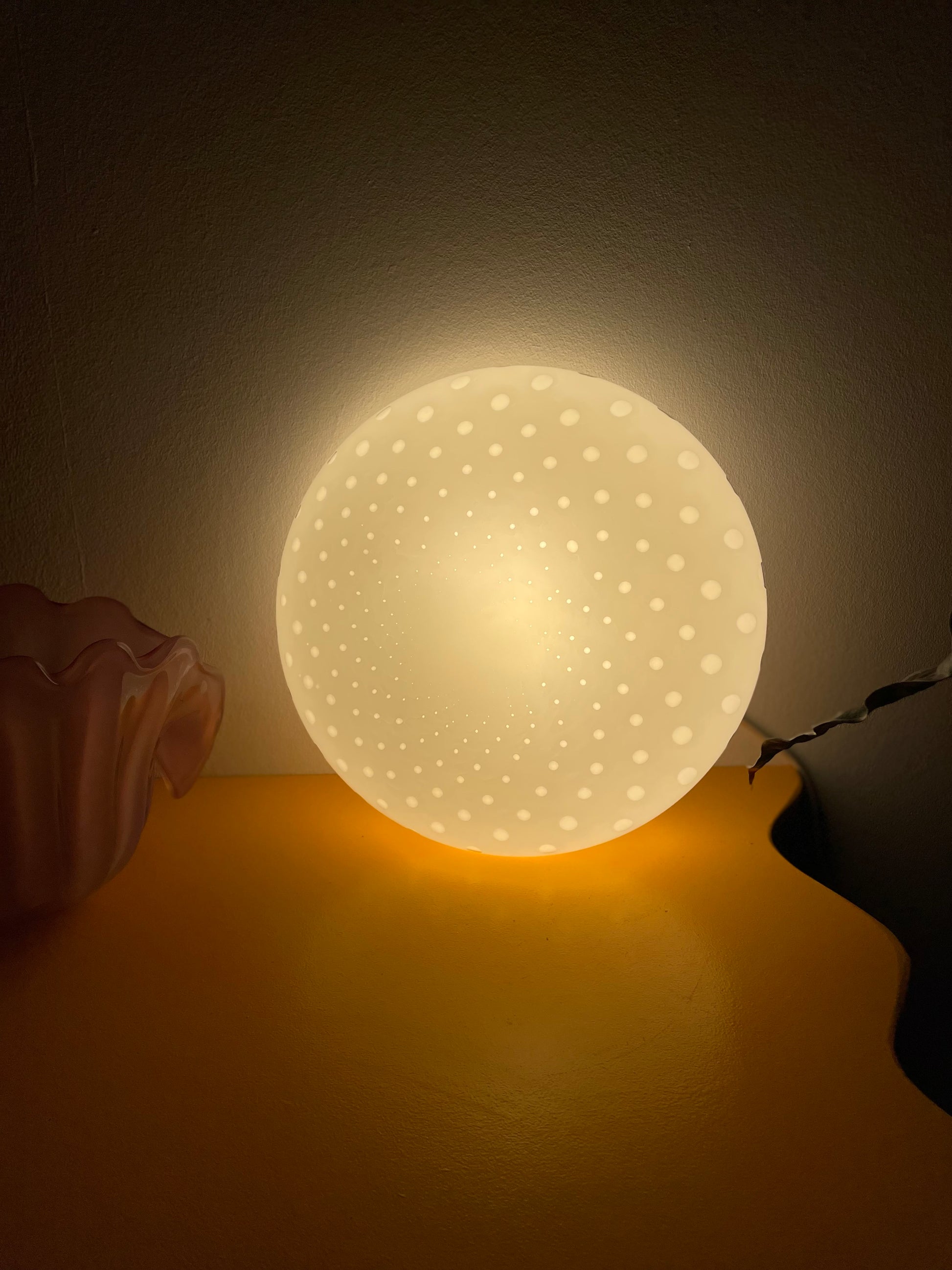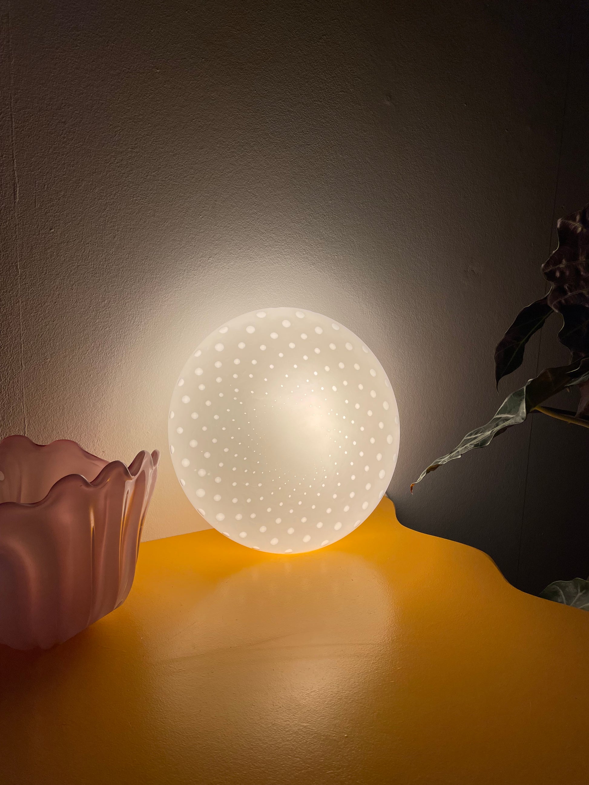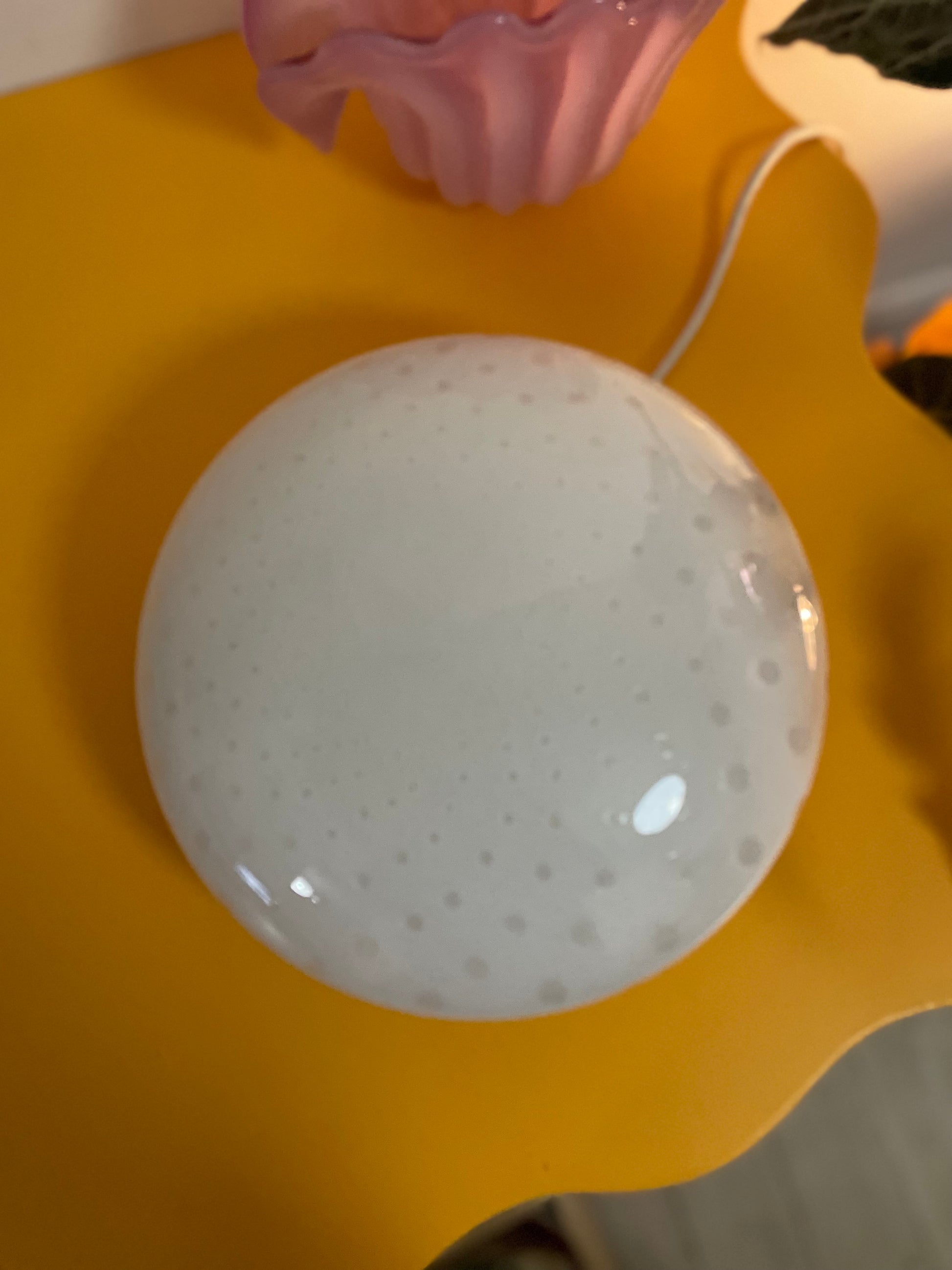 Smuk vintage Murano plafond til montering i loft eller på væg. Lampen kommer i hvidt glas og ligner næsten en måne når den tændes. Den bruger et styk e27 pære og kommer med hvid base. Den måler 29cm i bredden og 12cm i højden.