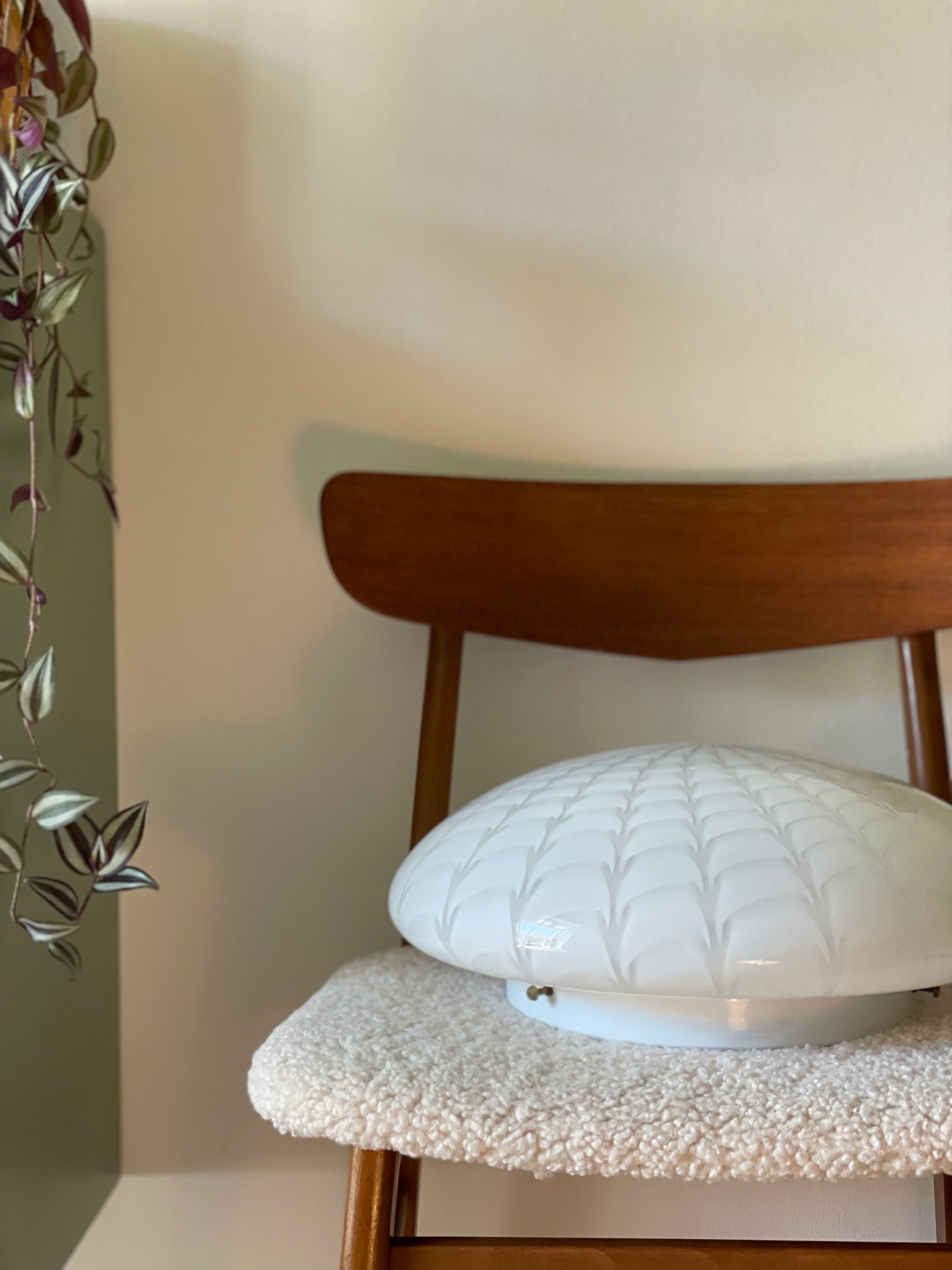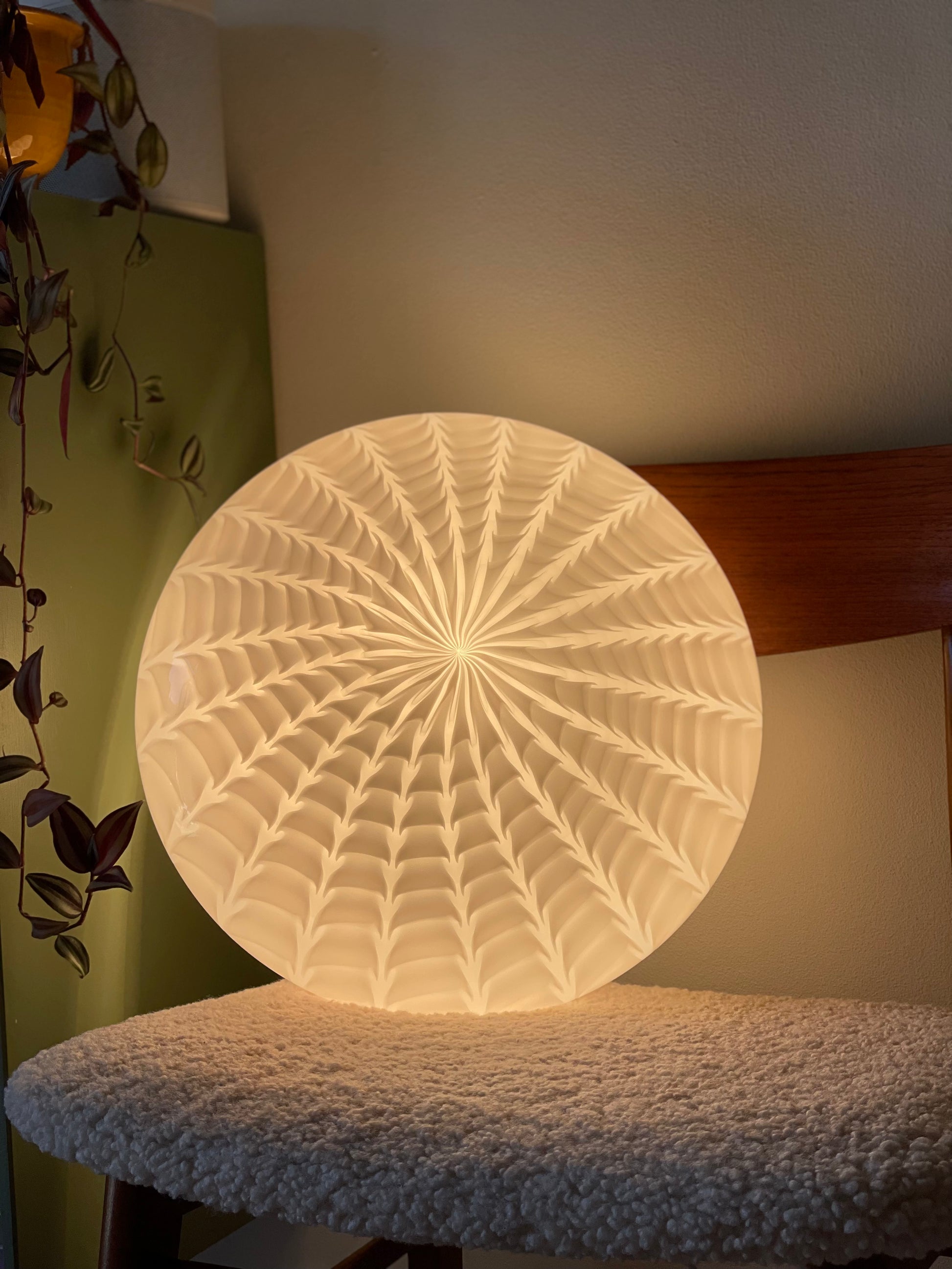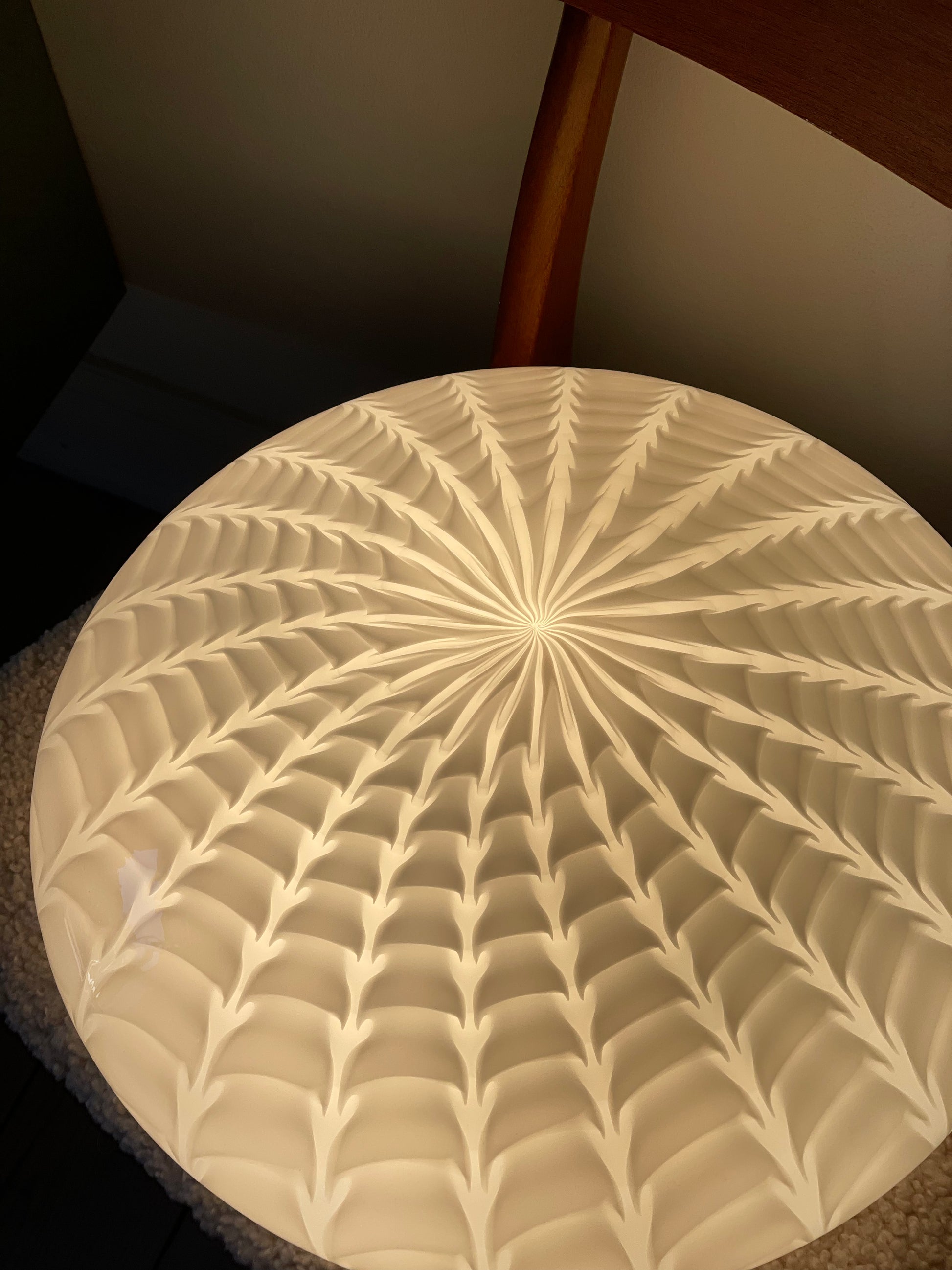 Unik vintage Murano Peacock plafond til opsætning på væggen eller i loftet. Denne lampe måler 38cm i diameter og 15cm i højden. Lampen kommer med 2x E27 fatninger og en hvid base.