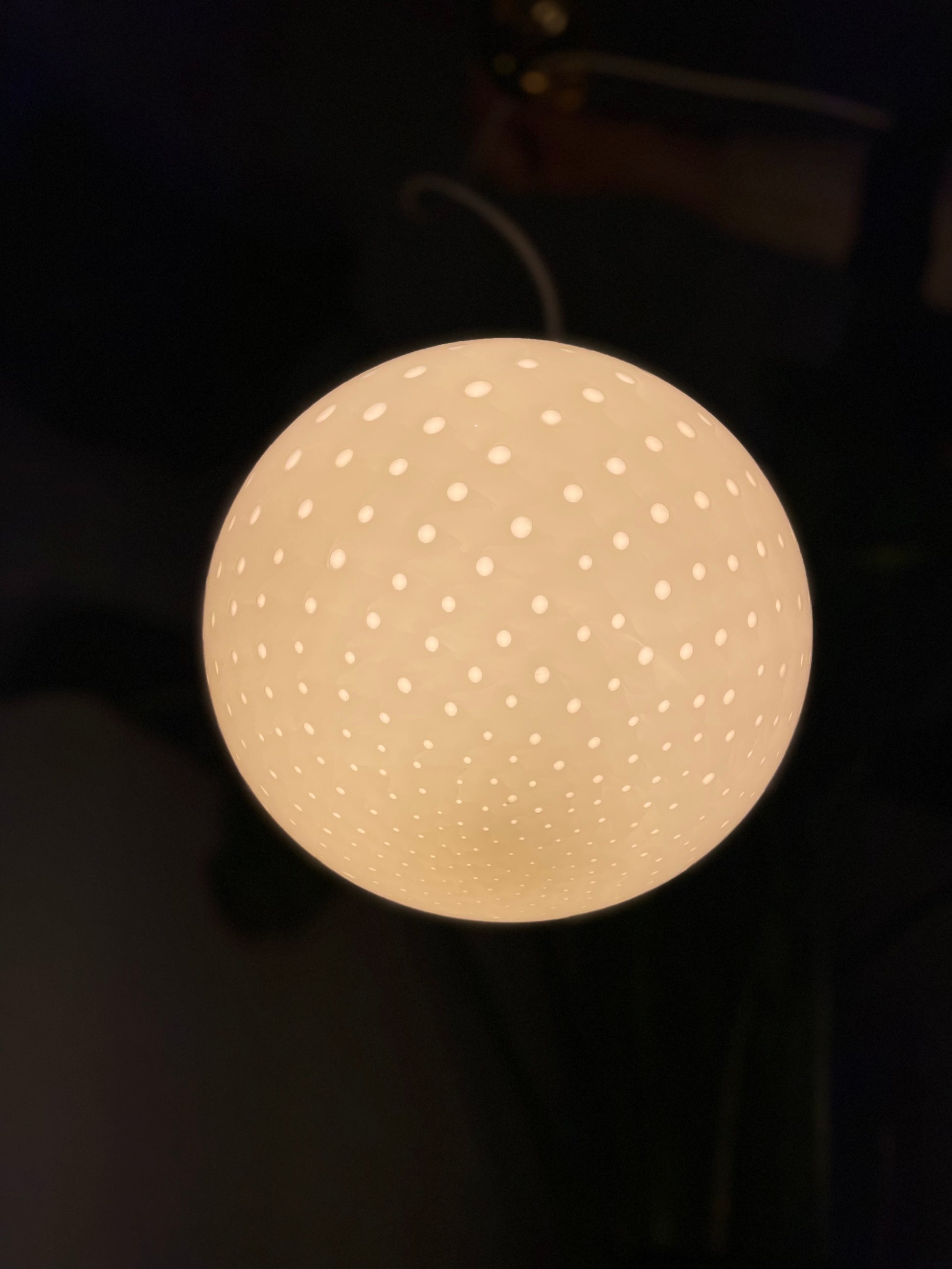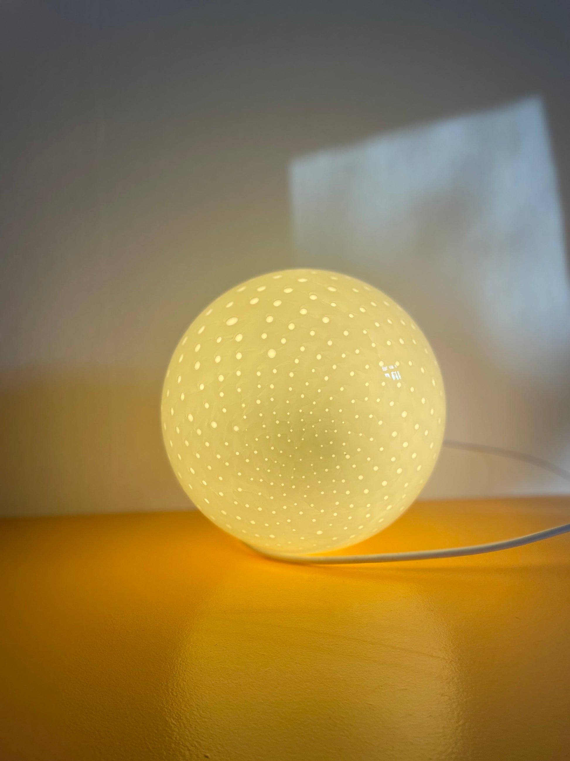 Lampen er let oval k formen, måler 23cm i bredden og kommer med messinggreb.