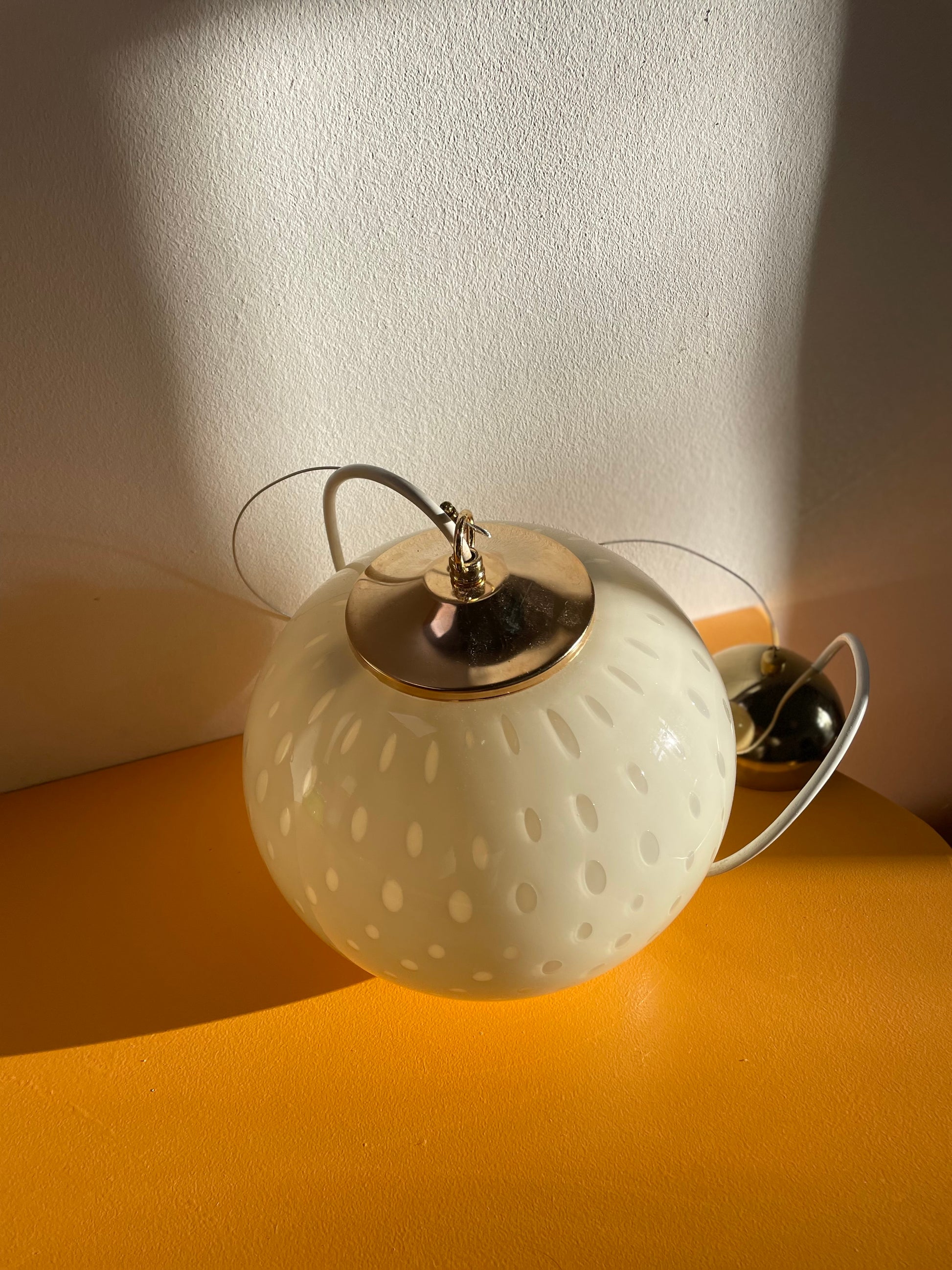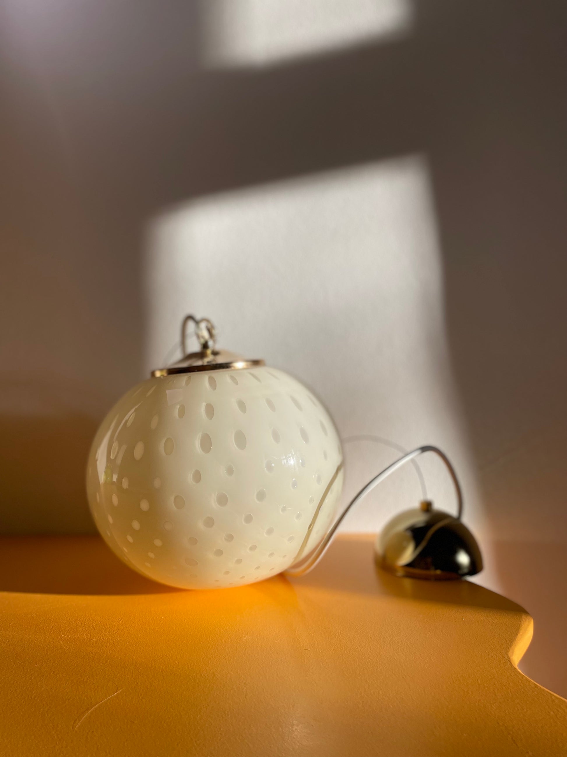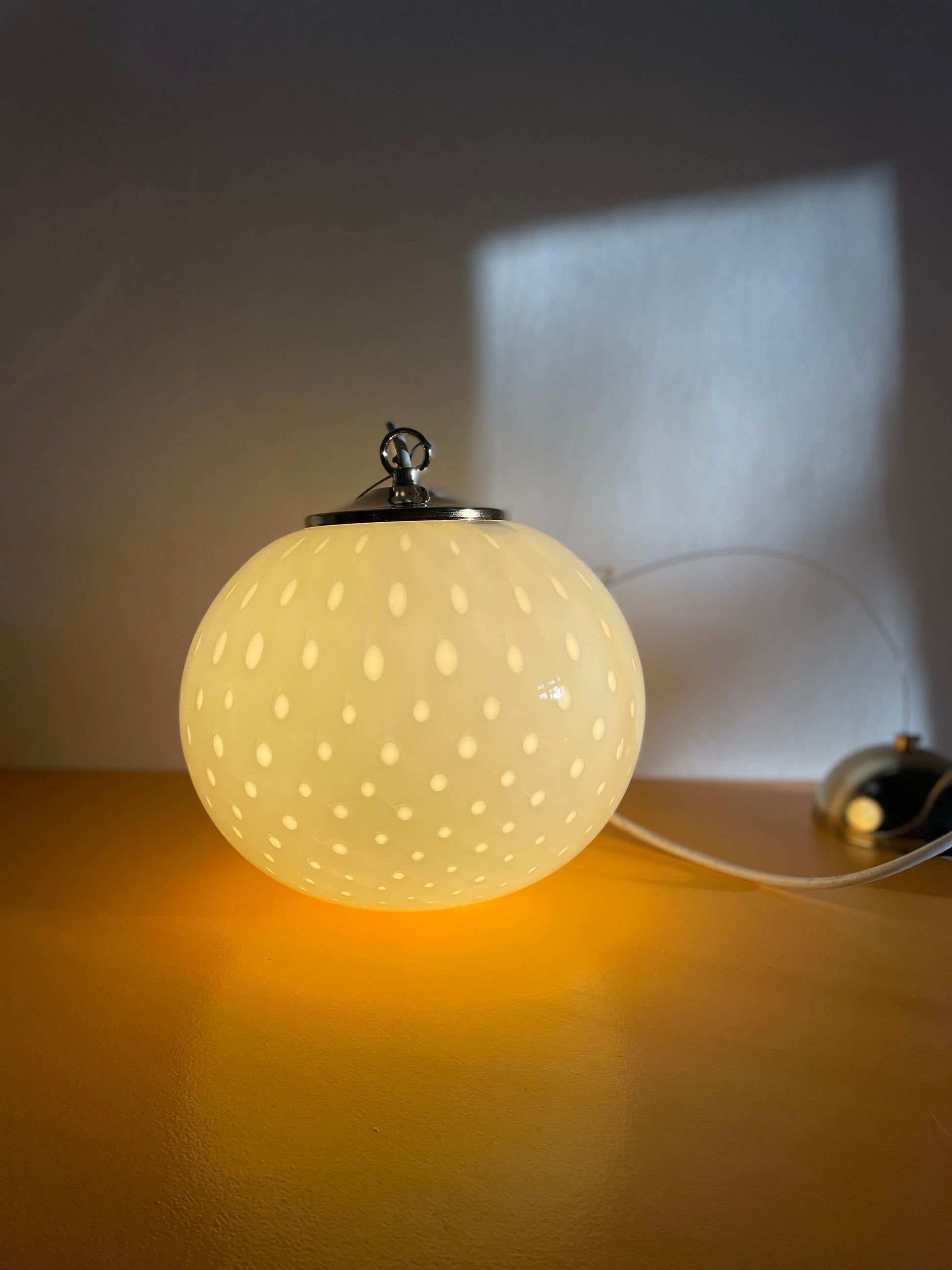 Vintage Murano pendel loftlampe i gult Murano glas med pletter, der får lampen til at ligne en fuldmåne.