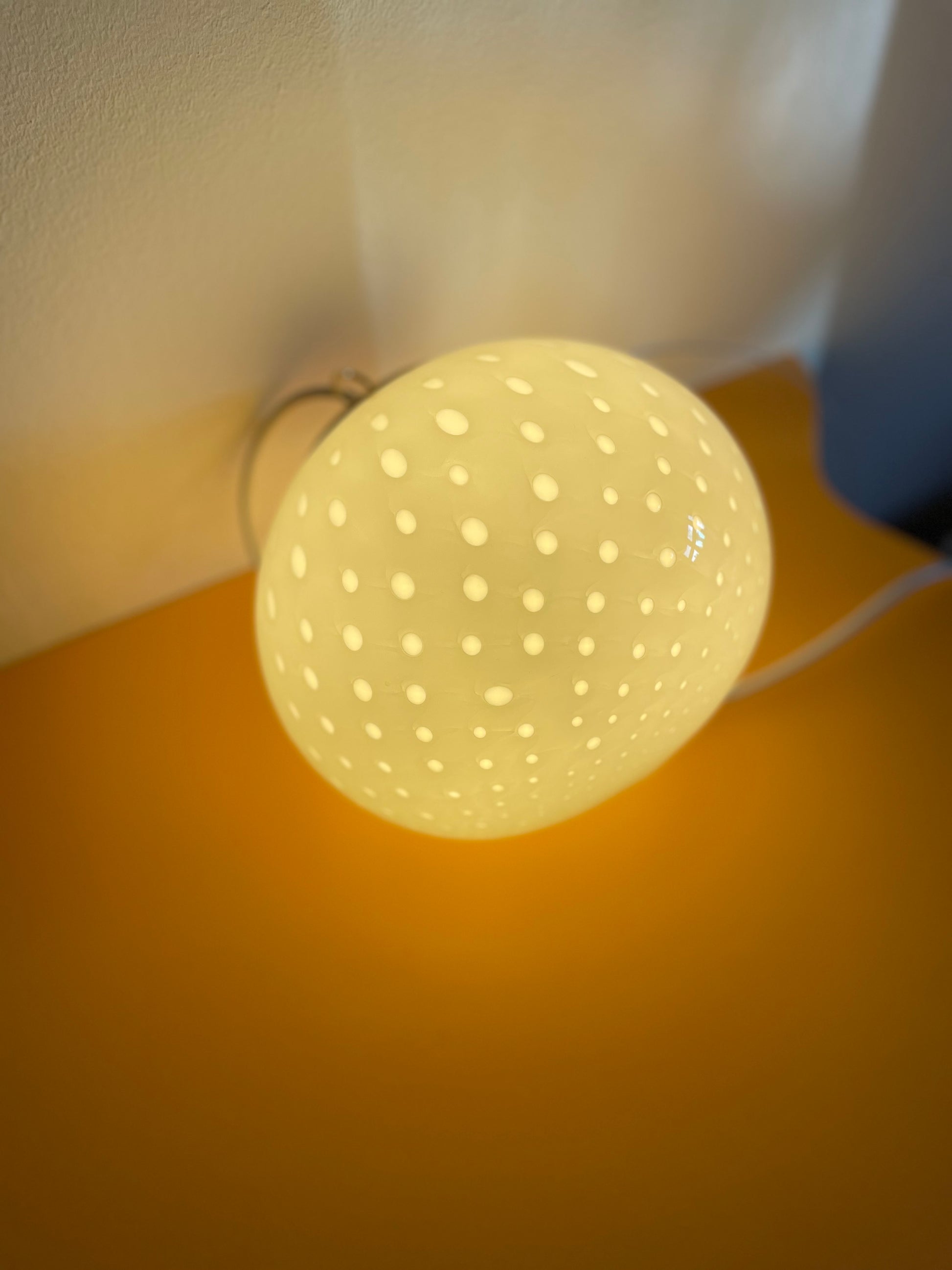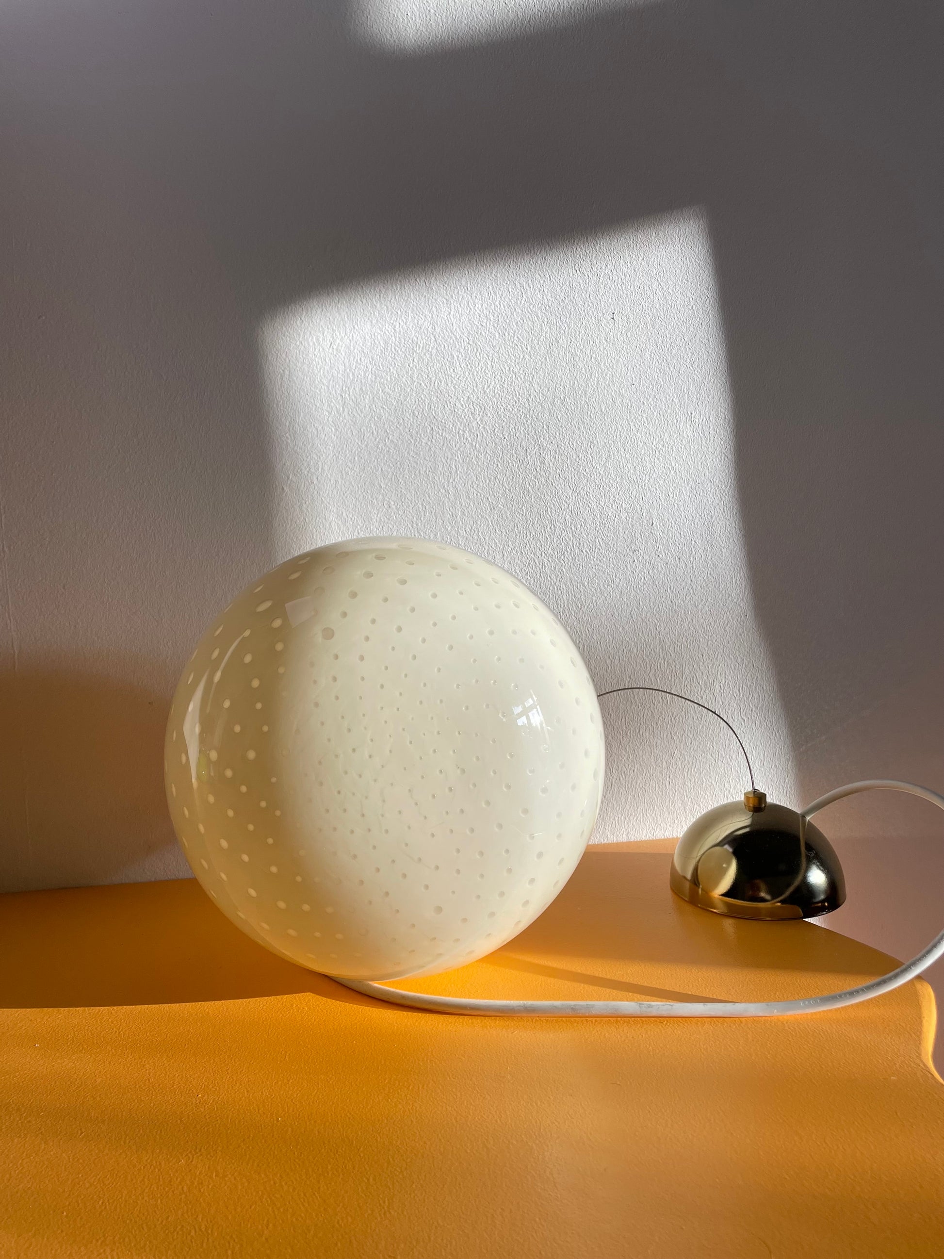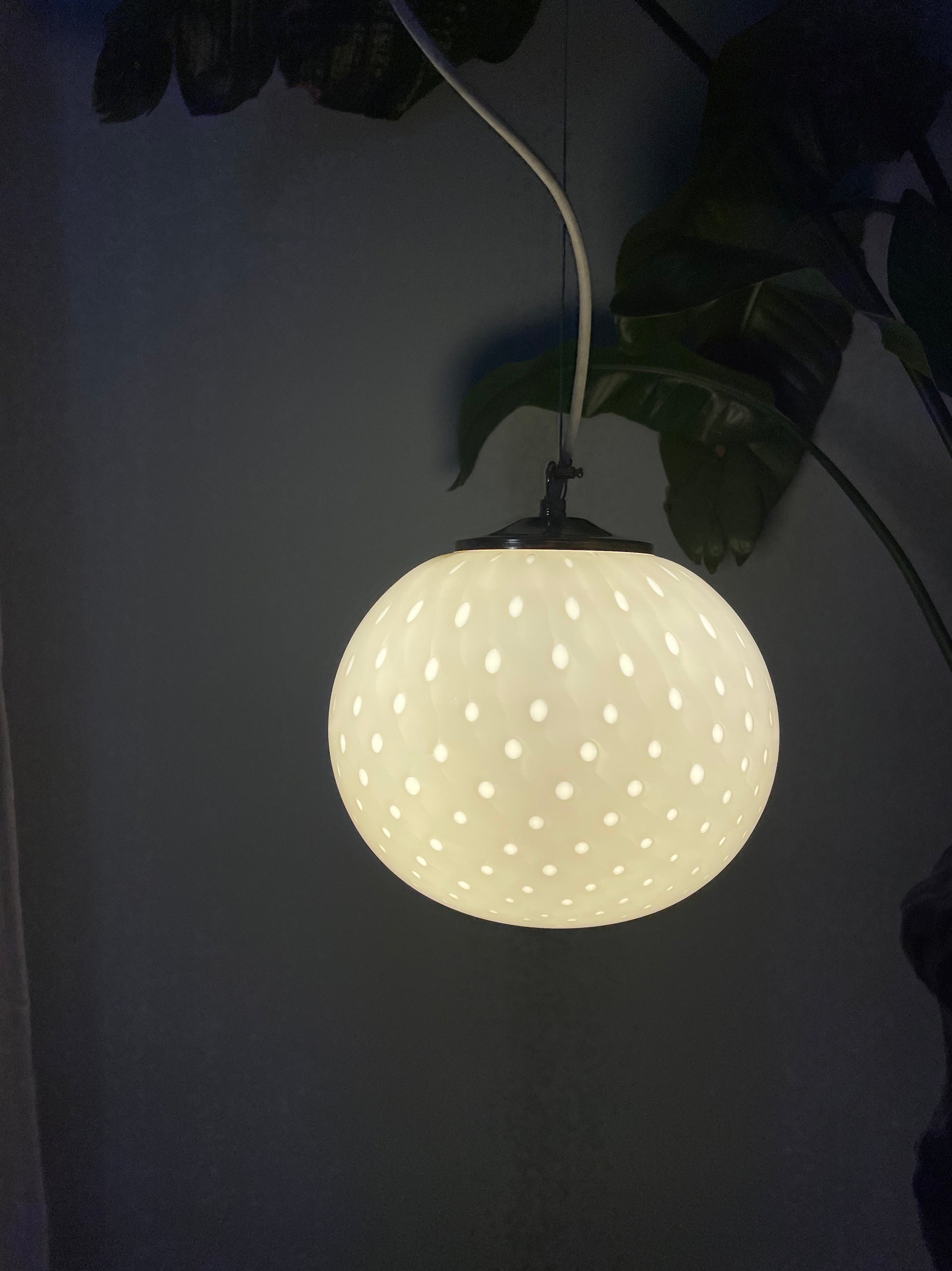 Vintage Murano pendel loftlampe i gult Murano glas med pletter, der får lampen til at ligne en fuldmåne.
