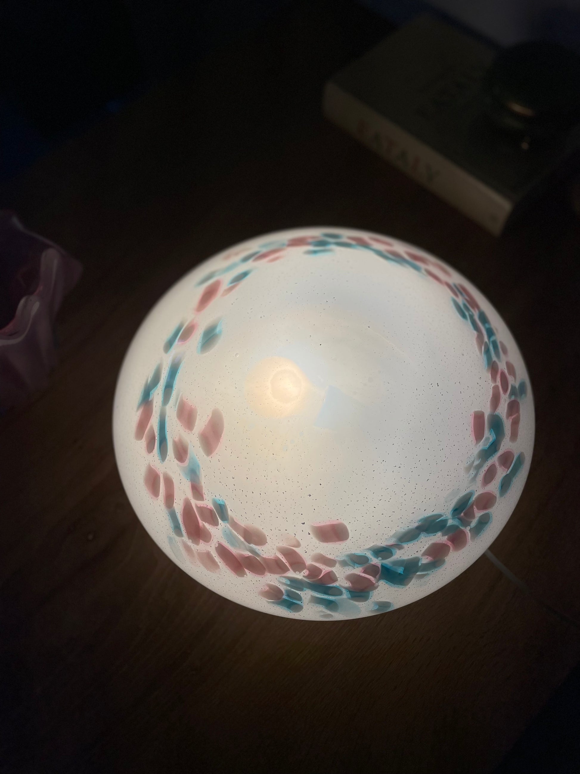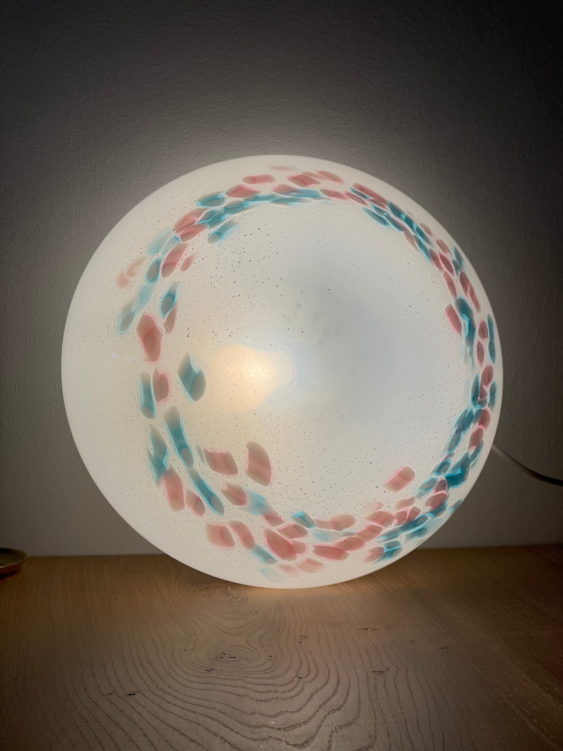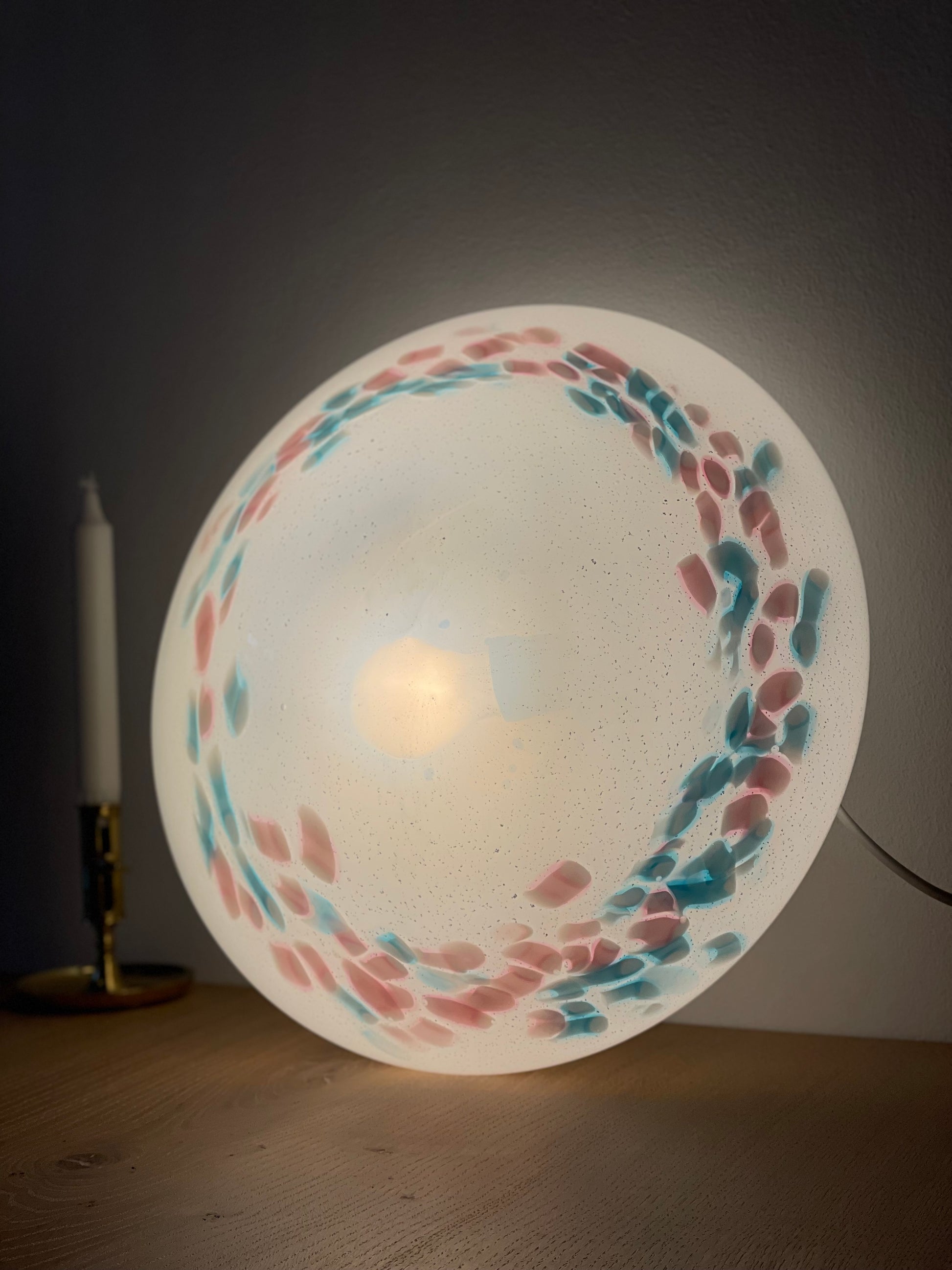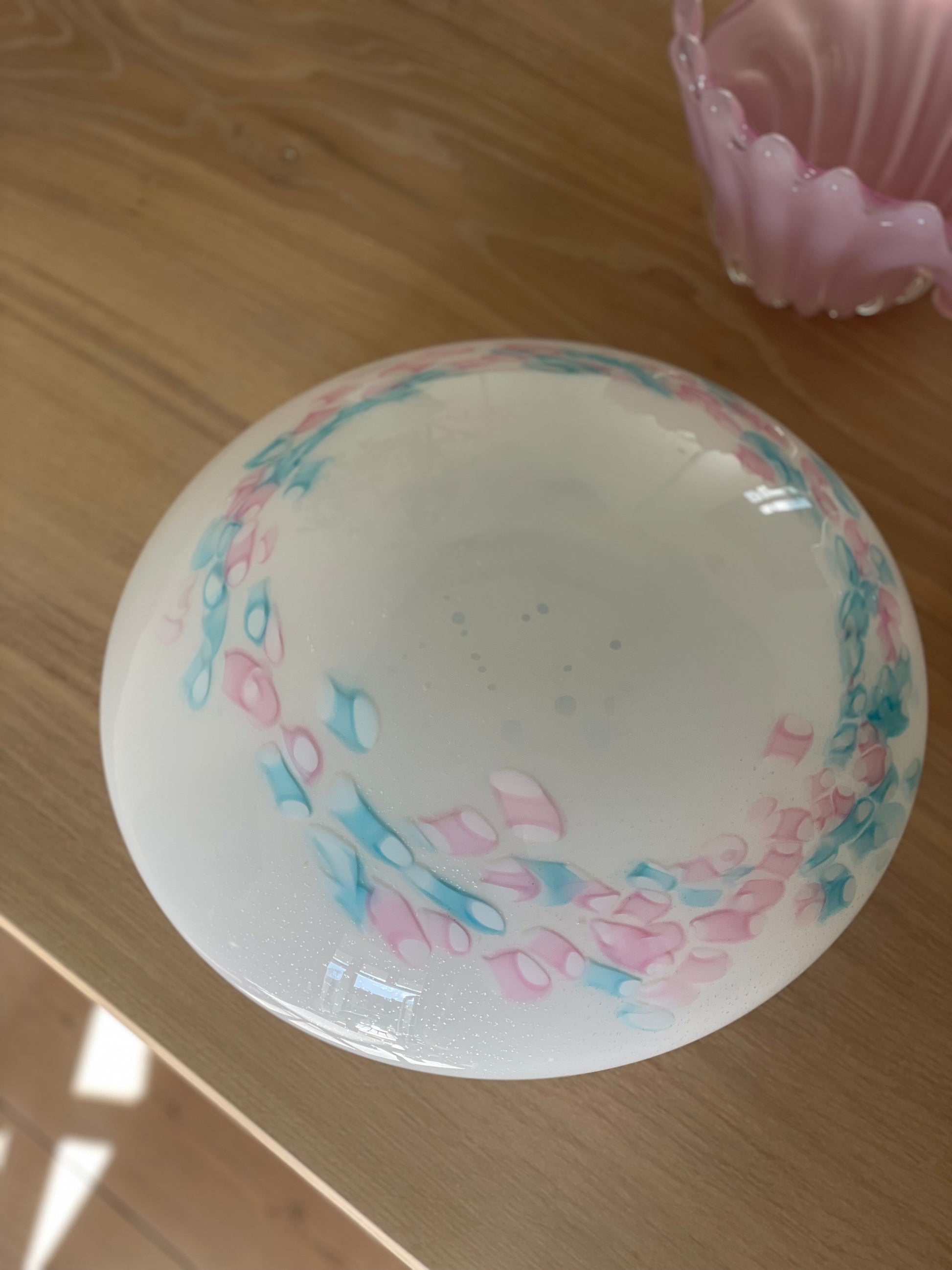 Plafond i hvidt vintage Murano glas med ægte sølv glimmer i glasset. Desuden har lampen lyserøde og lyseblå mønstring. Lampens glas er mere klart på midten, hvorfor pæren er synlig . Den måler 38cm i diameter, kommer med hvid base og bruger et styks e27 pære, Absolut charmerende!