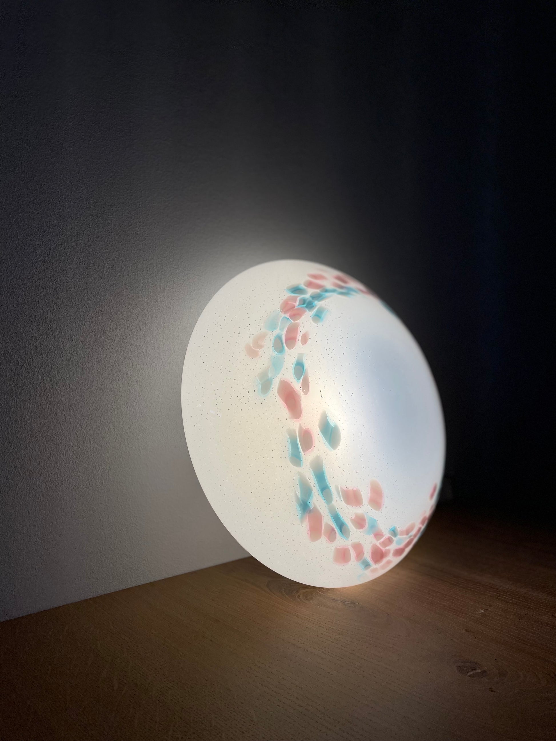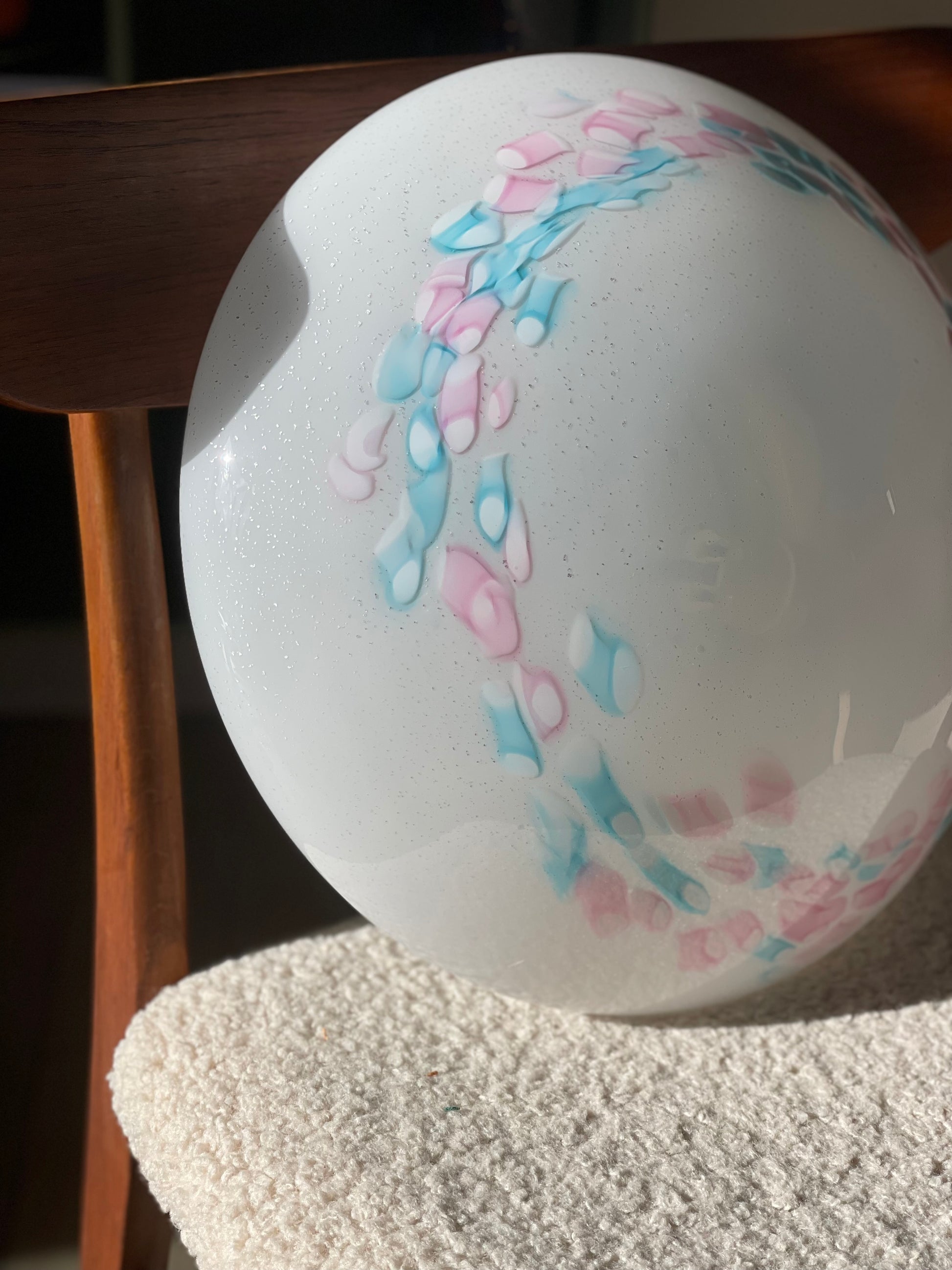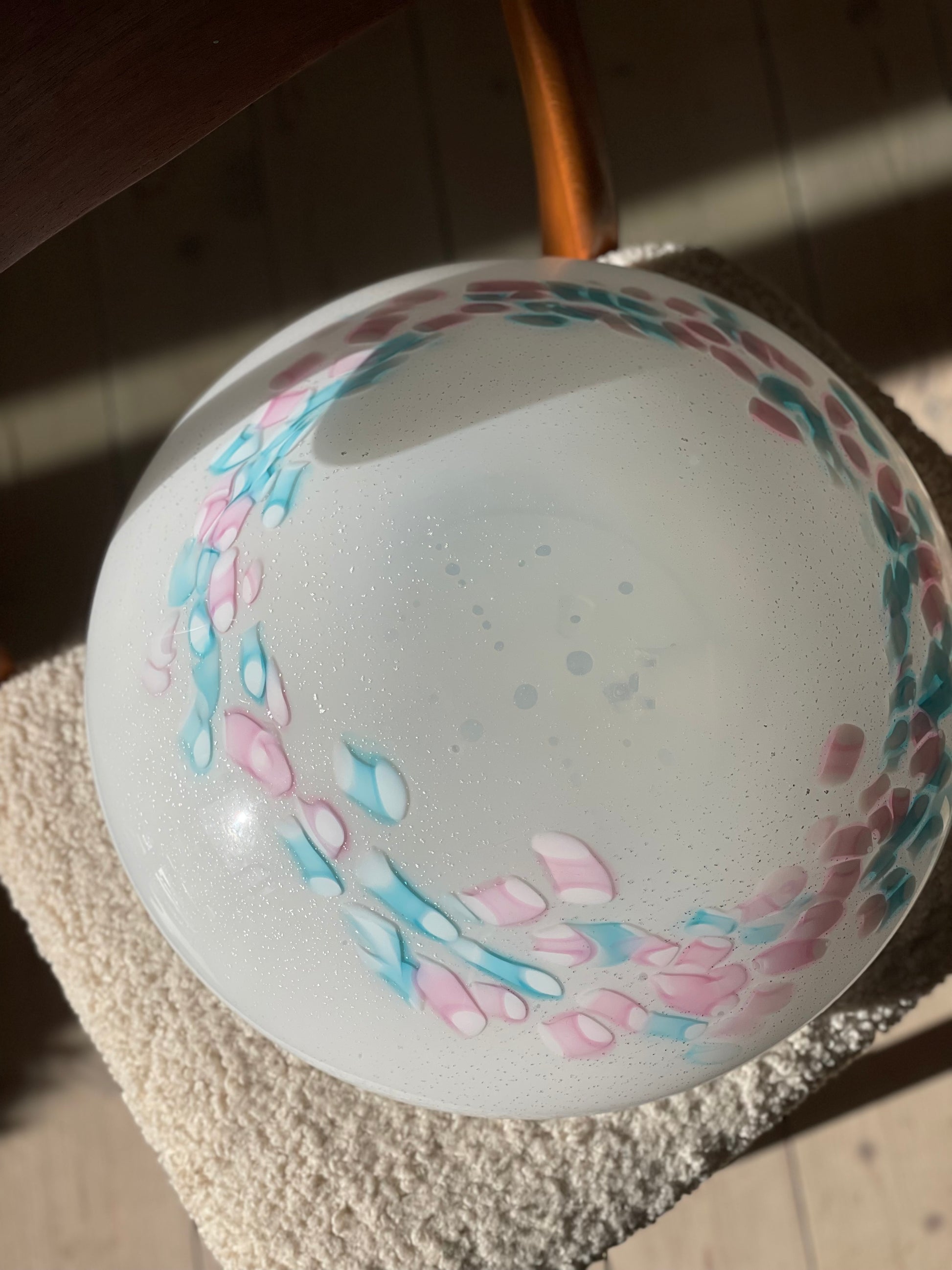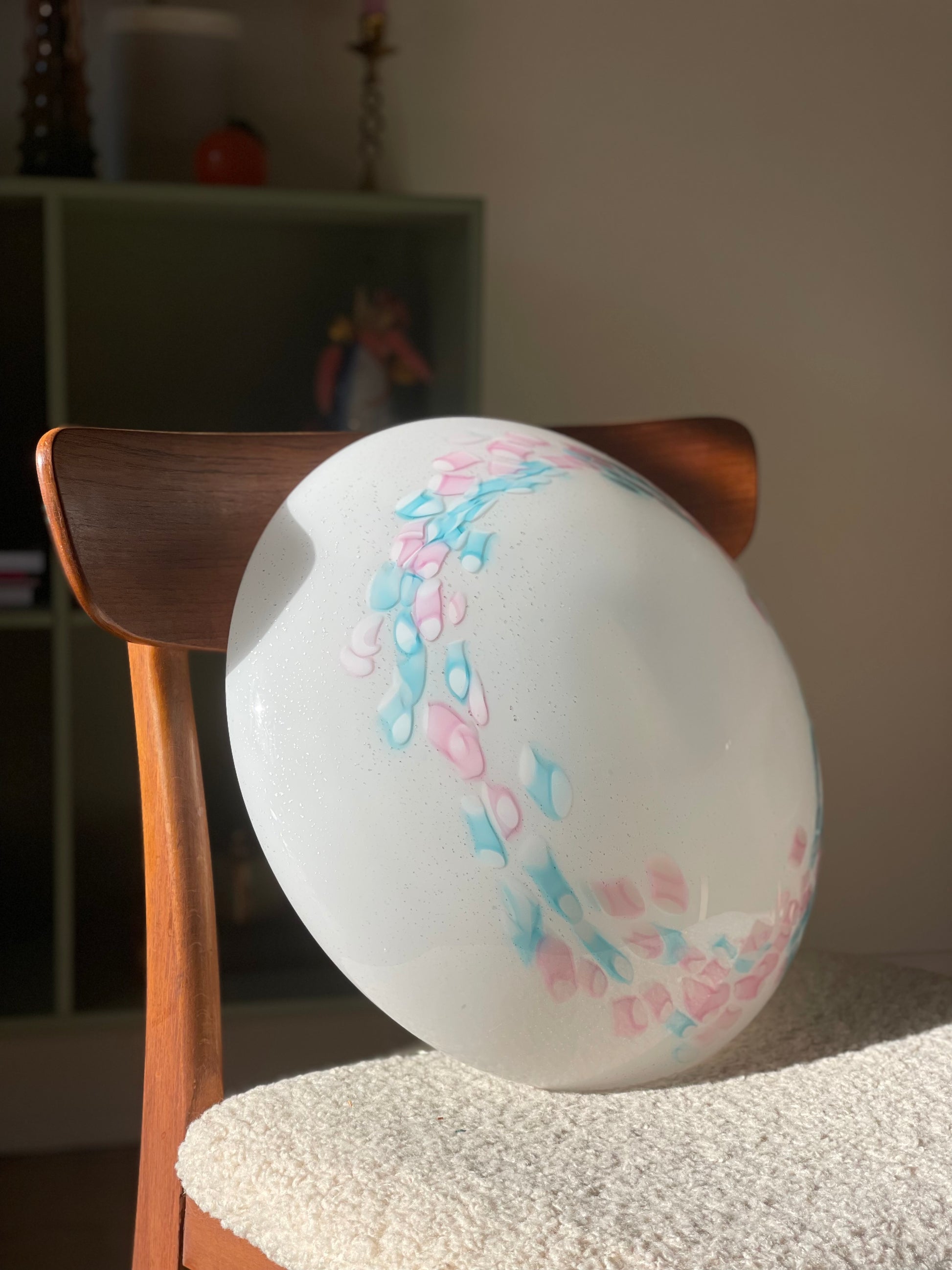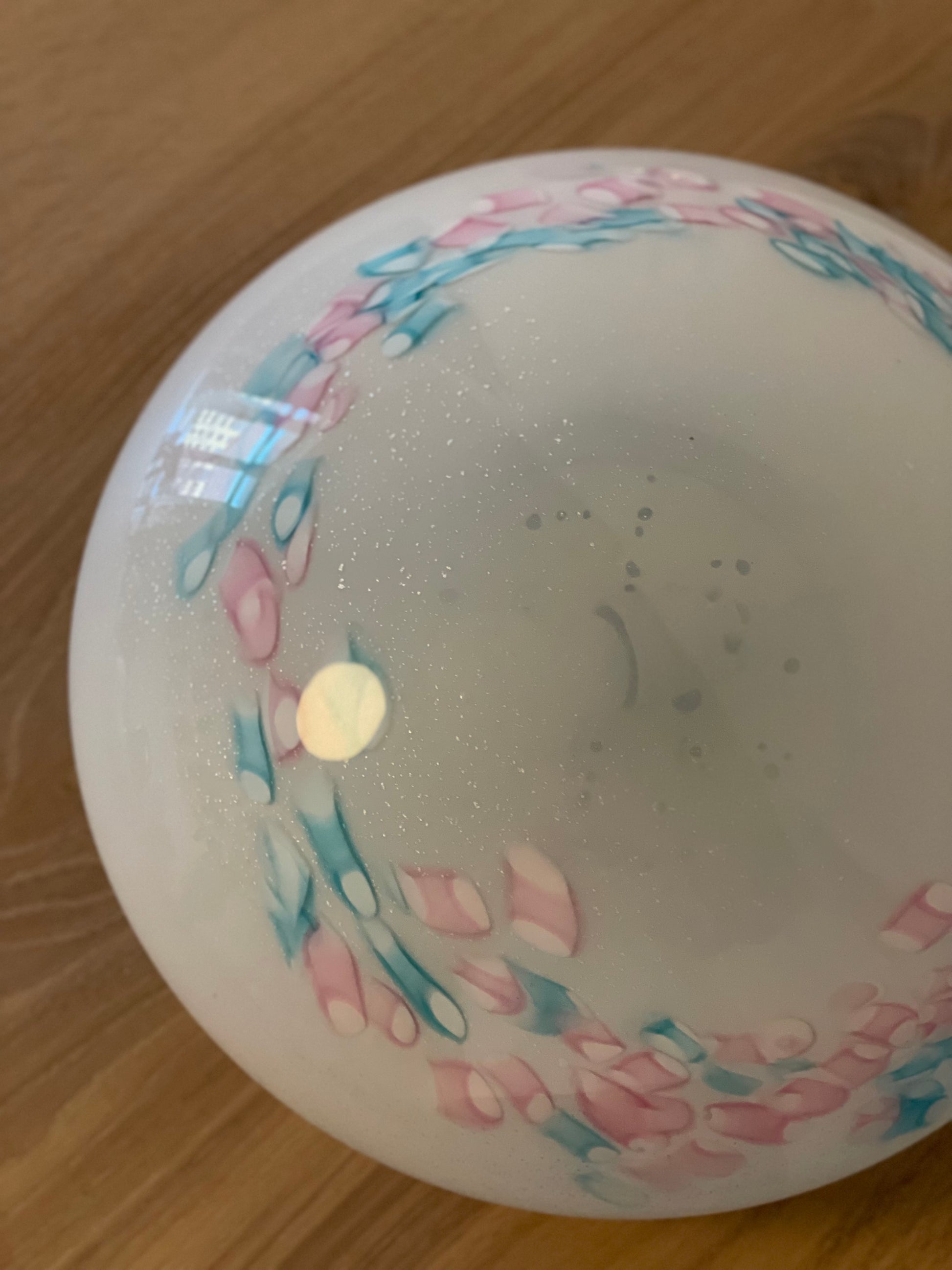 Plafond i hvidt vintage Murano glas med ægte sølv glimmer i glasset. Desuden har lampen lyserøde og lyseblå mønstring. Lampens glas er mere klart på midten, hvorfor pæren er synlig . Den måler 38cm i diameter, kommer med hvid base og bruger et styks e27 pære, Absolut charmerende!