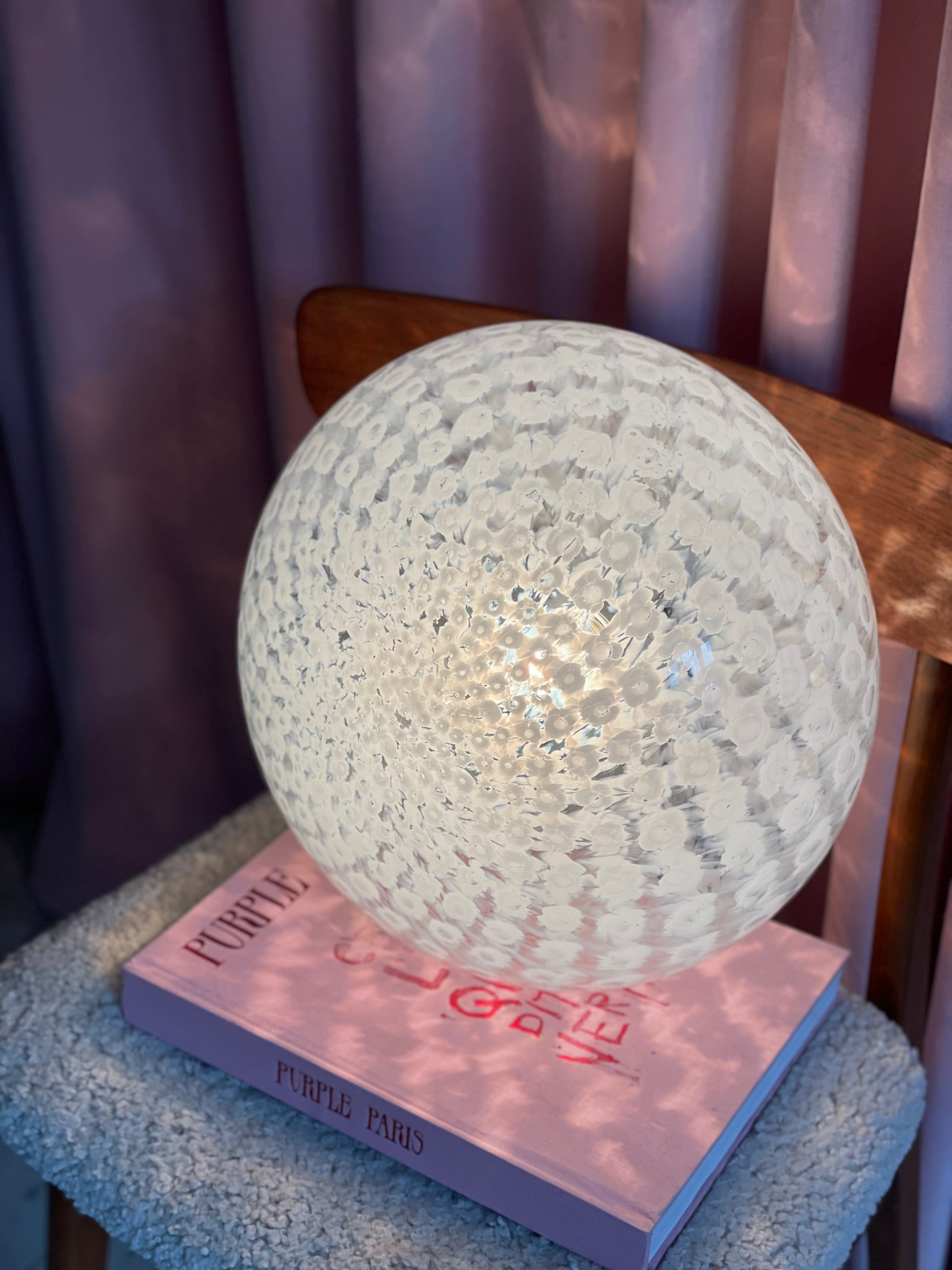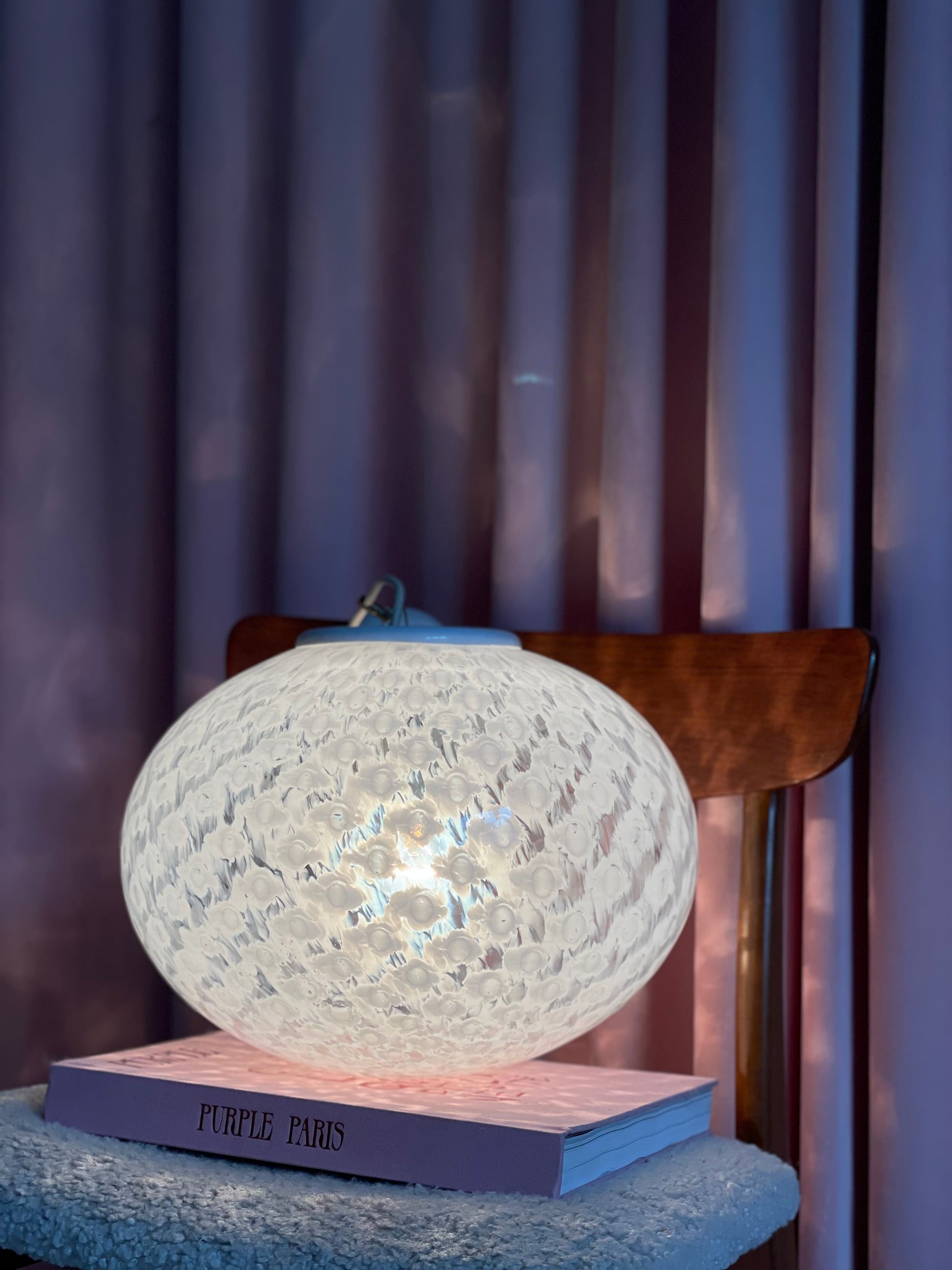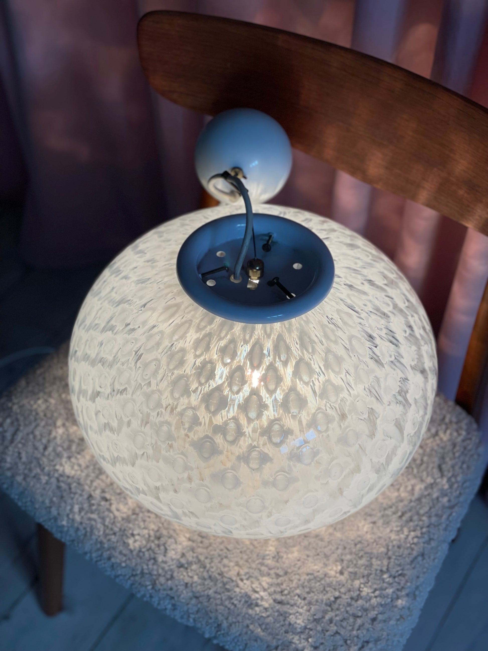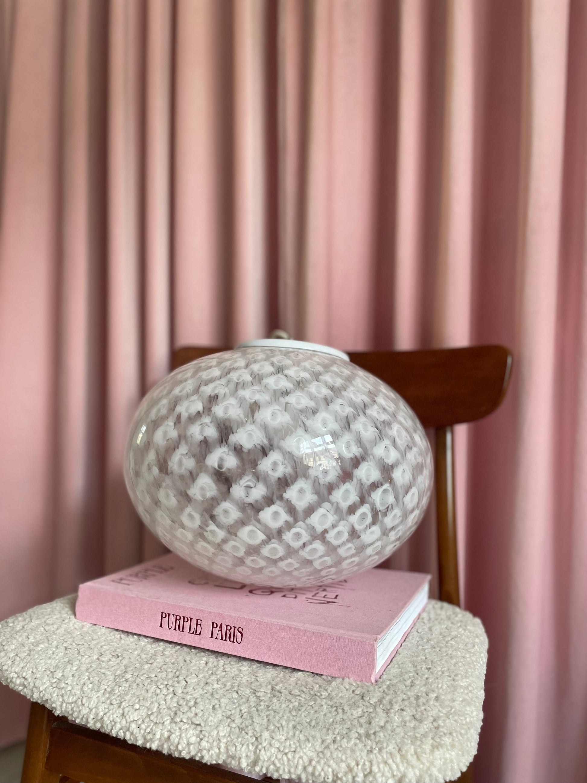 Smuk oval pendel på 35cm i spættet hvidt vintage Murano glas. I tændt tilstand kastes lyset ud på omkringværende flader.