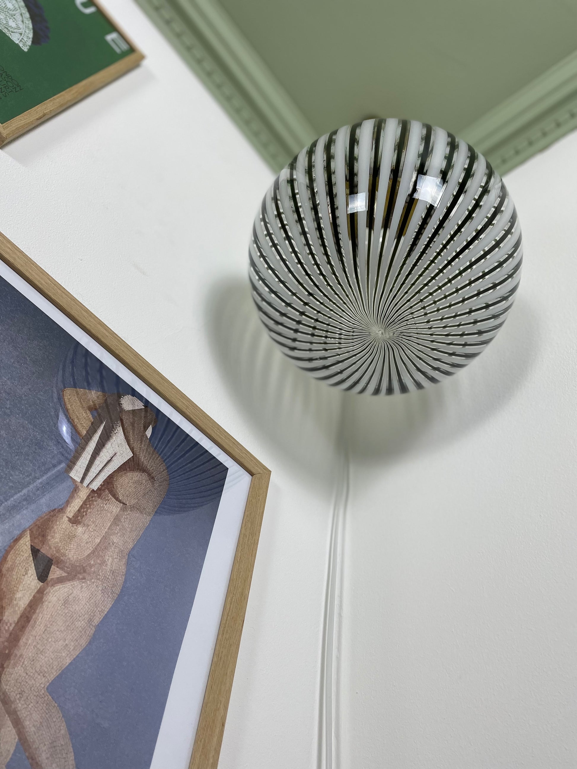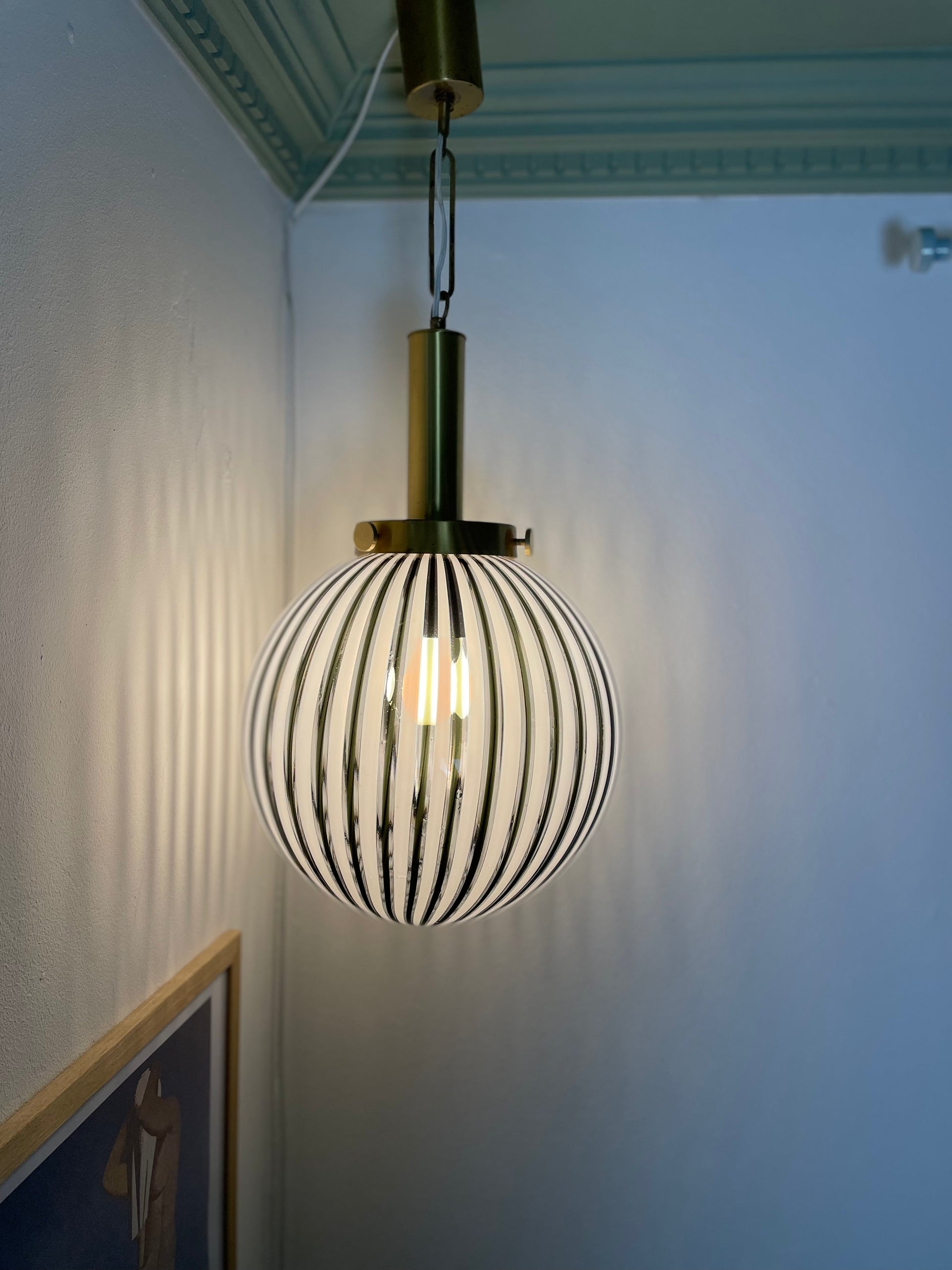 Eventyrligt smuk Murano pendel i hvide, sorte og klare striber. Selvfølgelig vintage! 30cm i diameter.