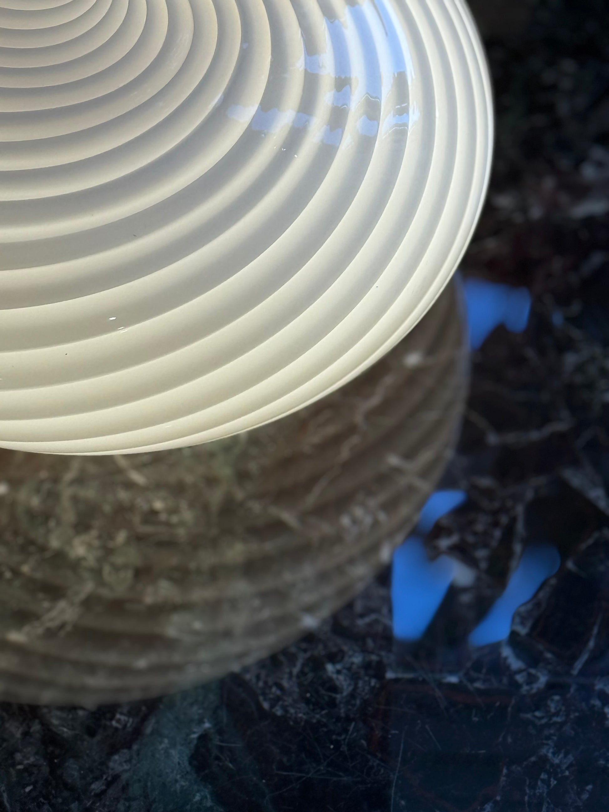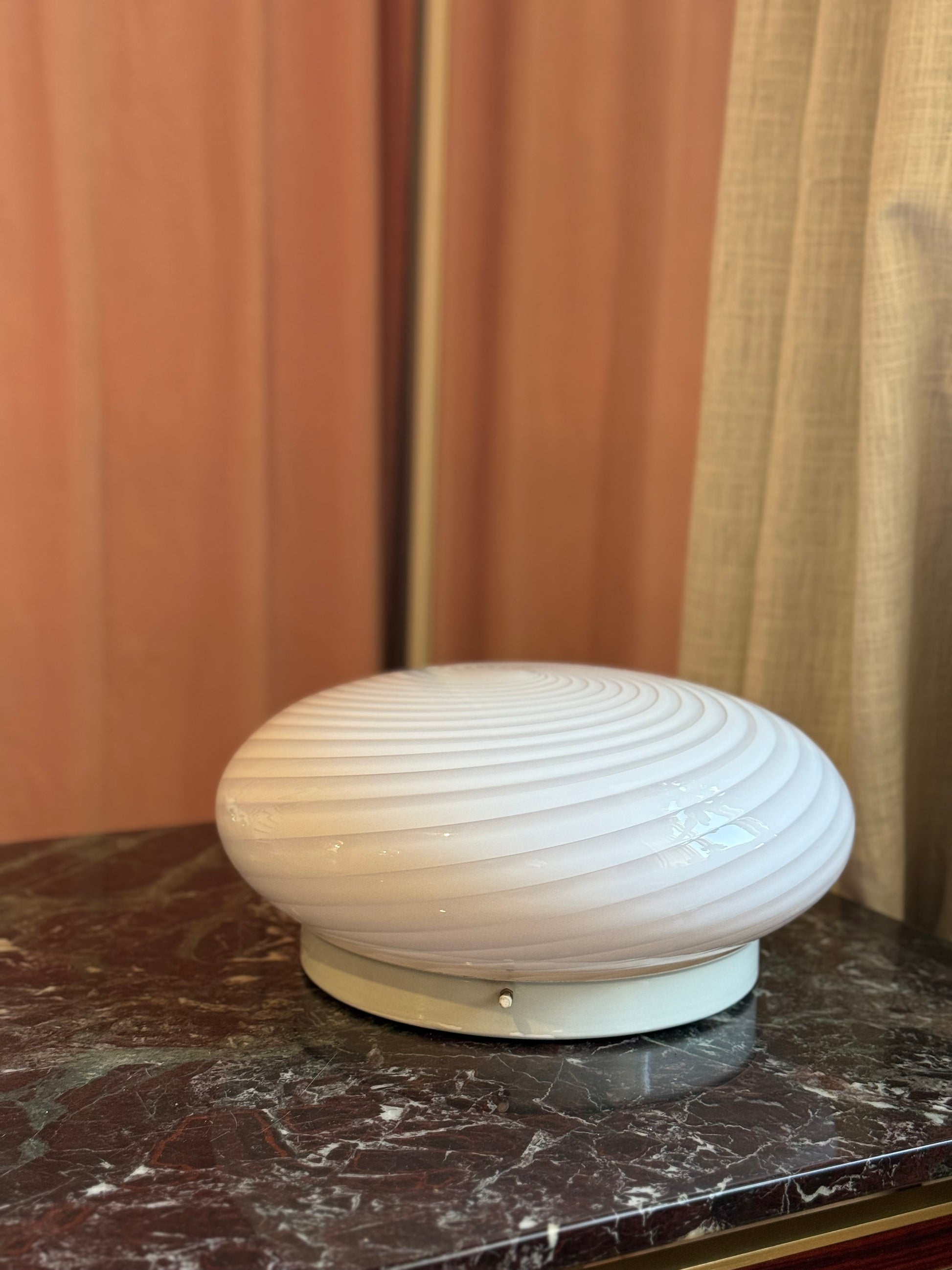 Smuk vintage Murano væglampe der måler 36cm i bredden og 17cm i højden. Lampen har et meget sart skær af lyserød i glasset, hvilket er med til at give den et varmt og hyggeligt lys. Lampen kommer med en enkelt E27 fatning og er monteret på en hvid base. Den står desuden i rigtig flot vintage stand.