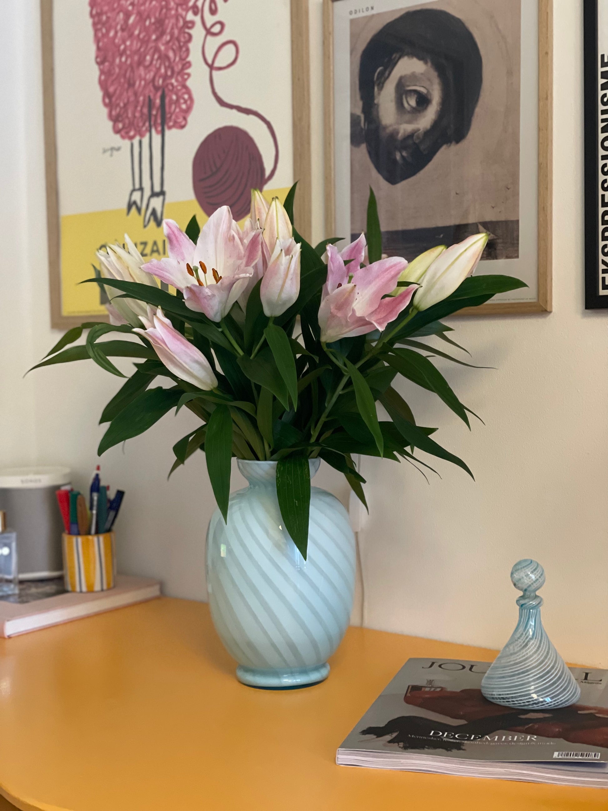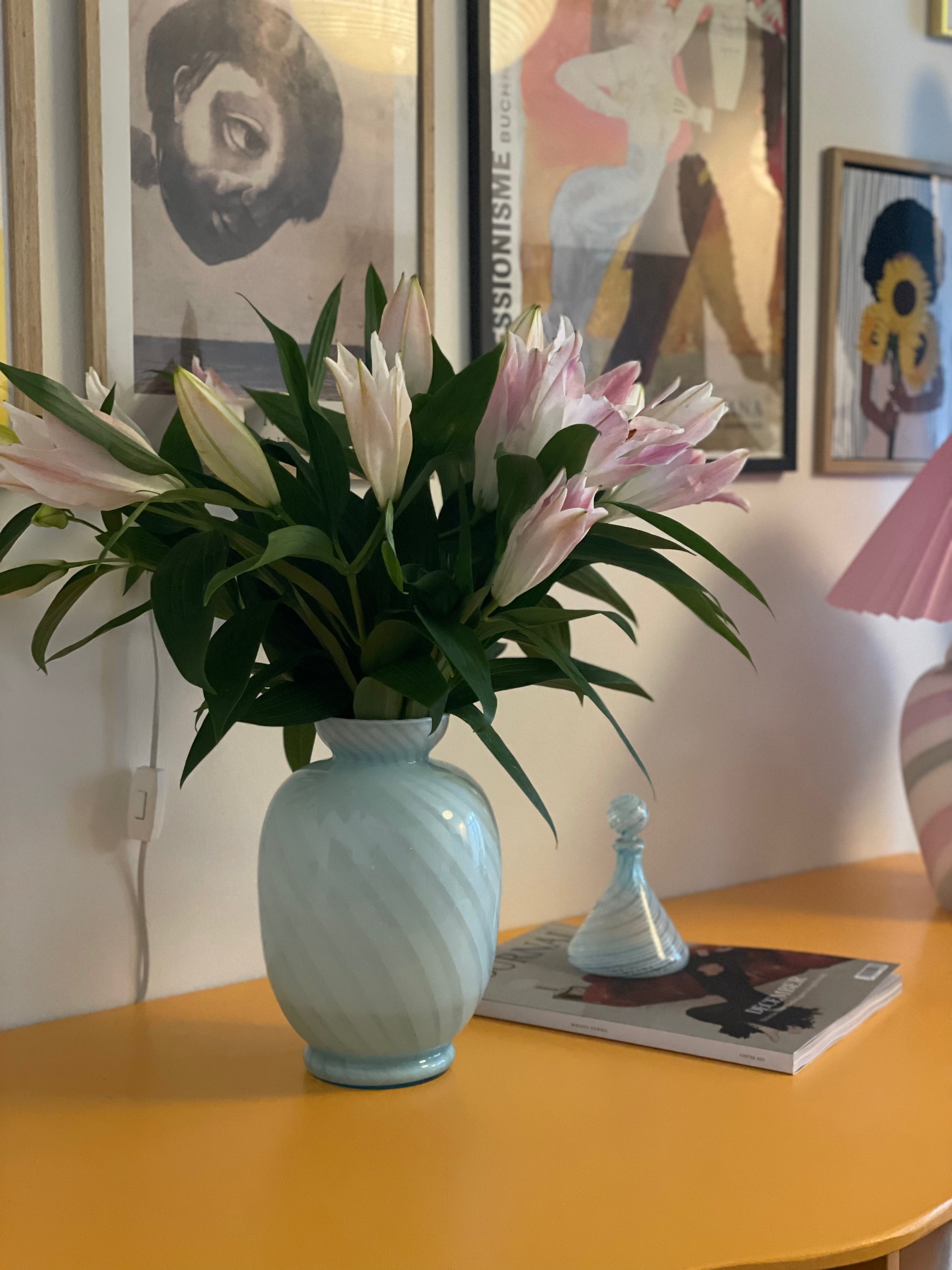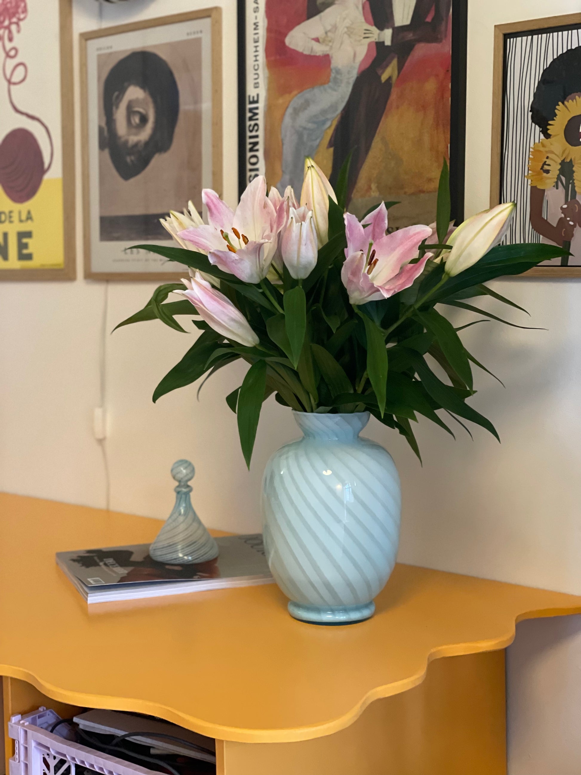 Lækker lyseblå vintage Murano vase med swirl i praktisk størrelse til de mest gængse buketter. Vasen måler 25,5cm i højden og 15,5cm i bredden og kommer med den smukke bølgekant som vi kender det fra Murano. Vasen står desuden i smuk vintage stand uden skår, revner eller større ridser.