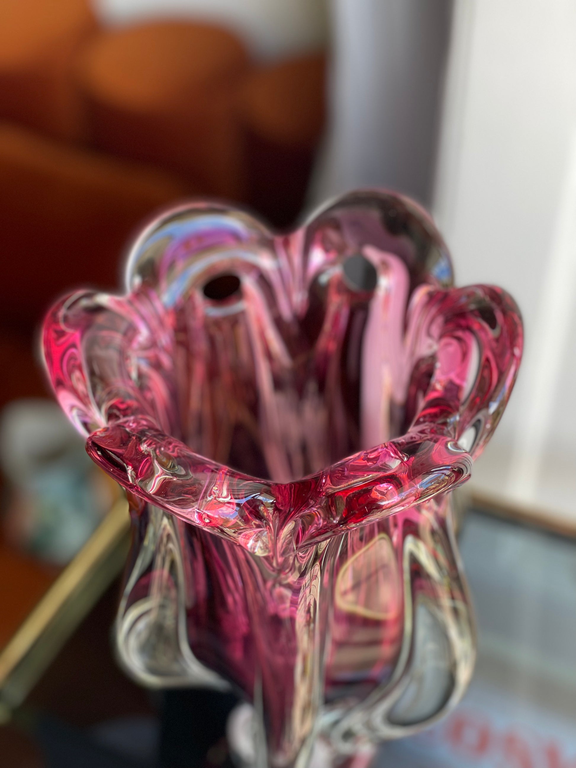 Smuk æstetisk, massiv og tung tjekkisk vase af Joseph Hospodka i flot pink farve. Vasen måler hele 27cm i højden og står på en smallere, men stabil fod af glas. Vasen er i rigtig fin stand.