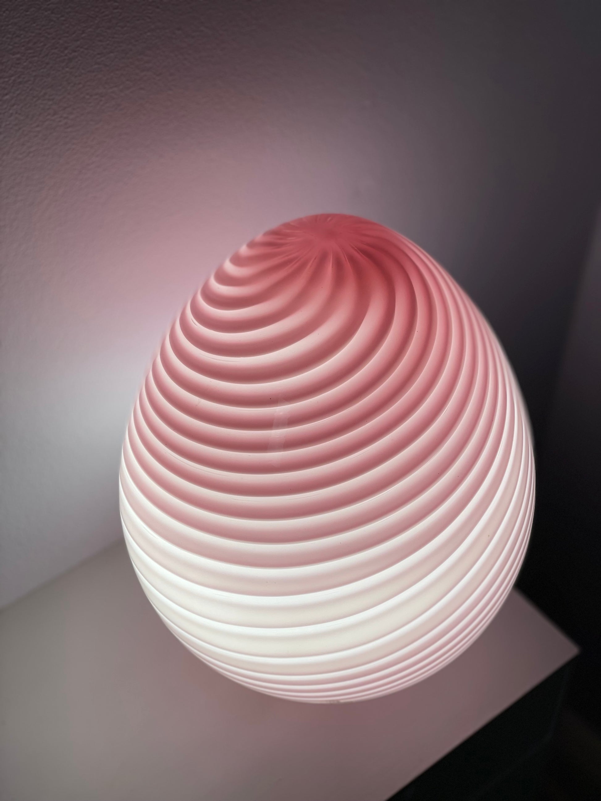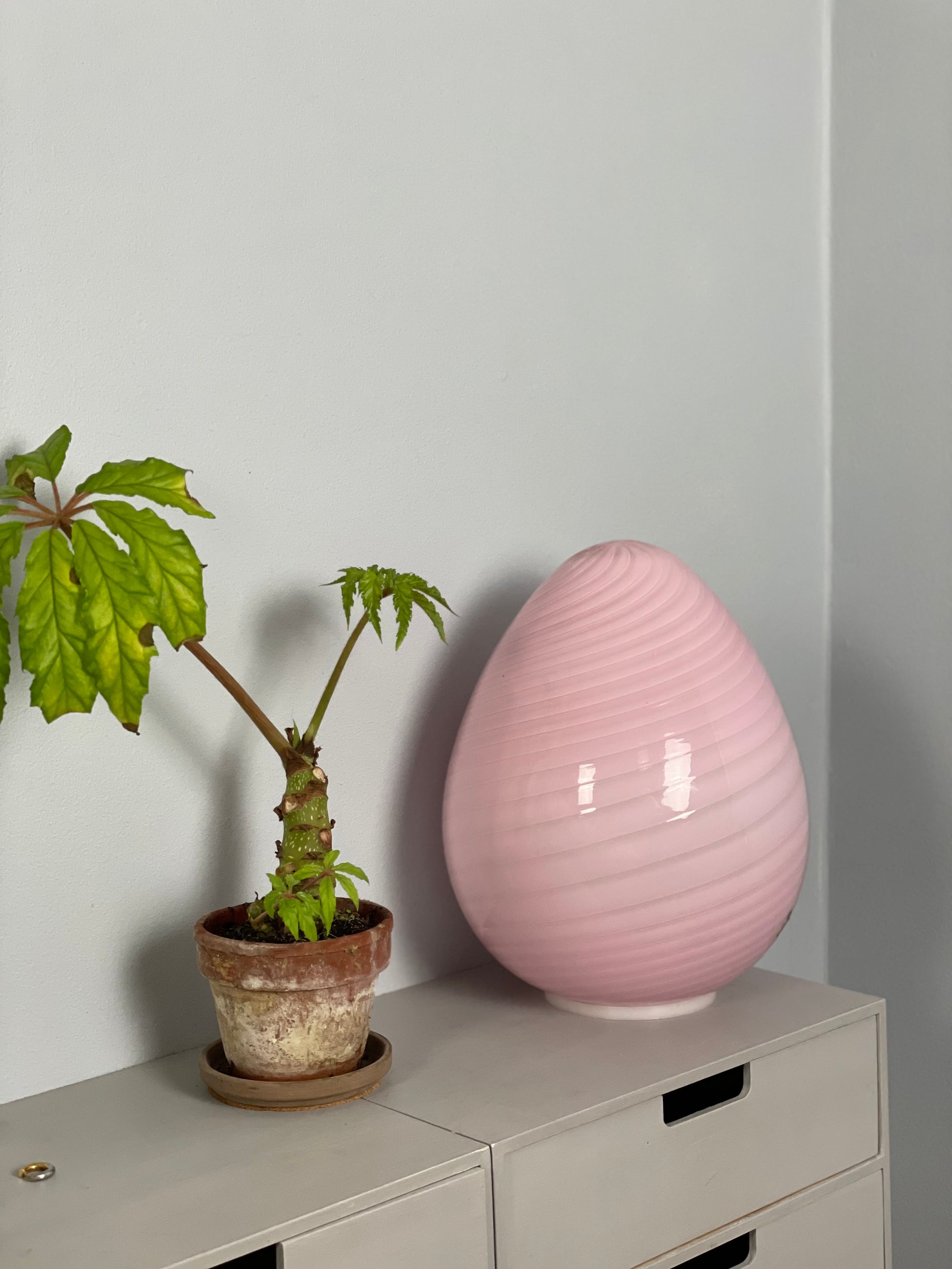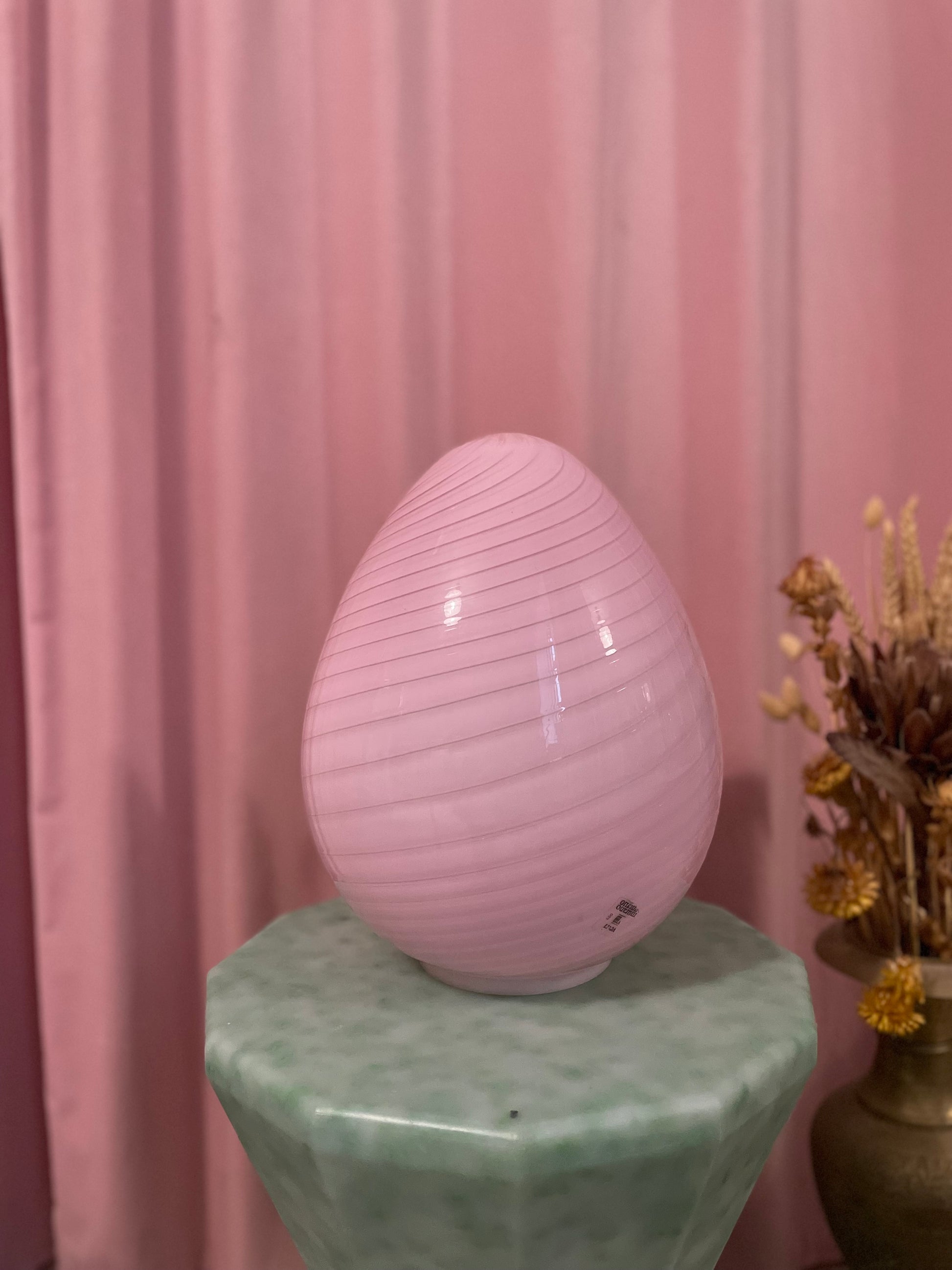 Uhyre sjældent lyserødt vintage Murano æg fra glaspusteriet Vetri, som er kendt for deres lag-på-lag teknik og den fine afslutning der her ses. Ægget her er i bubblegum pink glas, 33cm højt og 23cm bredt. Det bruger et styks e27 pære. Ledningen er indført i glasset på siden og monteret med en lille messingring, der lige giver prikken over i’et. Bordlampen kommer med originalt Vetri Murano klistermærke.