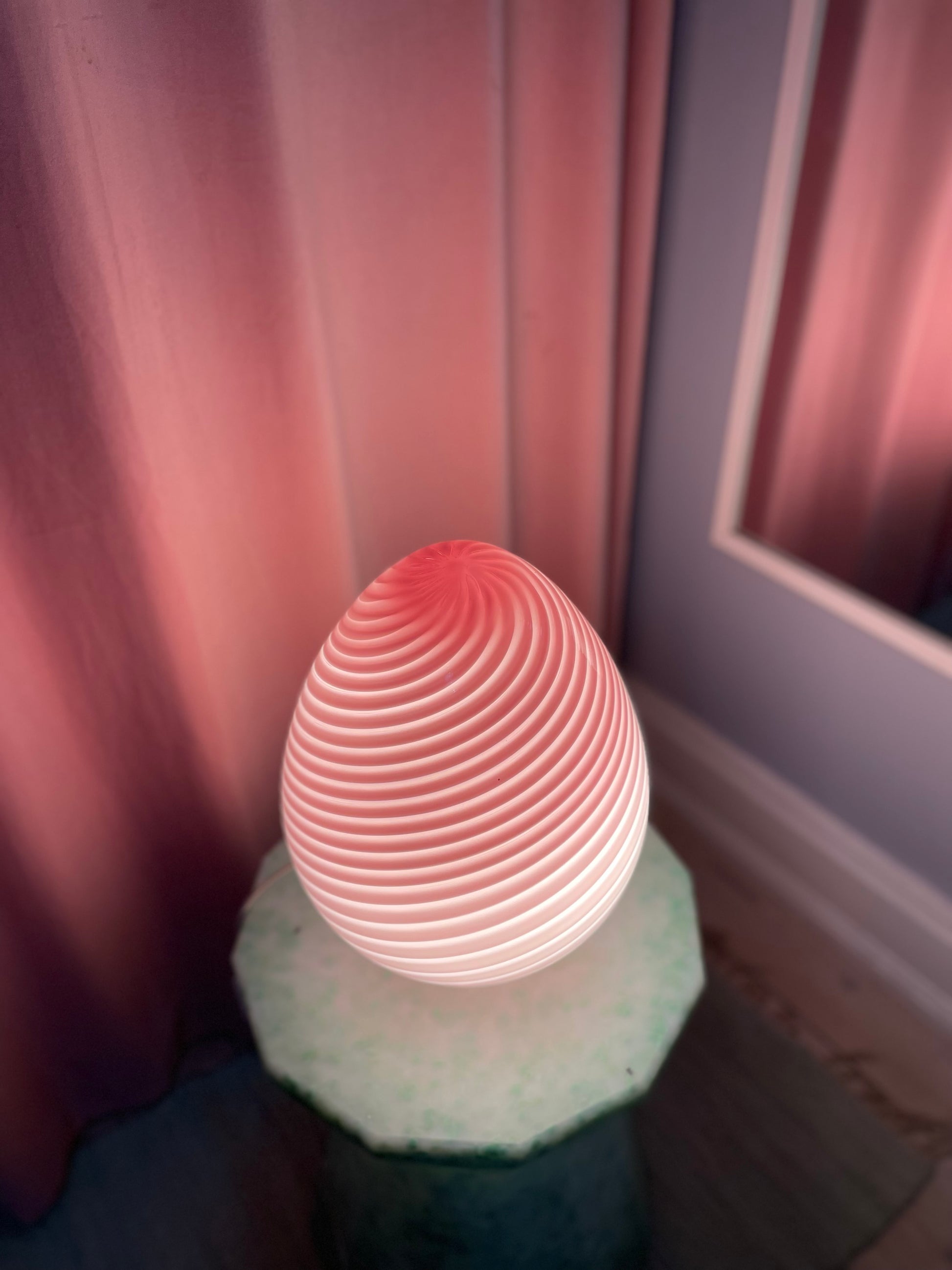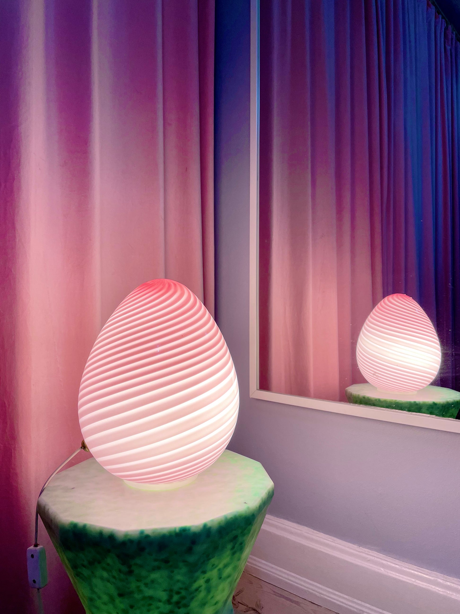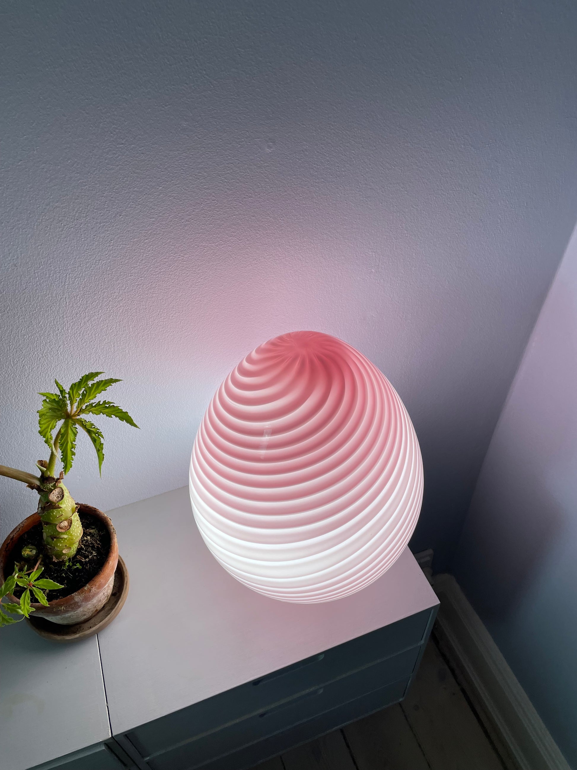 Uhyre sjældent lyserødt vintage Murano æg fra glaspusteriet Vetri, som er kendt for deres lag-på-lag teknik og den fine afslutning der her ses. Ægget her er i bubblegum pink glas, 33cm højt og 23cm bredt. Det bruger et styks e27 pære. Ledningen er indført i glasset på siden og monteret med en lille messingring, der lige giver prikken over i’et. Bordlampen kommer med originalt Vetri Murano klistermærke.